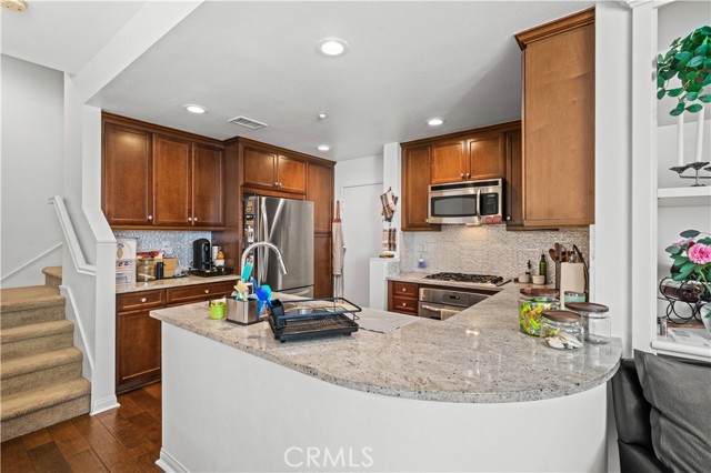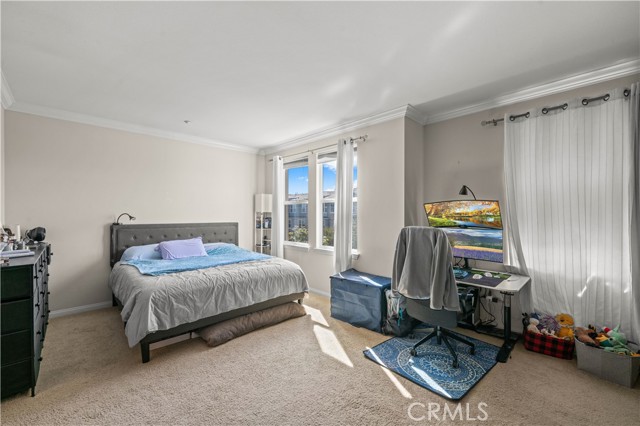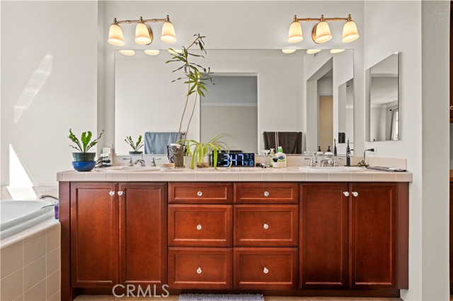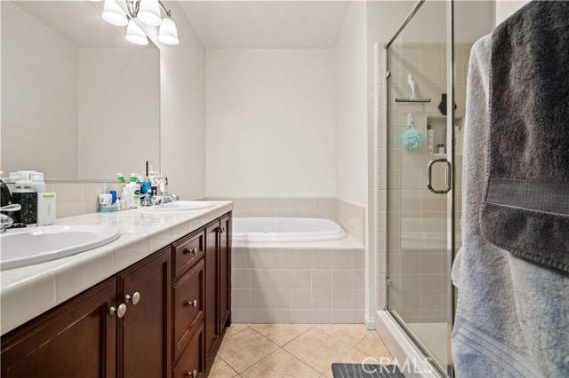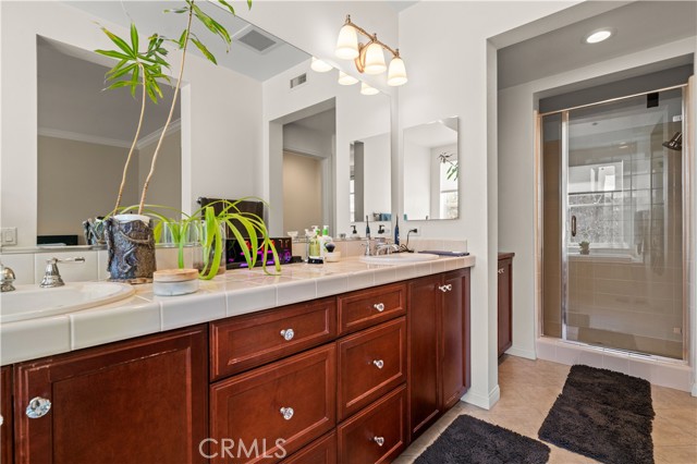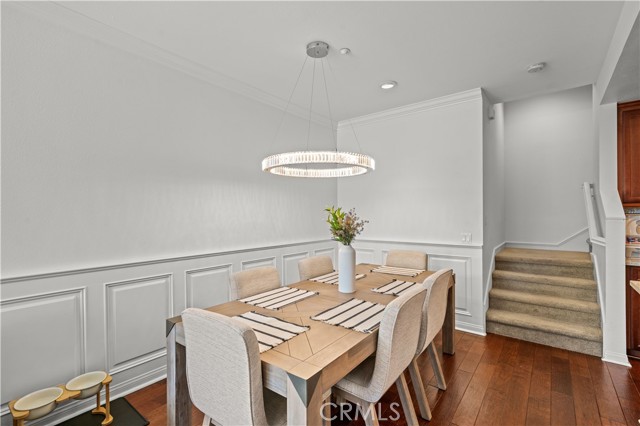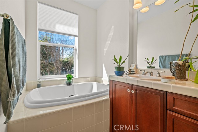 This bright and airy townhome is situated in the beautiful Vantis Community of Aliso Viejo. With tasteful upgrades, this home offers a 1,638 sq ft floorplan featuring 2 master suites, 2.5 bathrooms, and extra-long 2-car tandem garage. From the front porch, you’ll enter the spacious ground floor living and dining room. This area has been thoughtfully upgraded with a custom media niche, a gas-burning fireplace, hardwood flooring, a crystal chandelier, crown molding, and wainscoting. In this open floorplan, adjacent to the living area, the gourmet-style kitchen awaits. It’s a chef’s delight, boasting abundant counter space, ample cabinet storage, stainless steel appliances, and a designer granite and glass backsplash. Privacy is paramount, and this townhome delivers. The two master suites are located on separate floors. Each suite features large walk-in closets, dual vanity sinks, deep soaking tubs, and glass-enclosed showers. Enjoy your morning coffee or unwind at day’s end on the large front porch. Right around the corner is an expansive greenbelt with panoramic view of the mountains and valley below. Guest parking is just across from the front patio. Residents of this community have access to an association pool and spa, a private gym, outdoor fireplaces, BBQs and a clubhouse. The townhome is conveniently located near the 73 Toll Way and is just a short walk to the Town Center, where you’ll find an Edwards movie theater, shopping options, and a variety of restaurants. This delightful townhome offers both comfort and convenience - a perfect place to call home!
