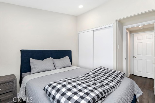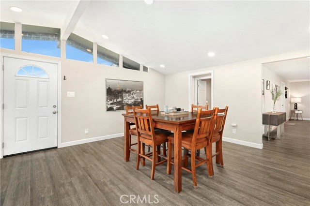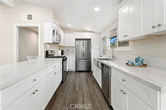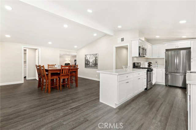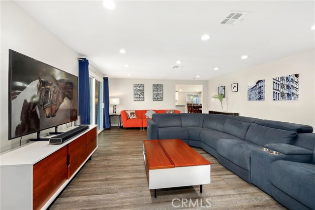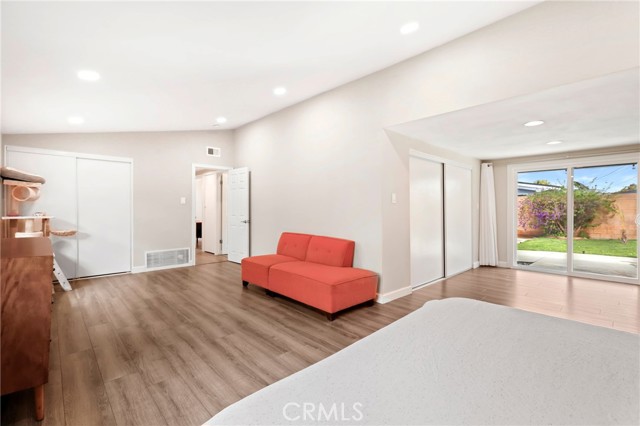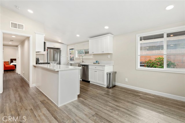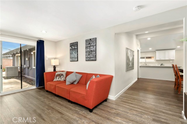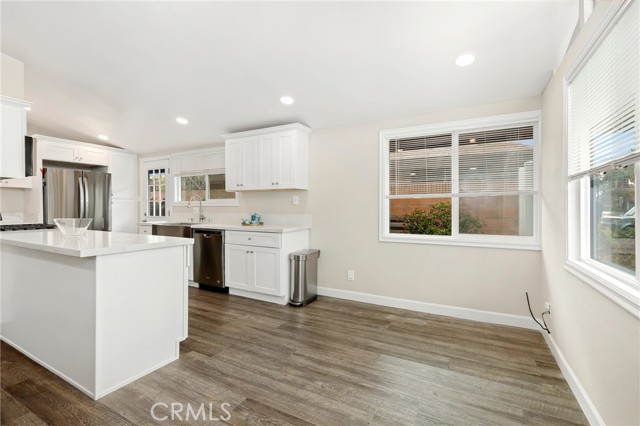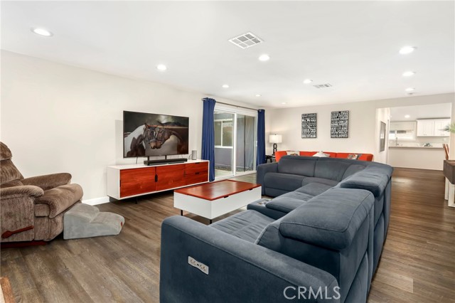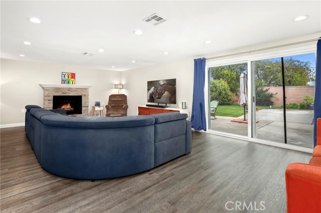 Beautiful Mid-Century remodeled single level, 4-bedroom home features neutral modern and white tones, LED recessed lighting, larger baseboards and upgraded Luxury Vinyl Plank flooring makes for an elegant space. The kitchen impresses with white cabinetry, ice white Quartz countertops, farm-style sink, plenty of storage and an adjacent dining area. The Stainless-Steel appliances include a gas range, single oven, microwave, dishwasher and refrigerator. The large windows allow an abundance of natural light to illuminate the open floor plan throughout. The spacious family room boasts a beautiful stack-stone fireplace with a high mantel, direct access to the garage and a large slider to the backyard. The first primary room features a closet, three-quarter bathroom single sink, Quartz countertop and step in shower with floor to ceiling tile. The second primary bedroom is very spacious with a large suite area perfect for a home office, exercise room or nursery. The additional secondary bedrooms have recessed lighting, closet doors and blinds, one rooms has a skylight. Down the hall is a large linen closet, a full bathroom with a double sink vanity, Quartz countertops, shower in tub with tile and ribbon banner insert. Relax in the backyard with an open patio, grass area, plethora of succulents , side yards and block walls. Front yard features a small porch, grass, a two-car garage with newer water heater, includes washer and dryer, epoxy floors and EV outlet. NEW roof, upgraded AC and Heating system, dual pane windows and Nest Thermostat. Nearby Anaheim Plaza, shopping, restaurants, schools, parks and easy access to 57, 5 and 91 freeways. No HOA. Welcome home!
