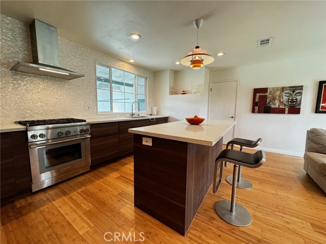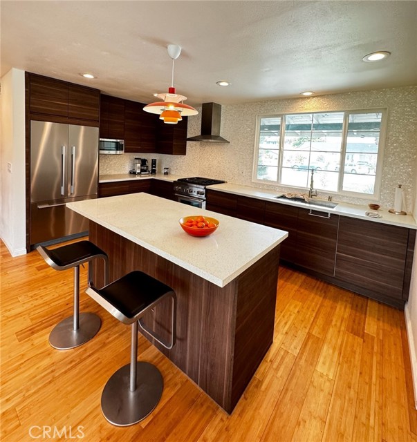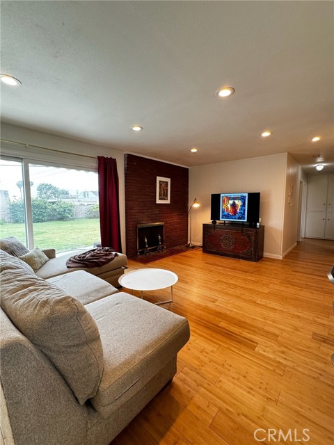 Stunning single-story residence situated in the esteemed "Cinderella Estates" neighborhood in picturesque West Anaheim. This charming ranch-style abode offers 4 bedrooms and 2 bathrooms, spanning 1,340 square feet of living space on a generous 8,970 square foot lot. Recently remodeled entryway, kitchen, and bathrooms within the last 2 years showcase high-quality finishes, including upscale appliances such as a built-in Fisher & Paykel refrigerator, complemented by sleek minimalist European-style cabinets throughout, adorned with mother of pearl wall tile, and enhanced by a custom dishwasher panel. The luminous interior features an airy open floor plan, accentuated by brand-new bamboo flooring throughout. Additionally, original hardwood flooring graces the bedrooms. The inviting living room is graced by a classic brick fireplace. Central air conditioning and forced air heating ensure year-round comfort. The expansive backyard is enclosed by a block wall and hosts flourishing avocado, loquat and banana trees. The front yard also features a delightful pomegranate tree, adding a touch of natural beauty to the charming curb appeal of this exceptional home. A two-car garage with direct access and convenient indoor laundry add to the practicality of this home. Impeccably maintained and thoughtfully updated, this property retains its timeless mid-century allure while offering modern comforts. Step inside, and you'll instantly envision making it your own.