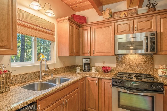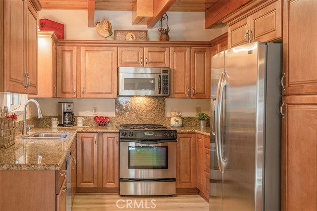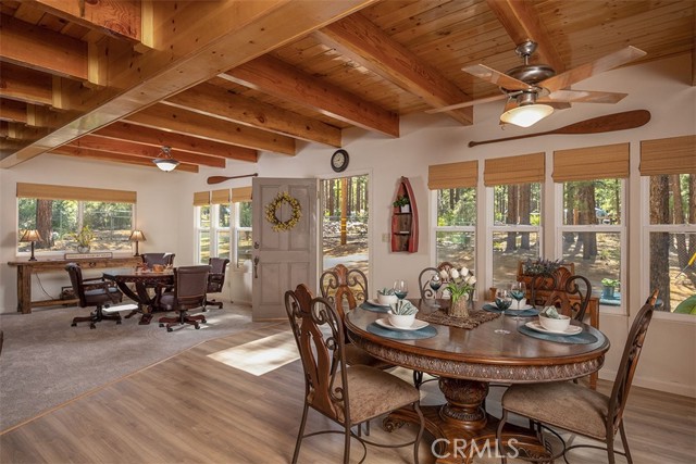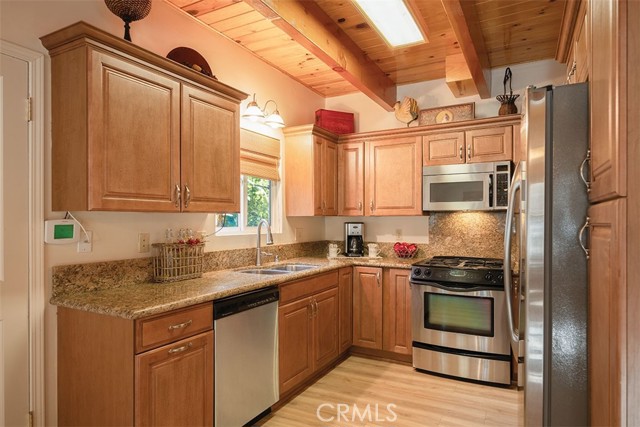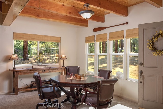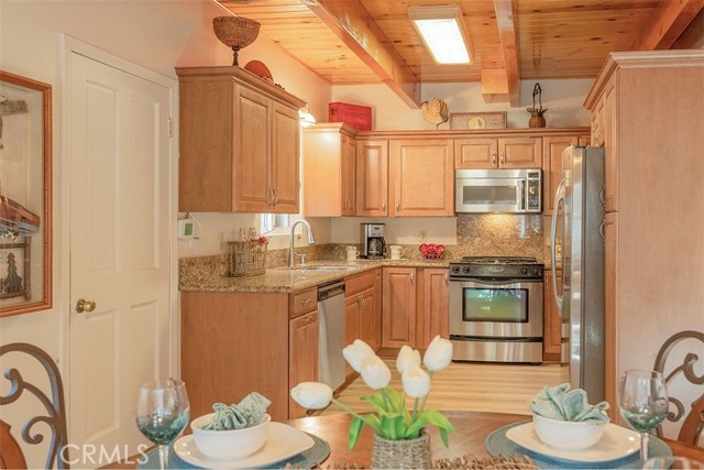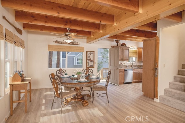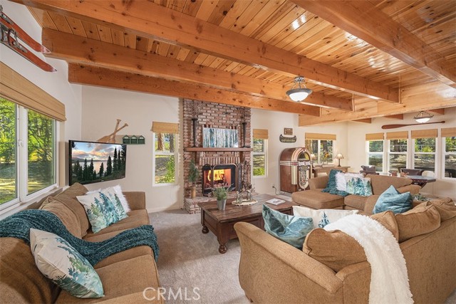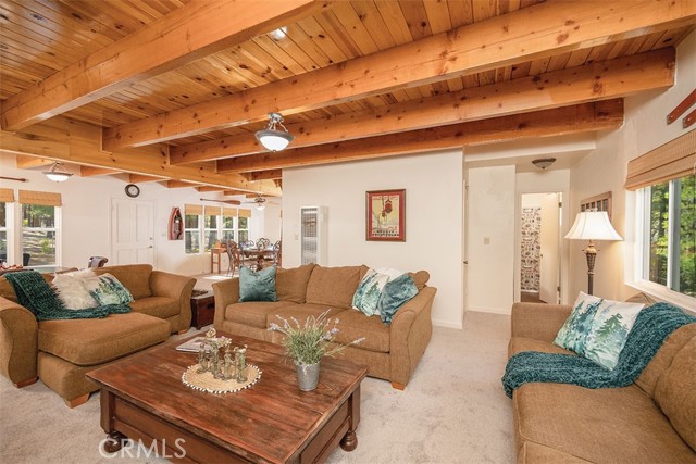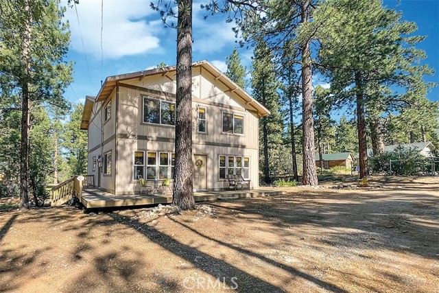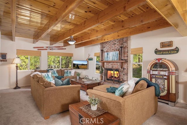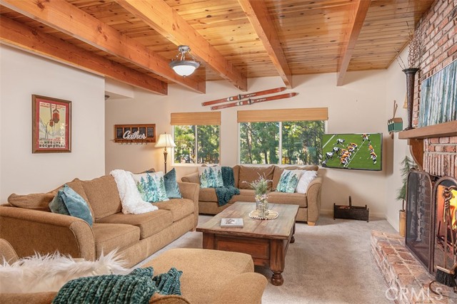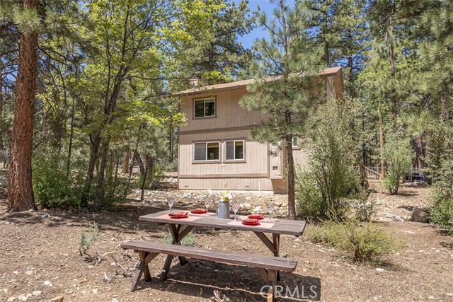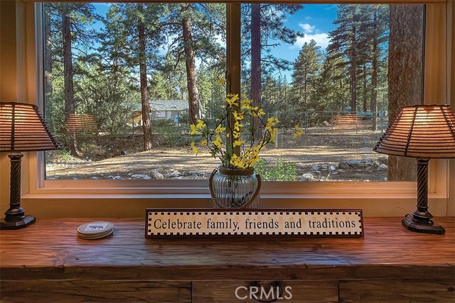 Your mountain dream awaits! Experience this special home nestled in a wonderful & tranquil treed setting boasting national forest access for hiking or adventure just up the road! Beautiful wood-beamed ceilings grace this homes huge "Great Room" with so many dual-pane windows delivering exquisite natural light and inviting the beauty of the outdoors...inside. The dramatic brick wood-burning fireplace makes a beautiful focal point and the open floorplan, updated kitchen with granite slab counters and stainless-steel appliances provide a wonderful balance of space & comfort. This is a home that provides room to gather with friends or family with a large dining room and a fantastic game table area with space for a pool table if desired. There are 4 bedrooms (1 has no closet) 2.5 bathrooms and laundry with a washer & dryer included The home sits on a 6700 sq ft lot and delivers fantastic indoor & outdoor living space with a nice front deck overlooking a stunning expanse of trees providing a wondrous spot to enjoy the sights and sounds of nature in a special way. There is a scenic seasonal stream at the rear of the home and a nice yard area beyond waiting for you to add your personal preferences to make it your own! Convenient to Hwy 38, Big Bear's only high school, our beloved national forest and The Sports Ranch park with a dog park, playground & pickle ball. Whether you are looking for a peaceful retreat or a full-time home in a special setting, 1194 Pinon Lane delivers a fantastic opportunity!