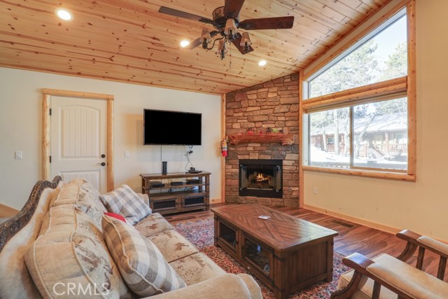 Welcome to this stunning mountain cabin nestled in the upper Moonridge area! With a vaulted knotty pine wood plank ceiling adorned with recessed lighting, this home exudes charm and warmth. The open kitchen, living, and dining spaces create a welcoming atmosphere, anchored by a rock-framed fireplace in the living room. A sliding door from the dining area leads to the deck, providing a perfect spot to enjoy the mountain surroundings. The kitchen features granite counters, stainless steel appliances, and raw edge wood bar seating, adding a touch of rustic elegance. Wood laminate flooring throughout adds to the cabin's cozy appeal, while a laundry closet in the hallway provides convenience. With 3 spacious bedrooms and 2 bathrooms, this cabin offers comfortable living spaces. The primary bedroom boasts a sliding door leading outside to the deck, and the ensuite primary bathroom features dual copper sinks and a coordinating tiled bathtub/shower surround. Upstairs from the living room is a generously sized loft space perfect for a game room! Located just minutes from ski slopes, the lake, shopping, and restaurants, this mountain retreat is the ideal getaway. Embrace the beauty of mountain living in this charming cabin!