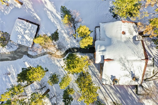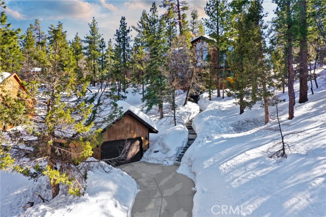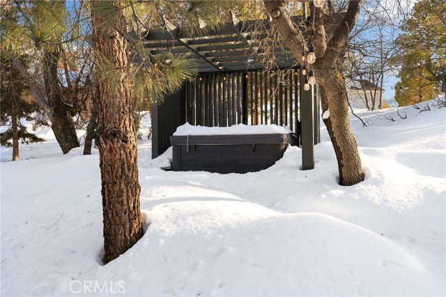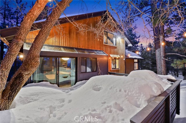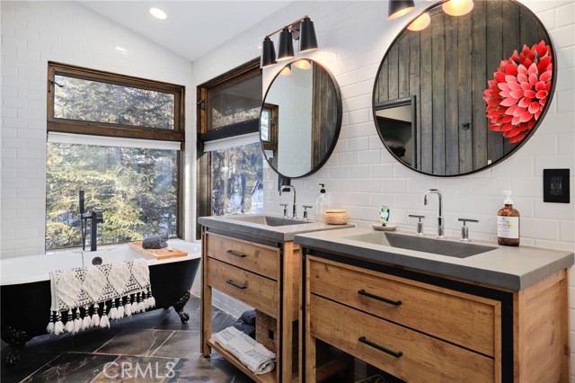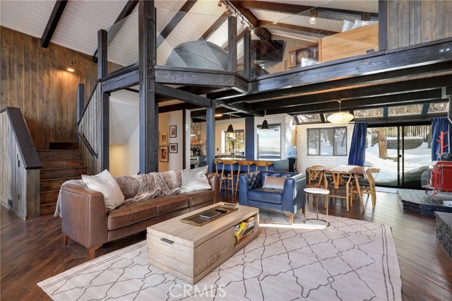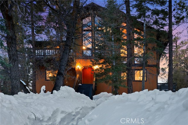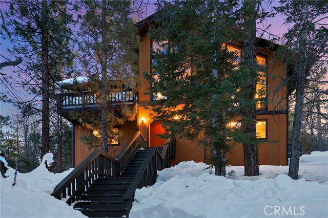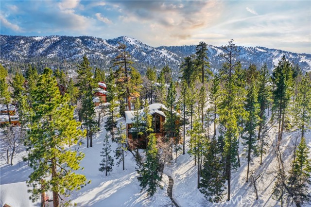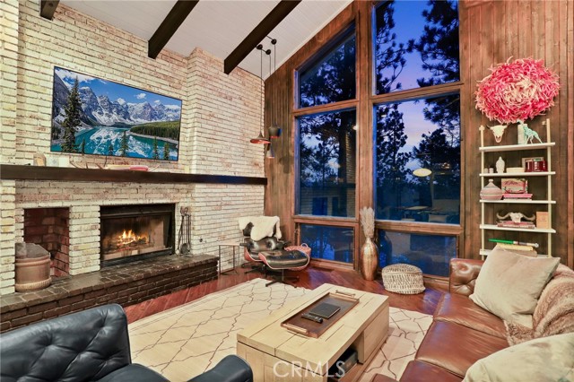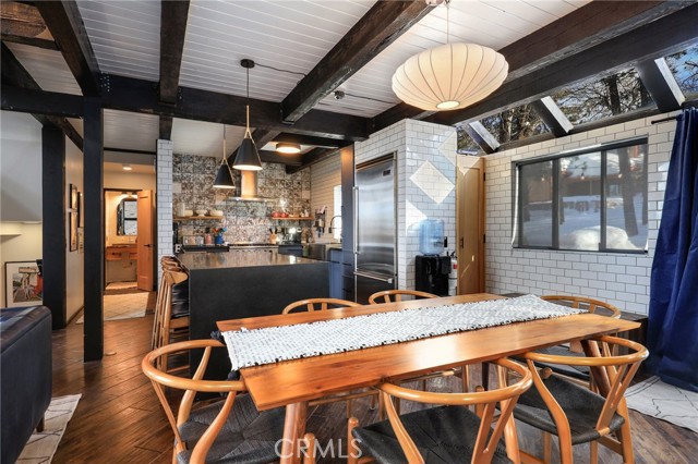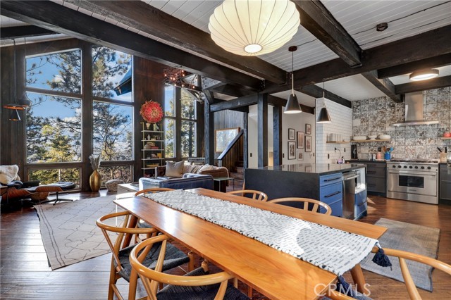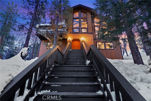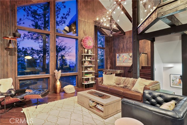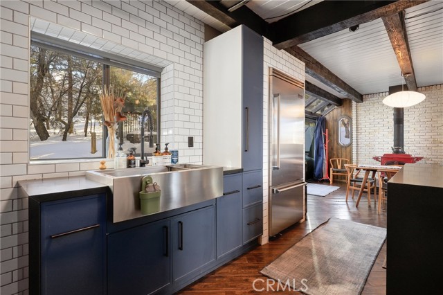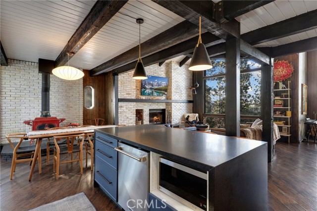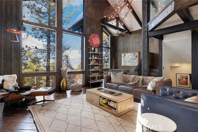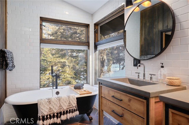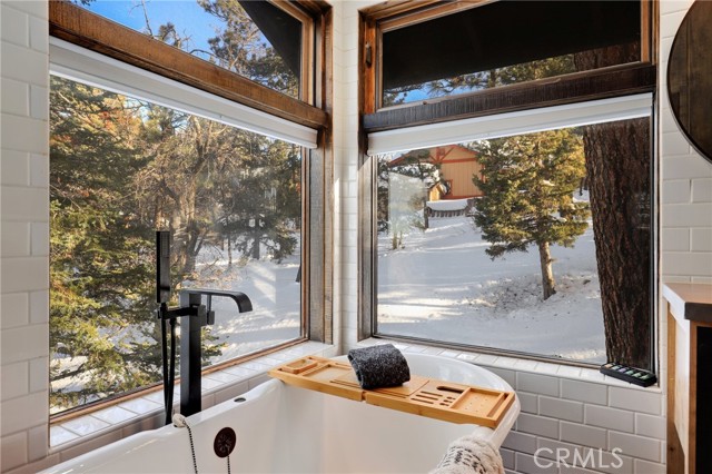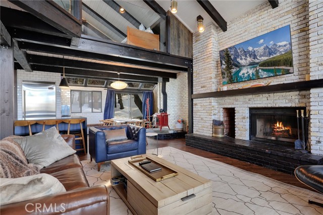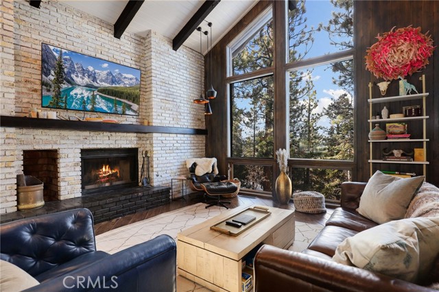 Magnificent modernized escape in the woods! Surrounded by tall pine trees this designer styled updated cabin boasts gorgeous floor to ceiling windows to admire the views from the whole second floor and drench the space in natural light. Cozy up around the grand fireplace that has a raised hearth and floor to ceiling brick framework. Add extra warmth or boil a kettle on the wood burning stove in the dining area. Engineered wood flooring throughout with tile in the bathrooms. The Chef's kitchen has been updated with subway tiled backsplash, extra large stainless steel fridge, waterfall island with bar seating, a six burner stove stove with range hood, a stainless utility sink and gorgeous smoky blue toned cabinetry with lots of storage drawers. At the end of the hall is a powder room and then the primary suite. The spacious primary suite has a sliding glass door leading outside and a dual sided closet leads to the dreamy bathroom with tiled walls, a freestanding tub surrounded by windows facing the outdoors, dual vanities, and a separate stand up glass shower. On the first level there is an entry way space, the laundry room, two bedrooms and a common bathroom. Head up to the third level offering a versatile loft space which is smartly designed with a glass railing to not obscure the views. Relax in any weather in the covered hot tub steps away from the home. There's a two-car detached garage. Enjoy convenience near the year round adventurous activities that Big Bear has to offer including hiking trails, ski resorts, Big Bear Lake, with markets, shopping and dining options. Come see this amazing home now!