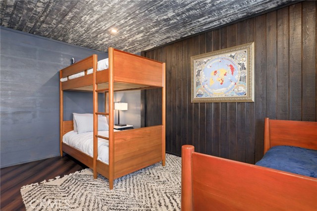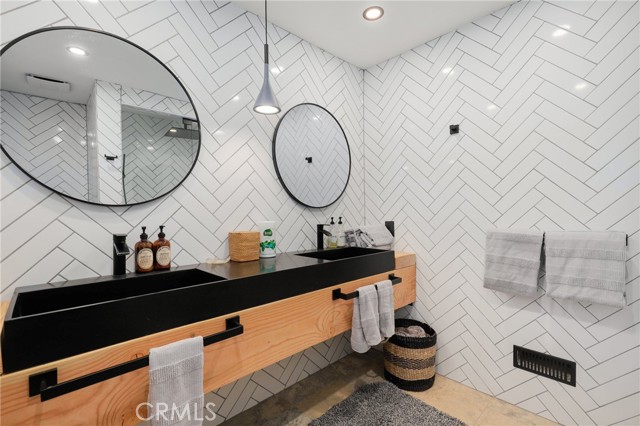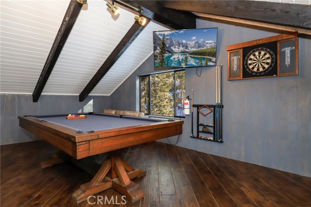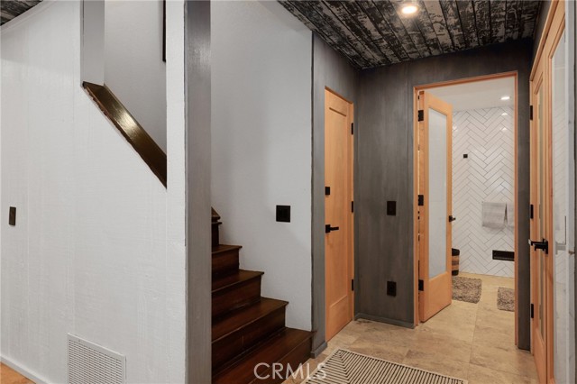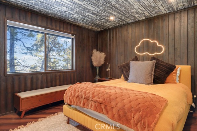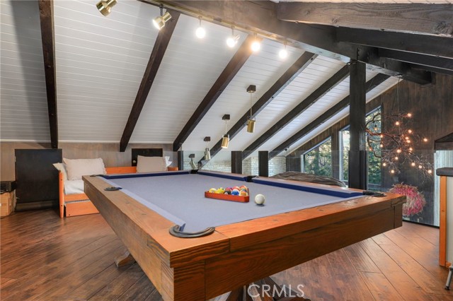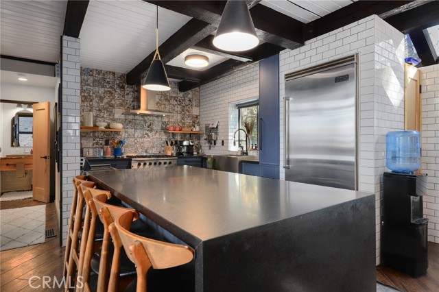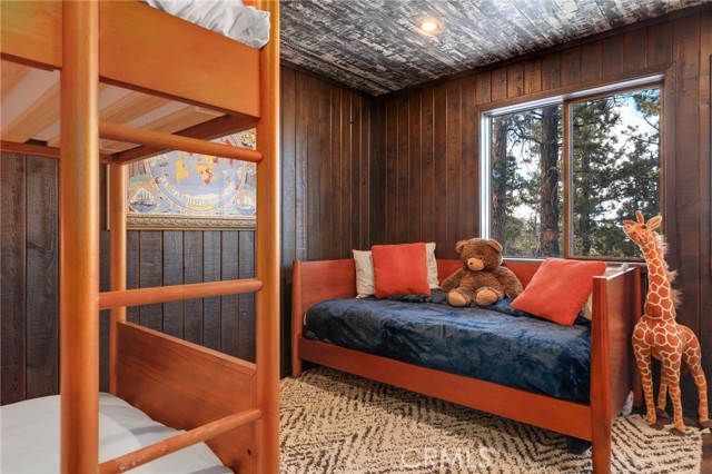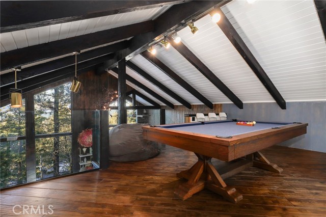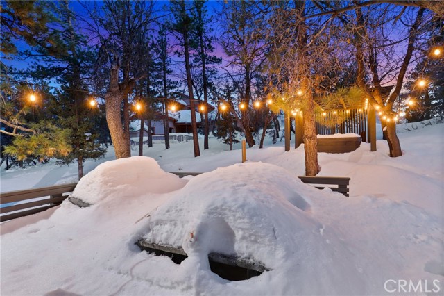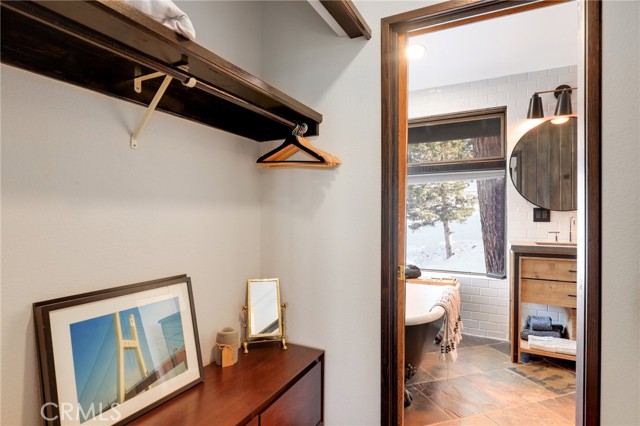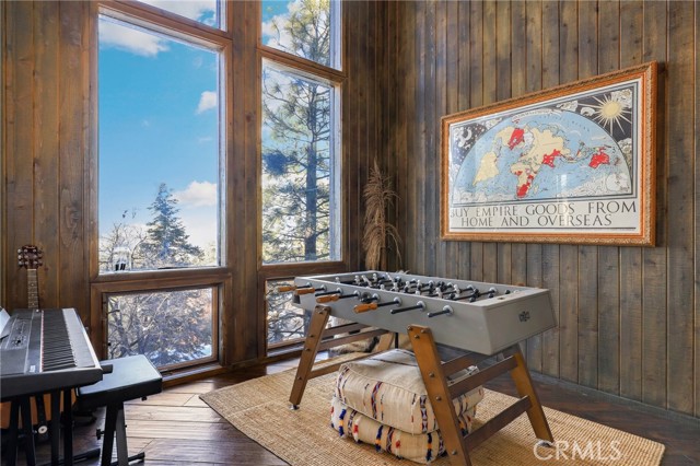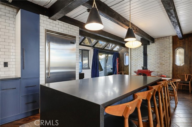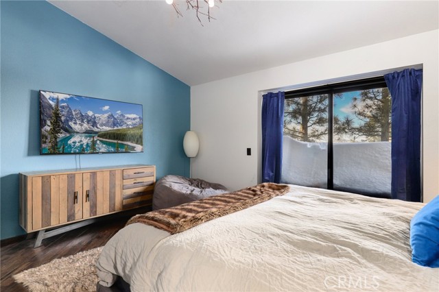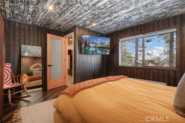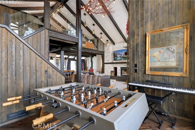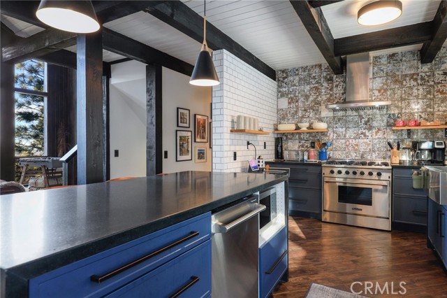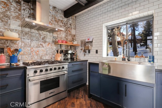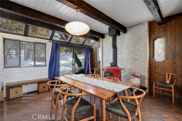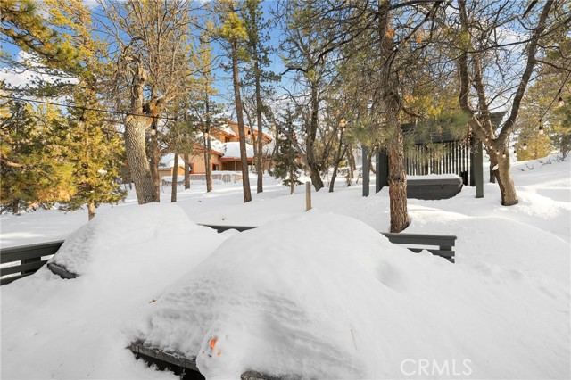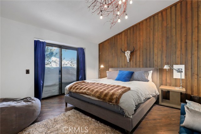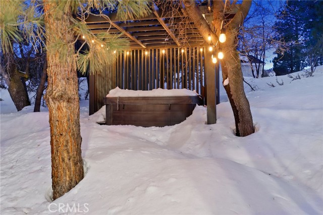 Magnificent modernized escape in the woods! Surrounded by tall pine trees this designer styled updated cabin boasts gorgeous floor to ceiling windows to admire the views from the whole second floor and drench the space in natural light. Cozy up around the grand fireplace that has a raised hearth and floor to ceiling brick framework. Add extra warmth or boil a kettle on the wood burning stove in the dining area. Engineered wood flooring throughout with tile in the bathrooms. The Chef's kitchen has been updated with subway tiled backsplash, extra large stainless steel fridge, waterfall island with bar seating, a six burner stove stove with range hood, a stainless utility sink and gorgeous smoky blue toned cabinetry with lots of storage drawers. At the end of the hall is a powder room and then the primary suite. The spacious primary suite has a sliding glass door leading outside and a dual sided closet leads to the dreamy bathroom with tiled walls, a freestanding tub surrounded by windows facing the outdoors, dual vanities, and a separate stand up glass shower. On the first level there is an entry way space, the laundry room, two bedrooms and a common bathroom. Head up to the third level offering a versatile loft space which is smartly designed with a glass railing to not obscure the views. Relax in any weather in the covered hot tub steps away from the home. There's a two-car detached garage. Enjoy convenience near the year round adventurous activities that Big Bear has to offer including hiking trails, ski resorts, Big Bear Lake, with markets, shopping and dining options. Come see this amazing home now!
