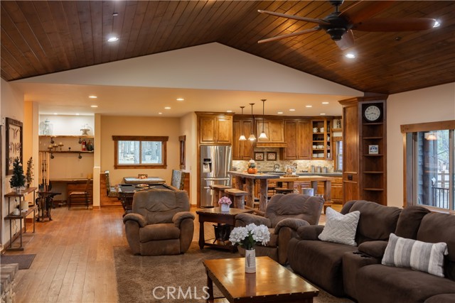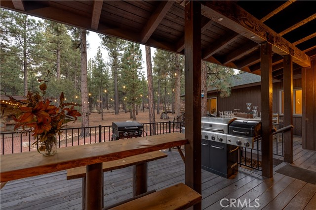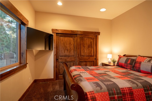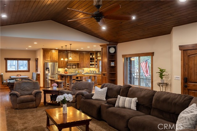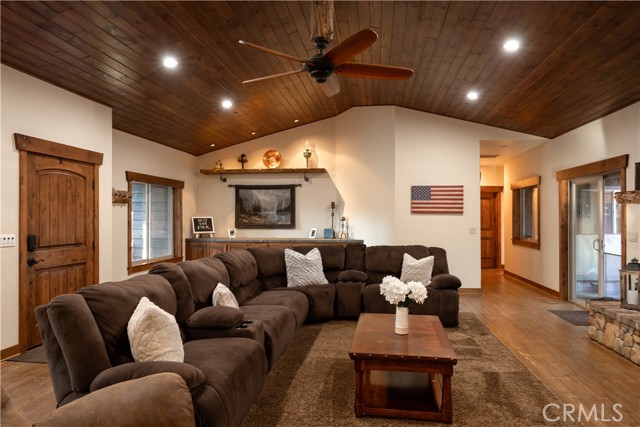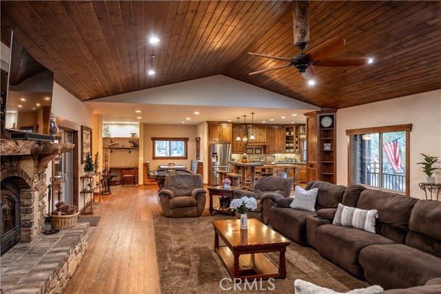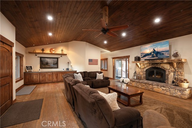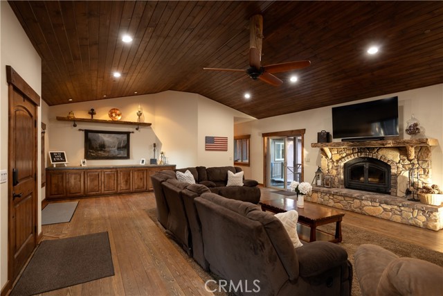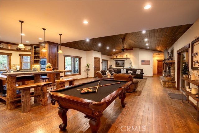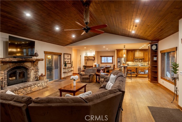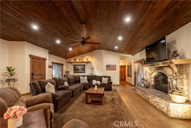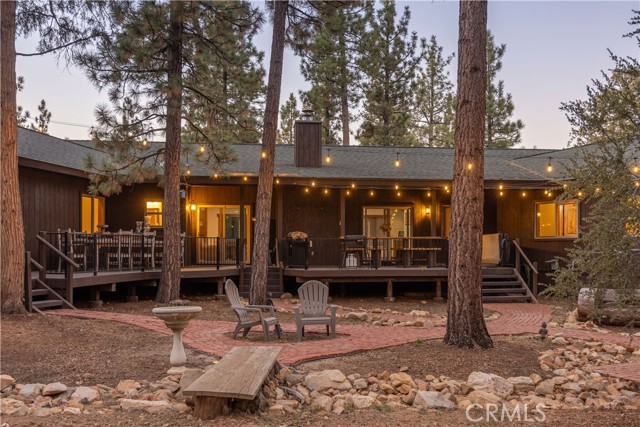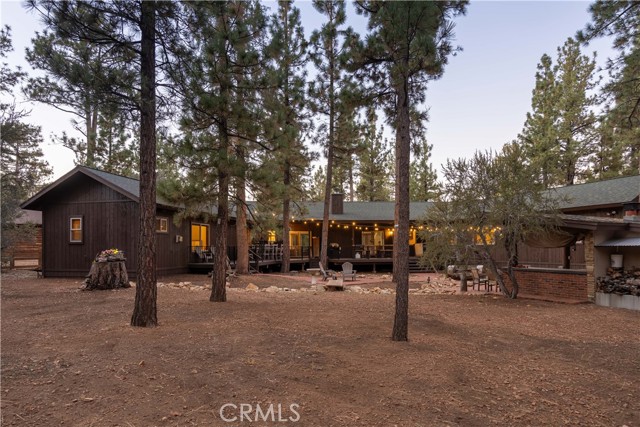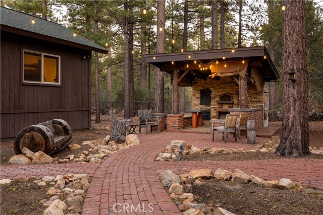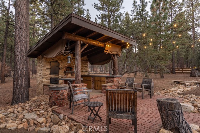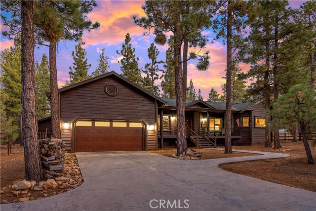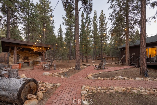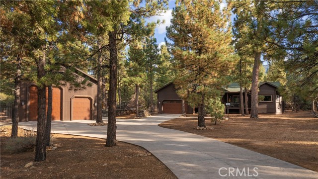 Welcome to Meadowbrook Estates! Absolutely one of the best values in the Big Bear Luxury Market with an amazing RV garage! This home backs to forest land and you will love this neighborhood. Elegant design and exceptional features. From the moment you arrive, you'll be impressed by the beautifully stamped concrete driveway, which sets the stage for the craftsmanship that awaits inside. Inside the home, you'll find attention to detail at every turn, creating a true mountain retreat. The spacious single-story layout offers plenty of room for comfortable living, and the 1,750 sq ft RV garage is a fantastic addition for those with hobbies or storage needs. With an attached garage as well, convenience and easy access to your vehicles are ensured. But the luxury doesn't stop there. Step outside and you'll discover a rear courtyard that truly feels like a tranquil oasis. Relax and unwind in the soothing waters of the hot tub, or channel your inner chef with the built-in pizza oven, perfect for creating unforgettable culinary experiences. And if you prefer dining under the open sky, the quiet patio provides an idyllic setting for al fresco meals or simply taking in the serene surroundings. One of the standout features of this property is its location adjacent to the National Forest. With direct access to pristine wilderness, you'll have endless opportunities for outdoor adventures right in your own backyard. Over an acre of level living!