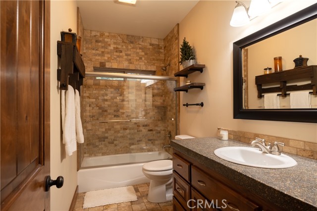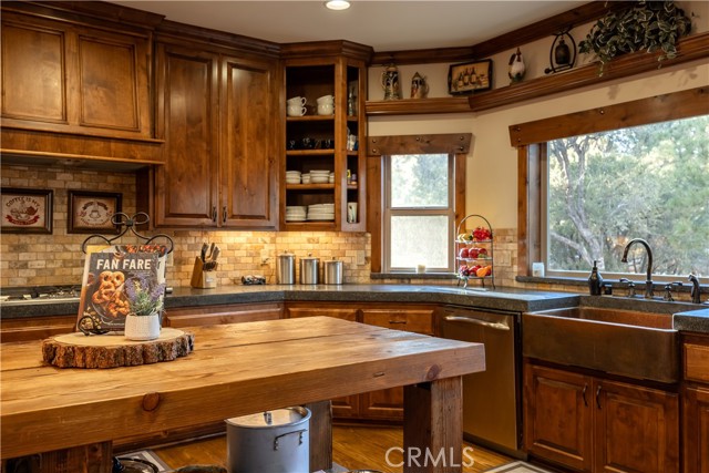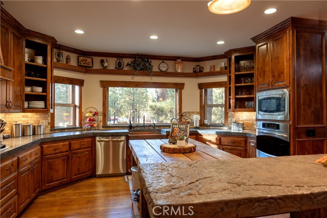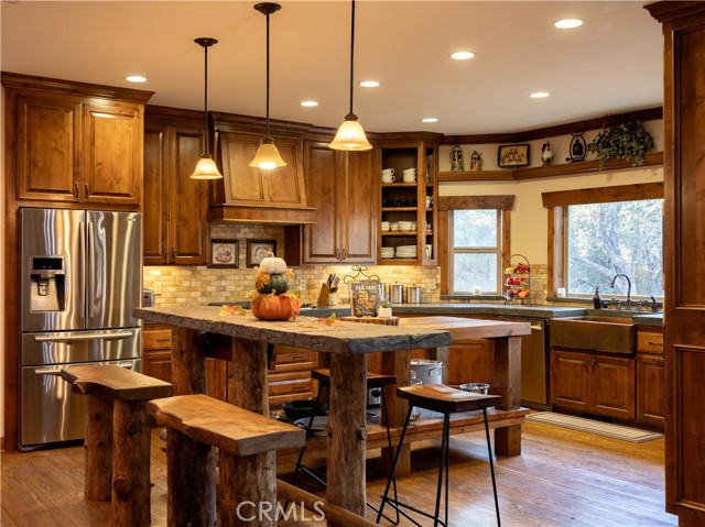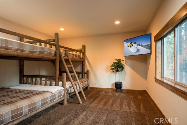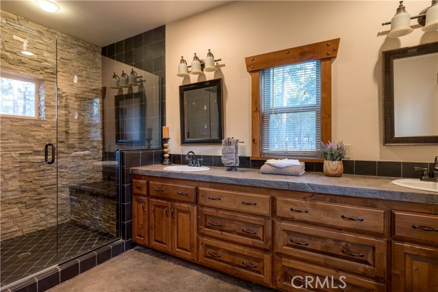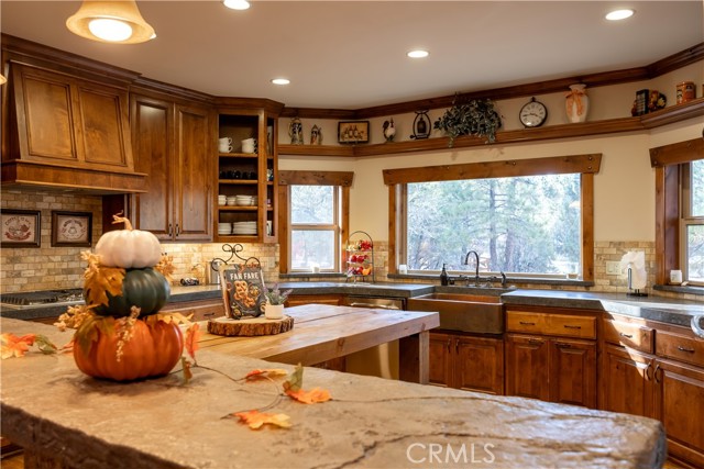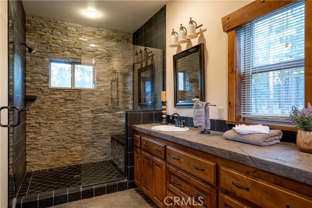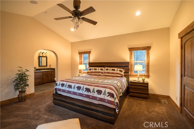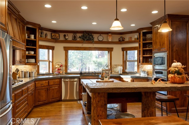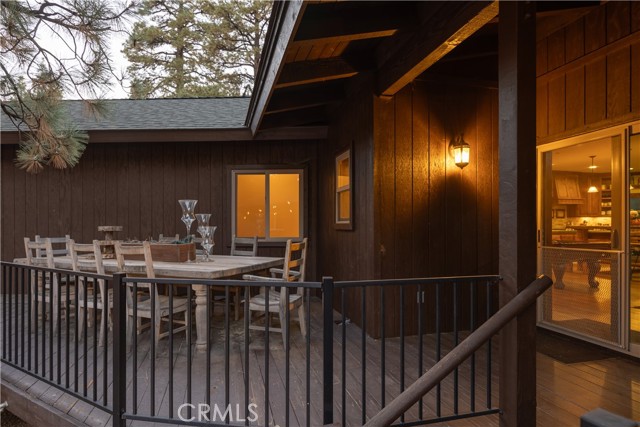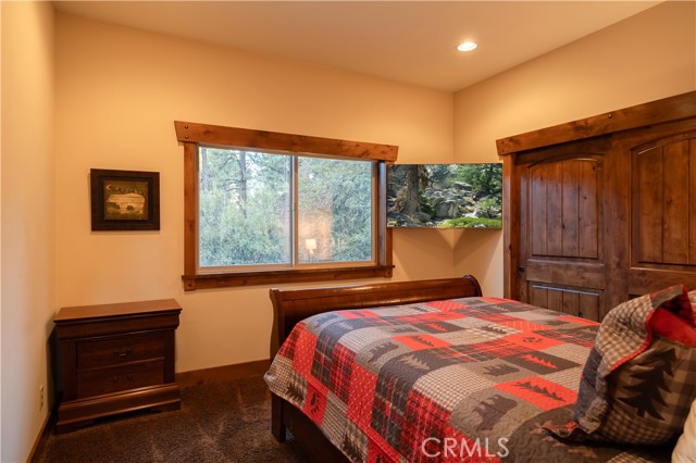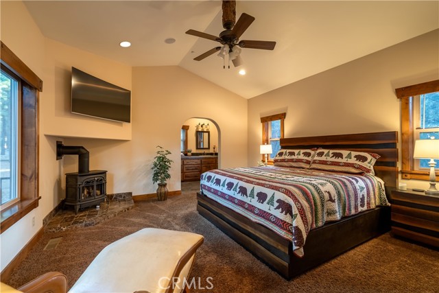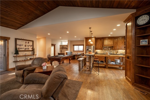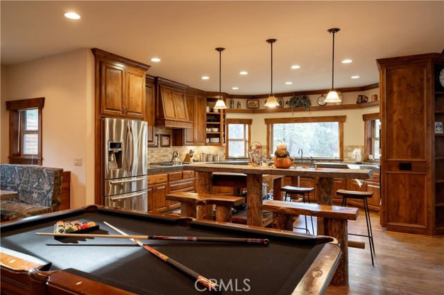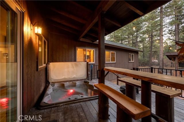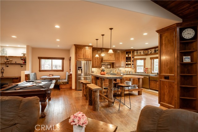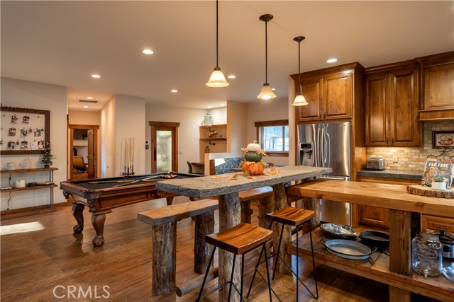 Welcome to Meadowbrook Estates! Absolutely one of the best values in the Big Bear Luxury Market with an amazing RV garage! This home backs to forest land and you will love this neighborhood. Elegant design and exceptional features. From the moment you arrive, you'll be impressed by the beautifully stamped concrete driveway, which sets the stage for the craftsmanship that awaits inside. Inside the home, you'll find attention to detail at every turn, creating a true mountain retreat. The spacious single-story layout offers plenty of room for comfortable living, and the 1,750 sq ft RV garage is a fantastic addition for those with hobbies or storage needs. With an attached garage as well, convenience and easy access to your vehicles are ensured. But the luxury doesn't stop there. Step outside and you'll discover a rear courtyard that truly feels like a tranquil oasis. Relax and unwind in the soothing waters of the hot tub, or channel your inner chef with the built-in pizza oven, perfect for creating unforgettable culinary experiences. And if you prefer dining under the open sky, the quiet patio provides an idyllic setting for al fresco meals or simply taking in the serene surroundings. One of the standout features of this property is its location adjacent to the National Forest. With direct access to pristine wilderness, you'll have endless opportunities for outdoor adventures right in your own backyard. Over an acre of level living!