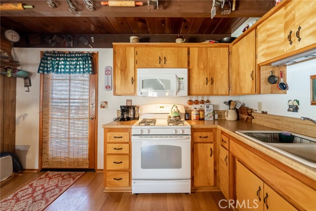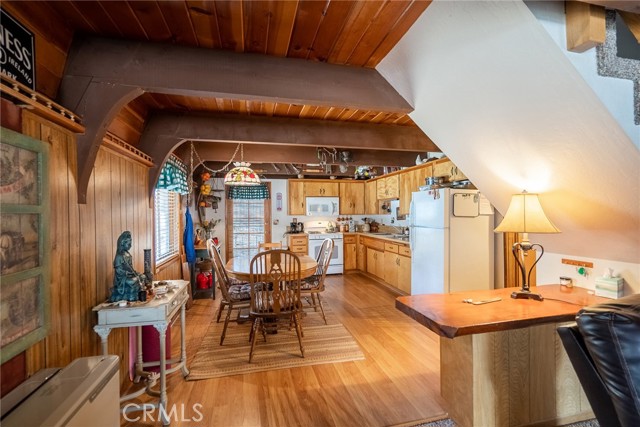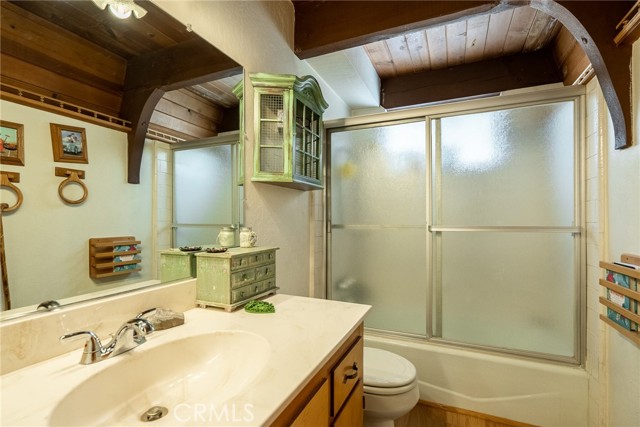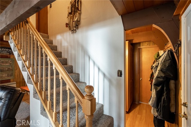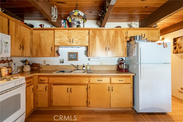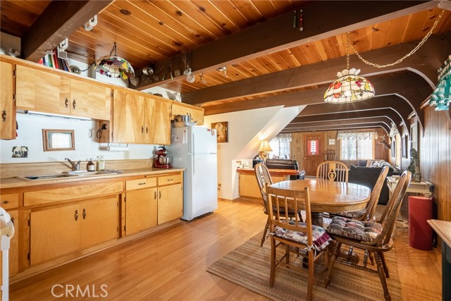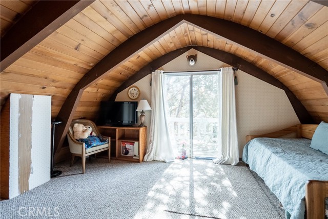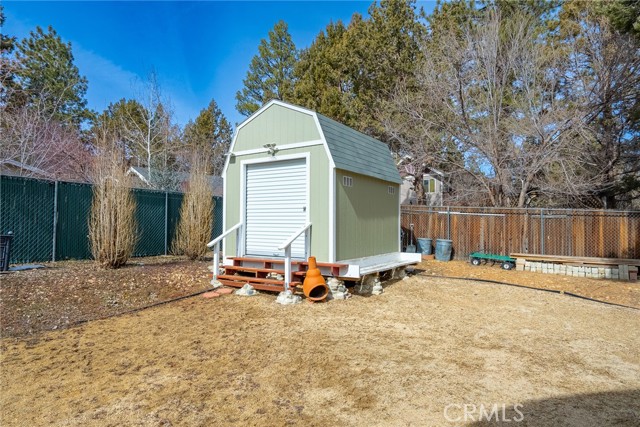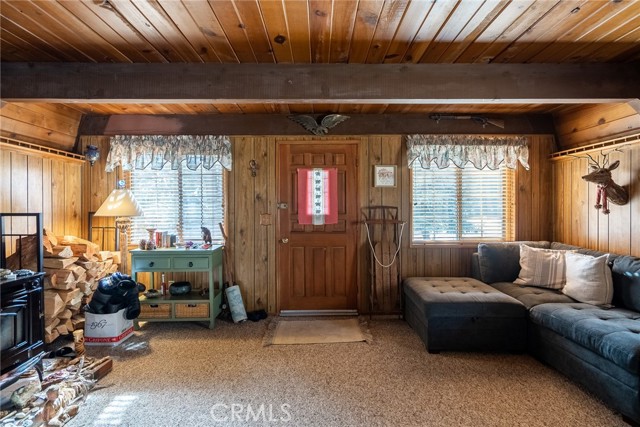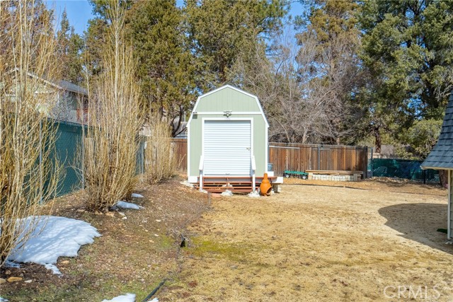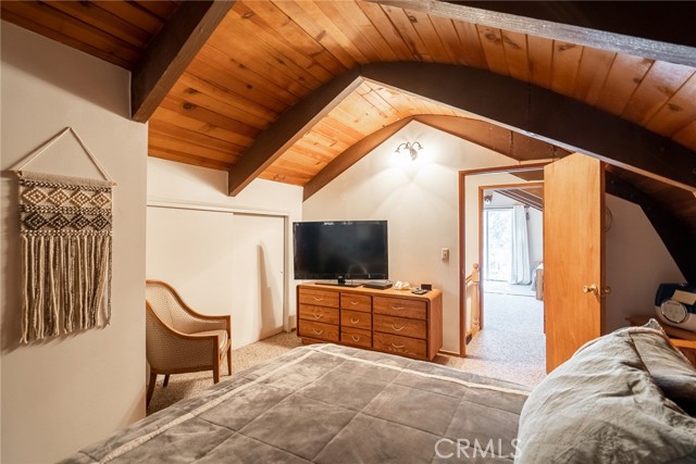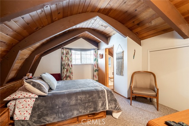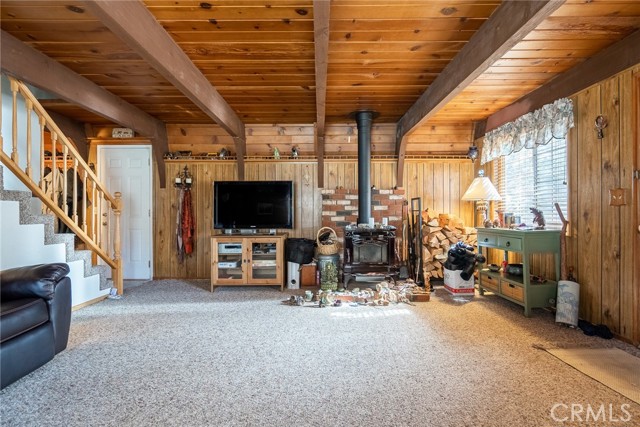 Located in the highly sought-after neighborhood of Shay meadows in Big Bear City, this level of comfort is a result of superb design. The main entry level showcases an openness with an amazing living room with beautiful fireplace. The stunning wood beamed ceilings are showcased in a custom design manor, sure to bring comfort to the living spaces throughout the home. The spacious kitchen has the most beautiful mountain views, a separate door that leads onto the back patio for additional entertaining, great counter space, cabinetry with hardware and there is an additional eating area. The upper level features the main bedroom with vaulted, wood beamed ceilings, an abundance of natural light, and a slider that leads you onto your private balcony to enjoy the peace and beauty of this mountain community. The guest bedroom is good size and features the same stunning wood beamed ceiling and natural light. The entire lot is fenced and features a circular driveway, RV parking, located near Big Bear Lake, downtown, shopping, entertainment and ski resorts.