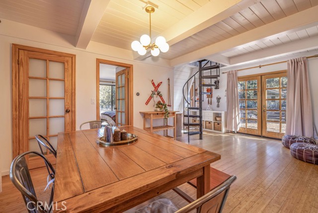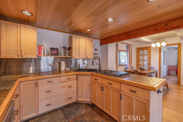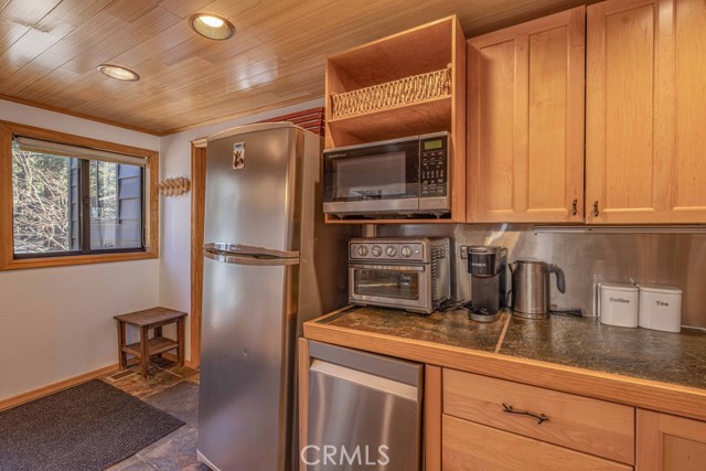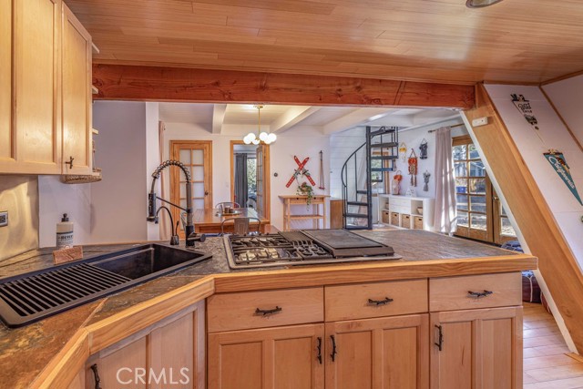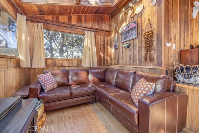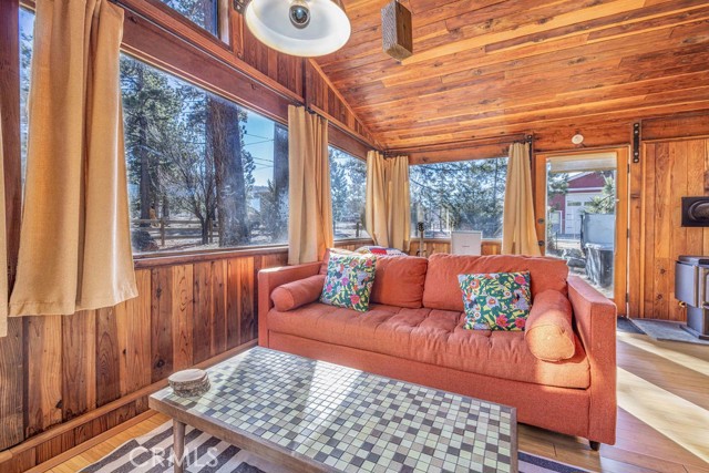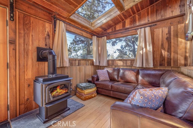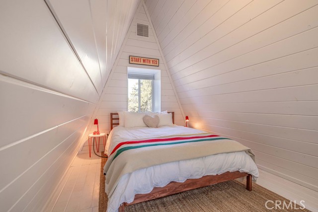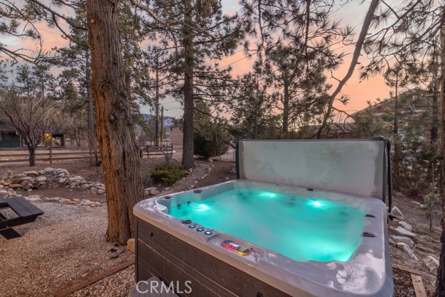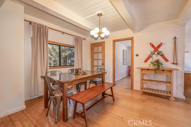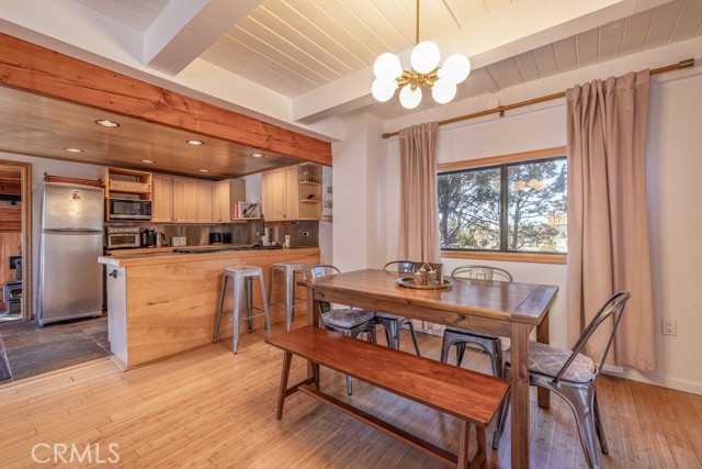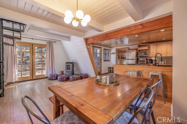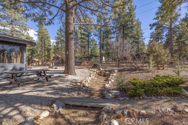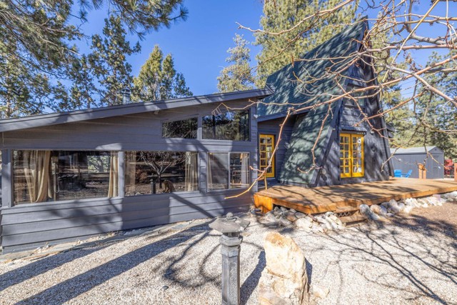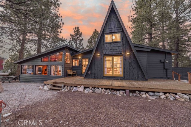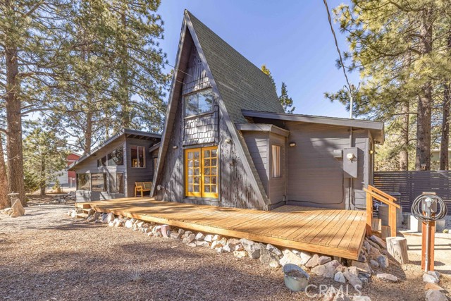Incredibly gorgeous A-frame nestled amongst the trees near the forest! ~ This charming and wonderfully upgraded cabin resides in a neighborhood that is known as 'one of Big Bear's best-kept secrets', just around the corner from Hamilton Ranch. Level, quiet streets with incredible mountain views through the towering pines make for a nice walk with loved ones! Within walking distance to trails and parks, and just down the way from amazing rock climbing and off-roading routes. On a spacious and beautifully landscaped lot, with a seasonal 'creek.' This warm and inviting cabin presents a bright and open floorplan with plenty of space to entertain! Elegance meets modern comfort in this Euro-style kitchen boasting sleek appliances, beautiful cabinetry, and ample counter space, offering the perfect setting for culinary delights. Featuring vaulted and beamed ceilings throughout, walls of windows to soak in natural light, and multiple lounge areas. Enjoy the convenience of having A/C and forced-air heating, 2 fireplace stoves, laundry, an easily accessible EV charger outside near the driveway, and storage space! Extra benefits include being east-facing for more sun exposure and faster snow melt, lots of mature trees, and low-maintenance landscaping, a spa and outdoor BBQ area, fire pit lounge area, and tons of parking! This lovely place presents the perfect blend of comfort, charm, and outdoor serenity—a rare opportunity to embrace the mountain lifestyle you've always dreamed of!