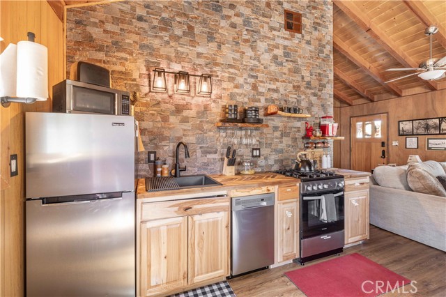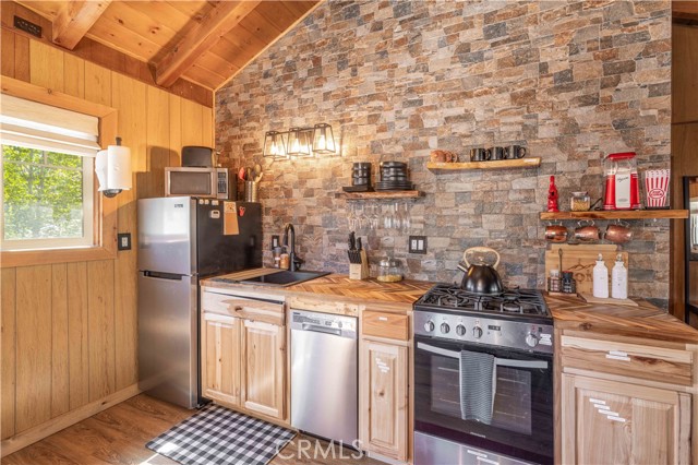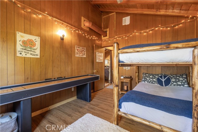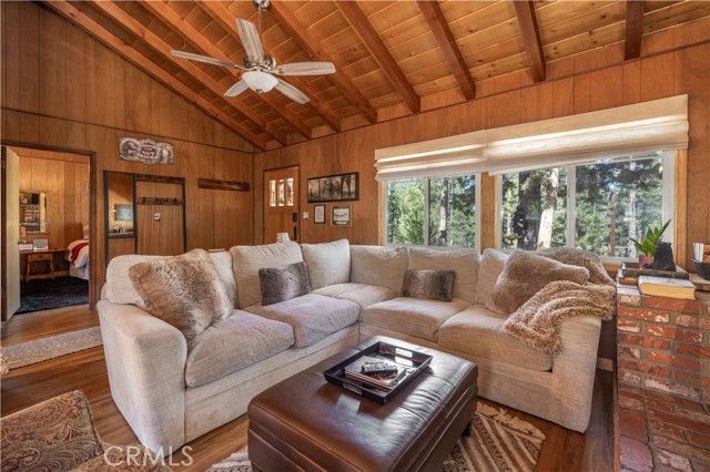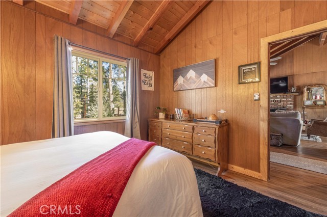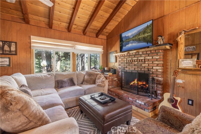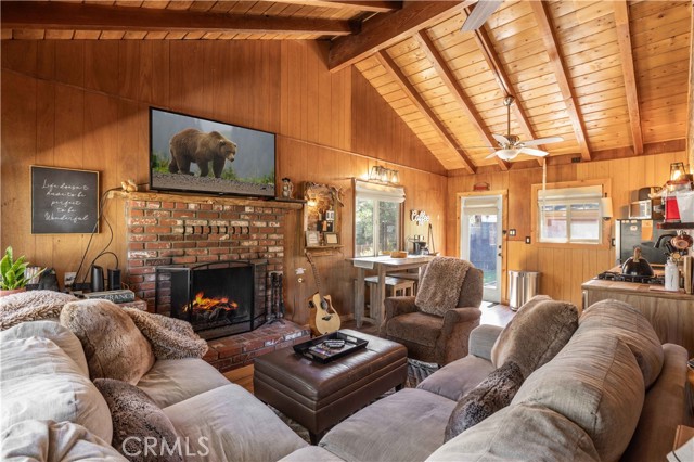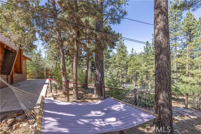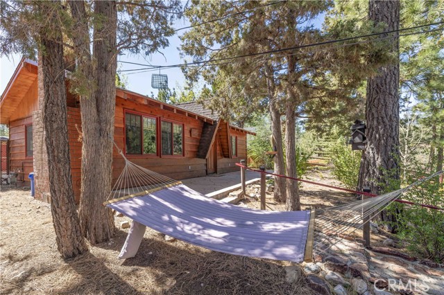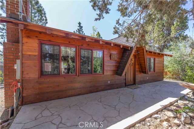 Super charming and updated A frame cabin on a beautifully treed lot in Big Bear City! This quiet street is just steps away from a protected nature preserve with gorgeous hiking and biking trails, as well as epic sledding hills in winter! When you step inside, the wood lined vaulted ceilings and open floor plan make this cozy cabin feel much larger than it's 704 square feet, and the brick fireplace adds immediate charm to the space. The new flooring, window treatments, striking stone wall, and fully upgraded kitchen and bathroom give it the perfect modern touches to blend with the rustic aesthetic. Spend peaceful mornings sipping coffee on the new expansive back deck, watching the aspens glitter in the wind. Or lounge in a hammock out front among the pines! The new tuff shed out back is the perfect “owners closet” to store linens and supplies, as well as use as storage for outdoor recreation gear. Other notable functional upgrades include all-new copper plumbing, water heater and electrical panel. With the seller's recent move, they’ve decided it’s time to pass it along to another family to enjoy. Whether you're seeking a weekend retreat or a permanent place to call home, this turnkey cutie is a diamond in the rough!