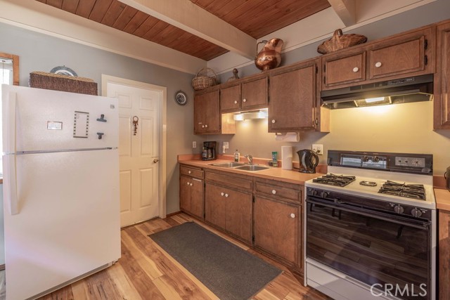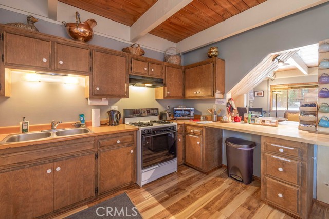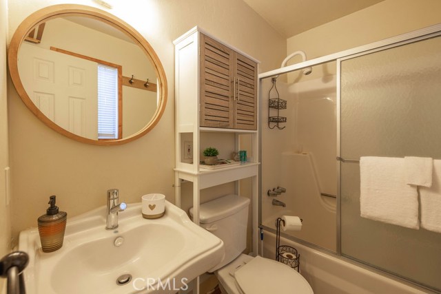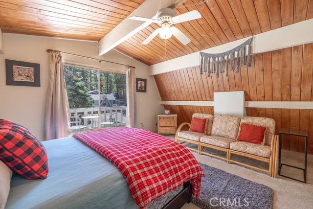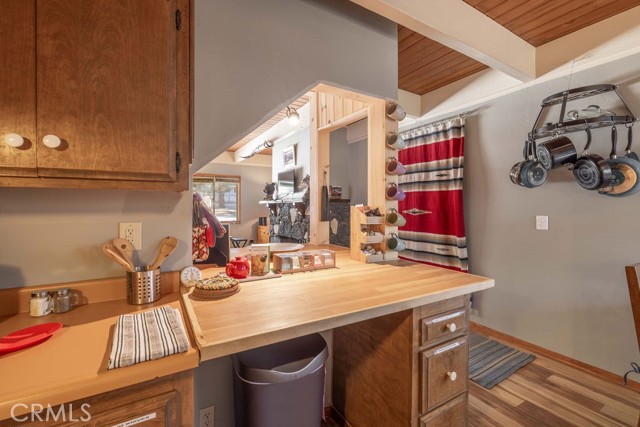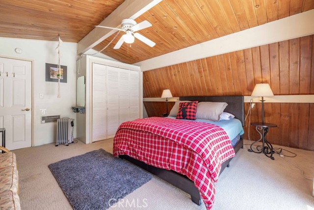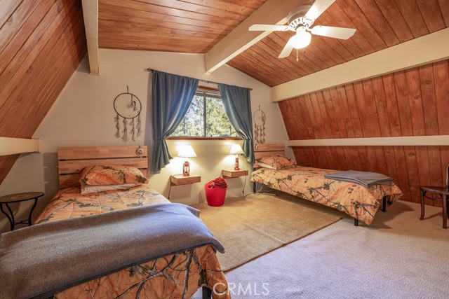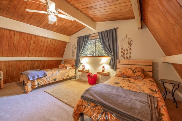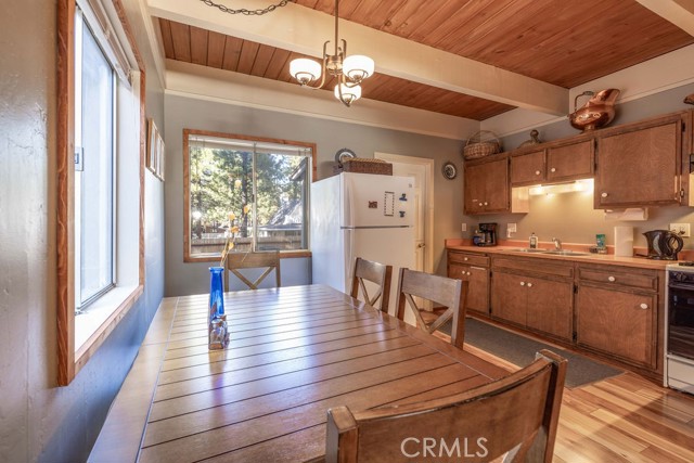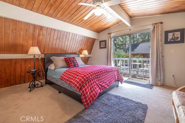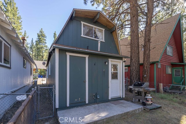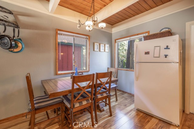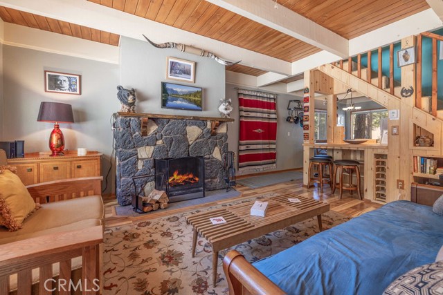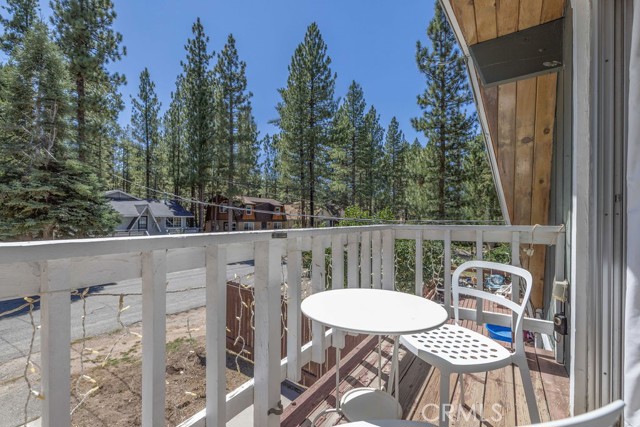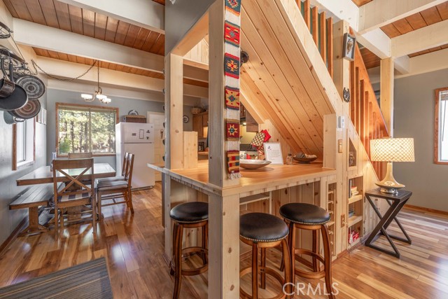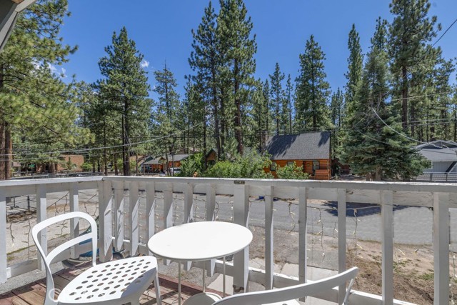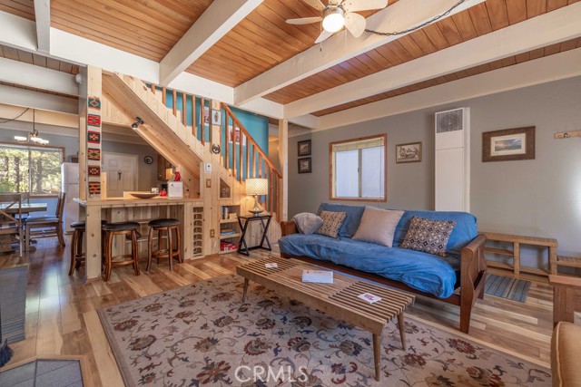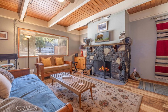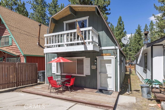Indulge in the epitome of a mountain escape with this lovely updated gambrel home! Nestled in the heart of Big Bear, this enchanting cabin offers a delightful experience. Just up the street from captivating hiking trails including the renowned Maple Hill Trails, only mere moments from the yummy flavors of Thelma's Family Diner and Lumberjack's Cafe, and convenient access to Community Market! Immerse yourself in the very essence of the mountains, all within a leisurely 5-minute drive from year-round delights such as entertainment at Wyatt's and the popular vibrant Oktoberfest festivities at the Convention Center. Unleash your inner thrill-seeker at the Big Bear Raceway and Snow Play, or savor a serene stroll along the pedal path and boardwalk, each step offering picturesque horizons! Featuring beamed ceilings, rock fireplace, wood-look flooring, and craftsman finishes, creating a tasteful mountain charm. Plus, this cabin has a laundry and mud room! The kitchen boasts ample storage and countertop space, effortlessly melding with the inviting dining area and a central breakfast bar that's perfect for lively morning conversations. Generously sized bedrooms, one which opens up to a south-facing balcony, a private vantage point to bask in the morning sun's golden embrace and relish in the spectacle of vibrant sunsets painting the sky. The backyard is surrounded by towering pine trees providing the perfect amount of shade, with space to enjoy and create memories!