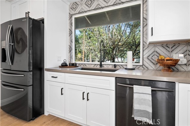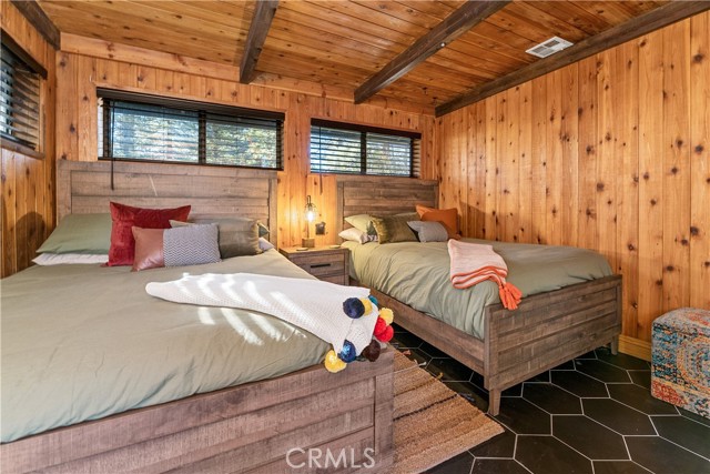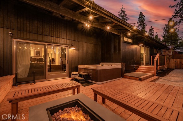 Back on the market, buyer could not perform! Their loss your gain! Charming Modern Cabin w/ Game Room & Spa. Nestled in the lush mountain pines is this modern 4BR, Three bathrooms Big Bear cabin with all the luxuries of a chalet-style home. This fully renovated, new bathrooms, new ceramic plank flooring, just painted inside and out. This bi-level cabin has something for the whole family, a front porch and a rear decked area with a hot tub, fire pit, plenty of custom seating, separate dining room, Open concept kitchen with island, and picture window. Inside laundry area, separate bar area, Game room and even more games outside with horseshoe and cornhole. Only minutes to Snow Play, ski resorts, the zoo, the picturesque Lake, fun-filled mountain escape has to offer, fruit trees front and back. Direct garage access with two parking spaces and pass thru back garage door for additional parking. Three car parking on driveway. This home is immaculate inside and out. Situated in the desirable Fox Farm neighborhood of Big Bear. Enjoy activities like Octoberfest at the Convention Center only 1/2 mile away and just 2.5 mile from Both Ski Resorts.