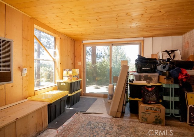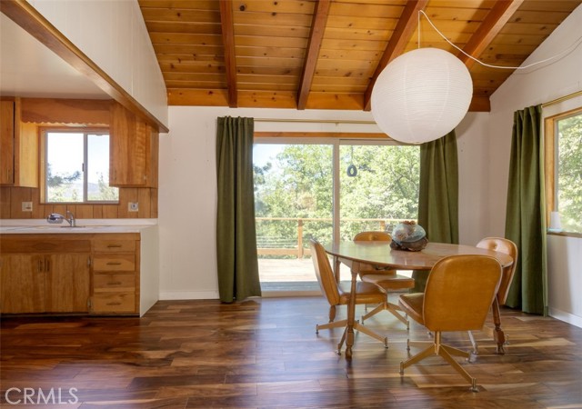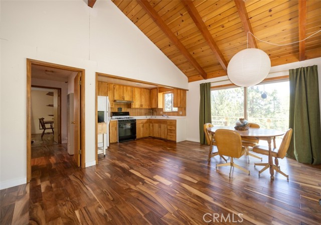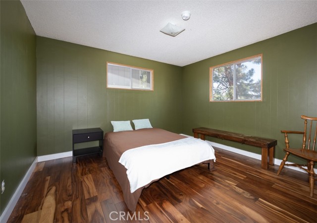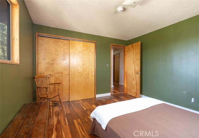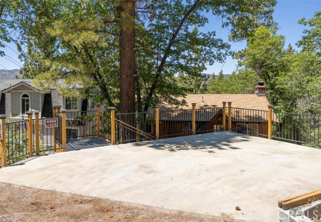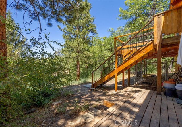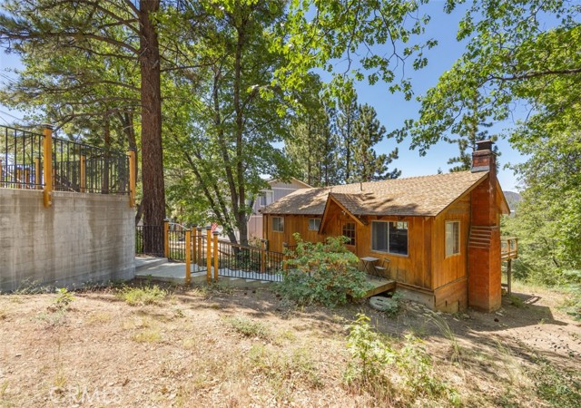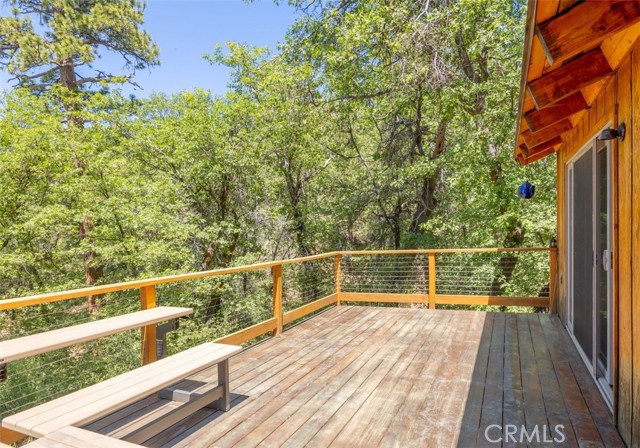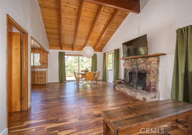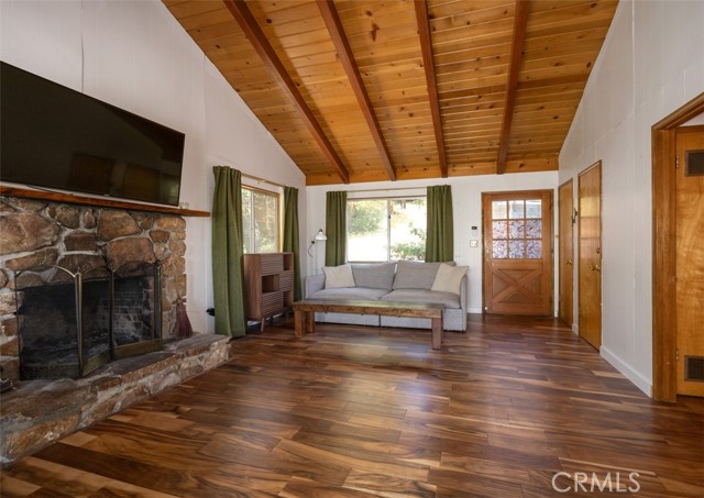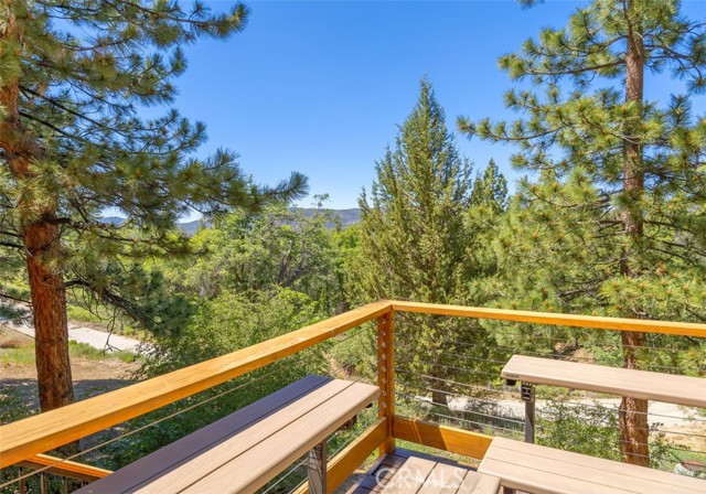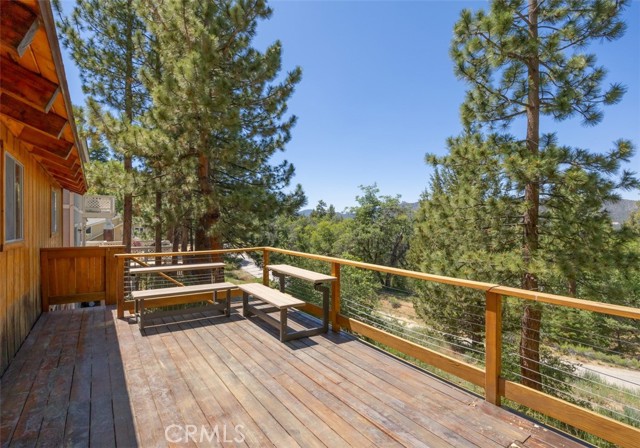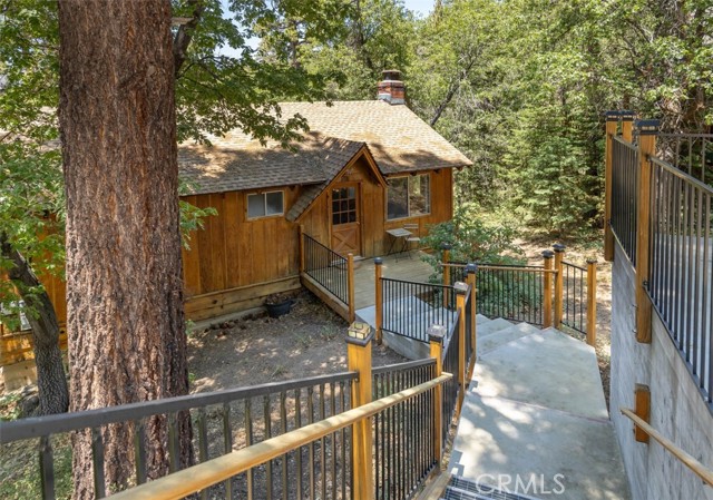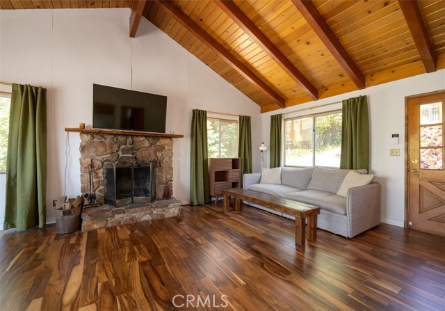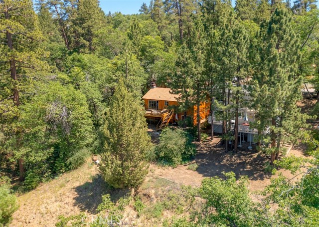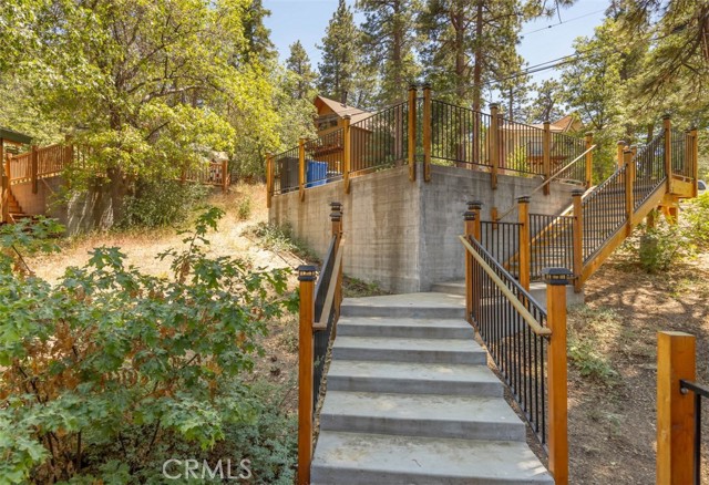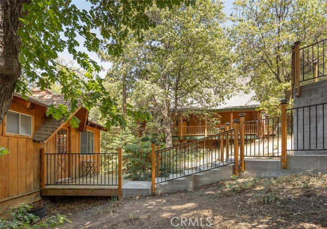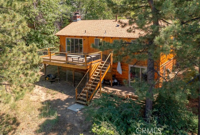 Peaceful Moonridge setting with unobstructed mountain and tree views. Tucked away from the street, this charming Sierra-style cabin has that mountain get-away ambiance you've been waiting for. The open floor plan has beautiful new hardwood flooring, vaulted beam ceilings, brick fireplace, open kitchen area, 2 large bedrooms, updated full bath and lots of natural light. The spacious basement (with interior stairwell access) has an extra 3/4 bath with laundry room, separate wall heater and a dual pane slider leading out to it's own deck and the back yard. The basement is not permitted for living space and not included in the sq.ft, but has been used for additional family area, utility space and extra storage. There's plenty of room to BBQ and entertain on the upper and lower decks, or just to unwind and bask in the captivating views. The newer, south facing parking pad provides level access parking for 2 vehicles, and easy to maintain metal-grate & concrete steps going to the house. Close to Bear Mountain Ski resort, Big Bear Zoo, shopping and just minutes to the lake and Village. Comes mostly furnished and ready to enjoy.
