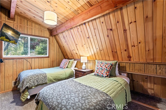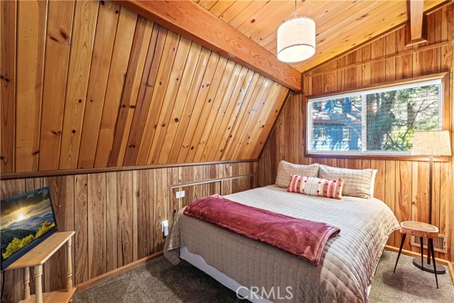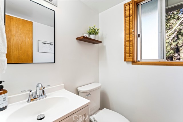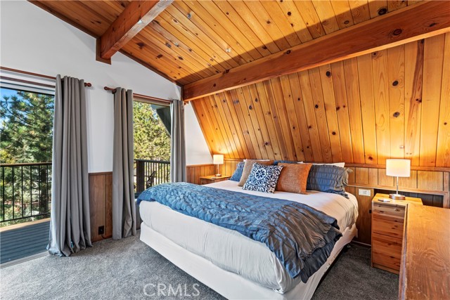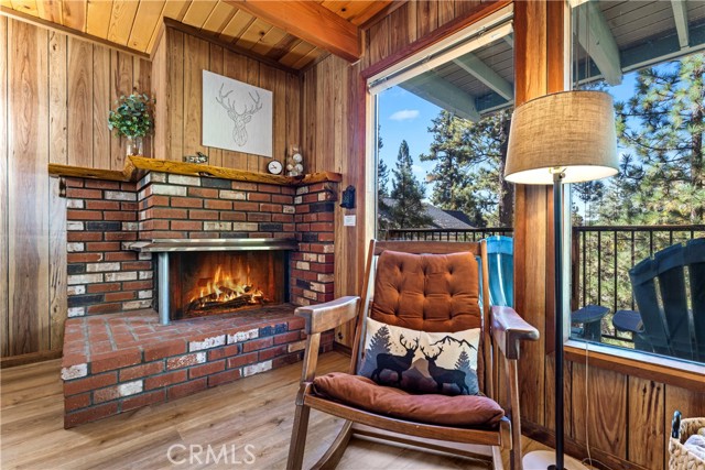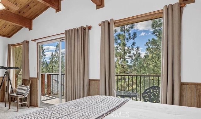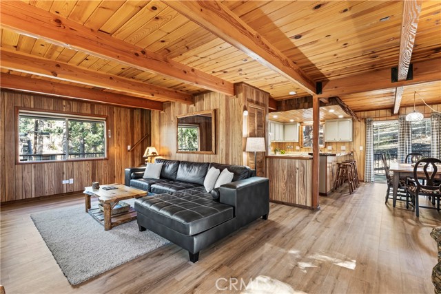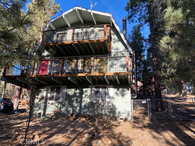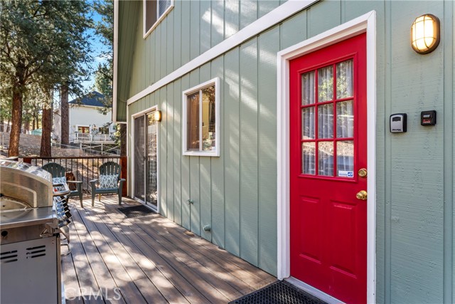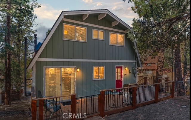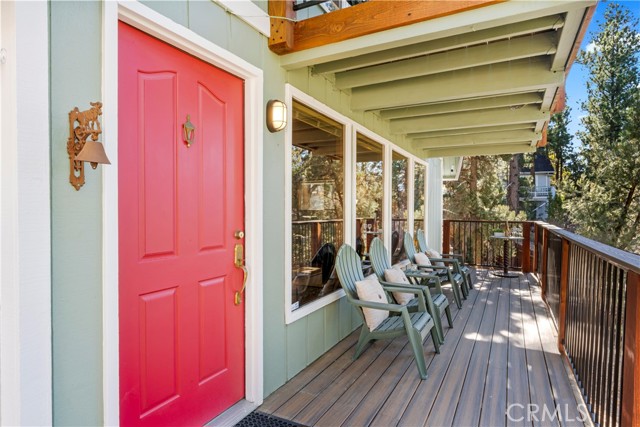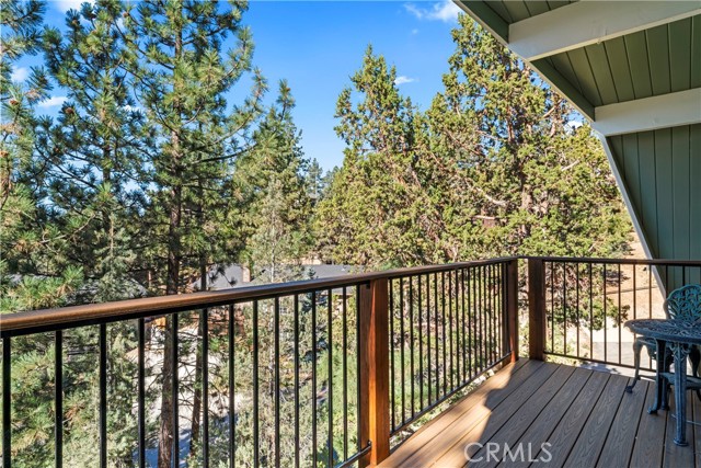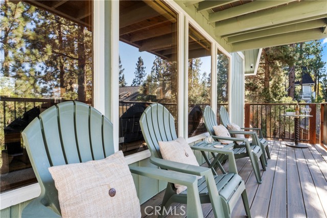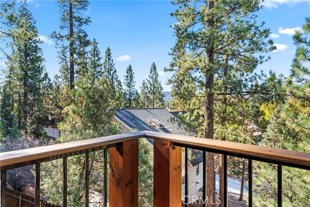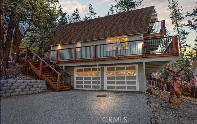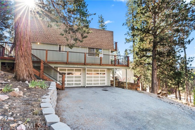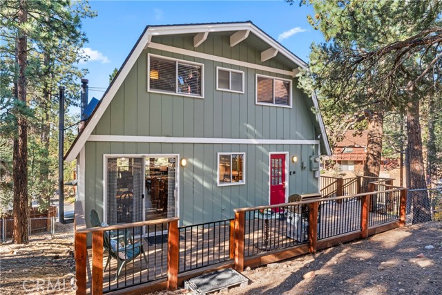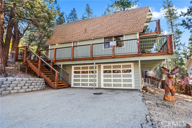 Make this your Mountain Retreat. Enjoy the peace and tranquility of this recently upgraded, move-in ready and FULLY FURNISHED mountain home! A beautiful tree-lined view from the wrap around balcony. Picture windows throughout the living room and the sliding door from the primary bedroom invite the peaceful view that looks back toward the ski slopes. The home is located on the north side of the lake in the desirable Whispering Forest neighborhood. You are only minutes to the charming town of Big Bear, the lake, the slopes, and numerous walking and biking trails. Step out onto the private balconies to take in the fresh mountain air. The home sits on a large fenced lot giving way to privacy from nearby homes. Featuring an open floorplan with a well appointed kitchen with a unique bar counter, opening up to the dining room and living room with their beamed ceilings. Access the private backyard patio, great for BBQs, through the dining room slider. Get warm by the gas fireplace adorned with brick before you ascend to the three bedrooms. The primary bedroom spans across the entire front of the house and hosts both a King and Queen bed with room to spare. Upstairs there is a full bath while downstairs has a second quarter bath. Additional stairs then lead down to two one car garages, one of which has been converted into a game and laundry room, while the other side is reserved for storing all those mountain toys: bikes, skis, fishing poles, or even a car. A large private driveway holds up to four cars. Let the adventures of the mountains become a part of your life! Please see the amenities list.