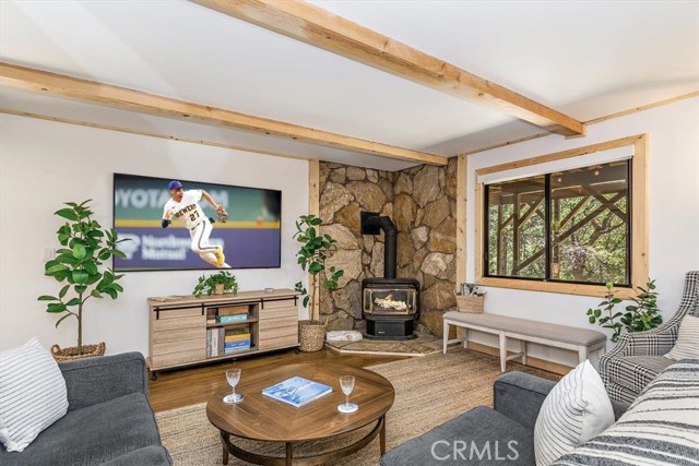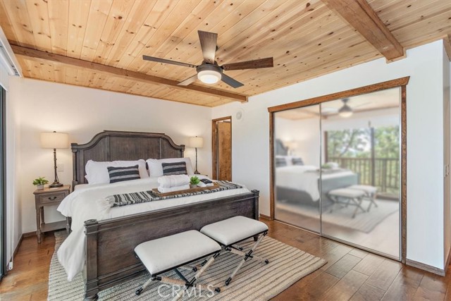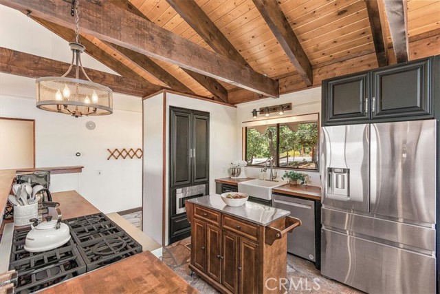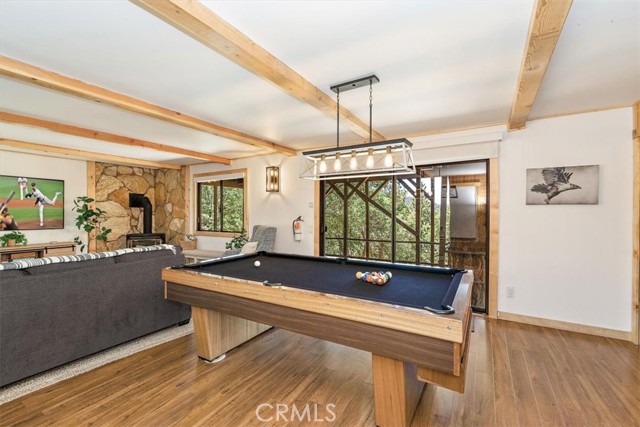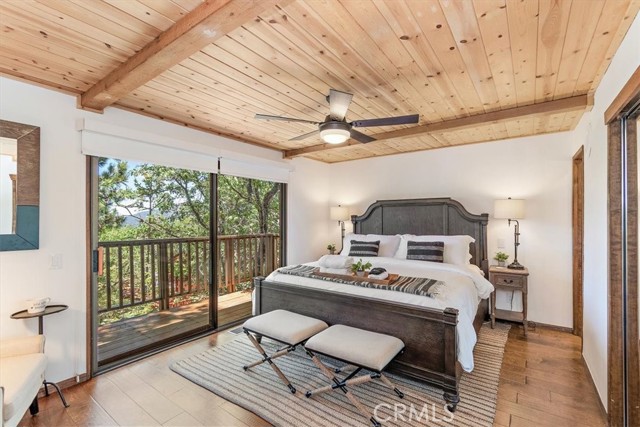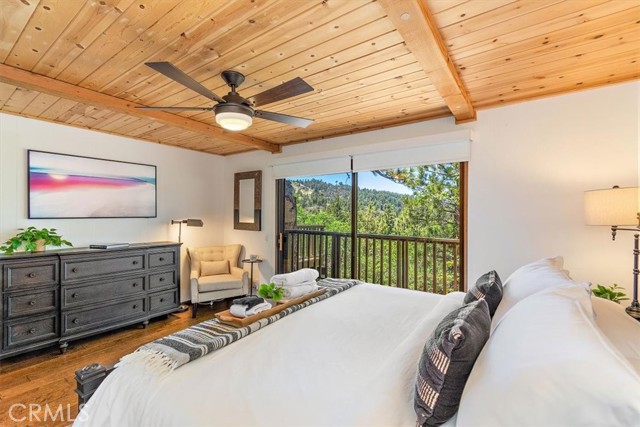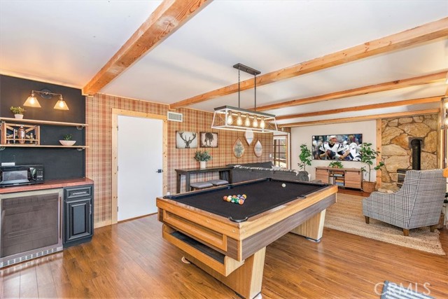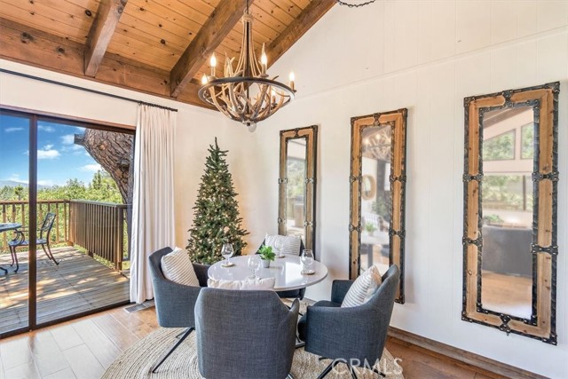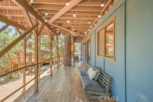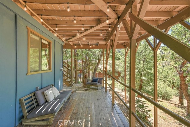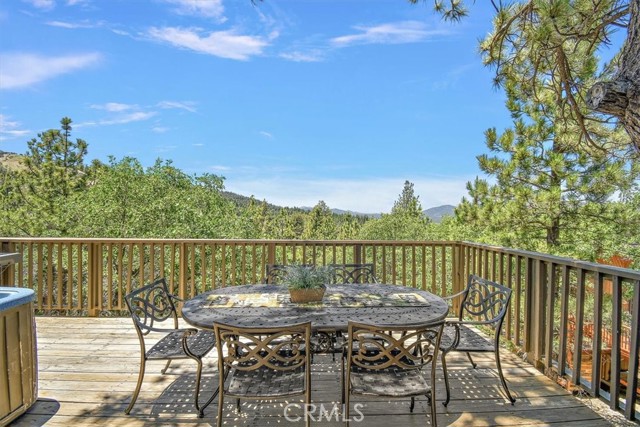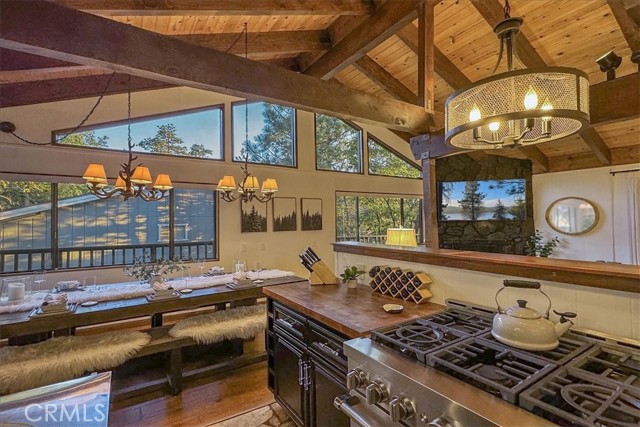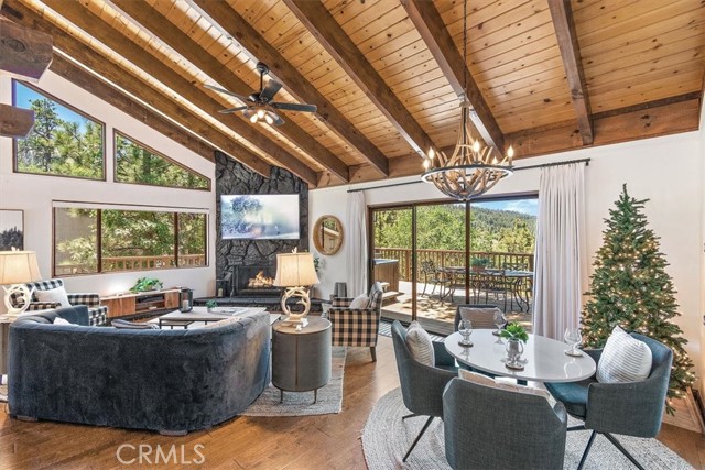 Views, Location & Fantastic Features! Discover this spectacular mountain home in a very special area of Moonridge, just 5 minutes or less from Bear Mountain, the golf course, zoo, & MORE! Enjoy the tranquility of this treetop retreat with dramatic ski slope & forested views. From some viewpoints you can see the lake. Consider the possibility of enhancing those lake views with strategic tree trimming. Nestled on an expansive 9,602 Square Ft Lot among majestic pines & oaks, the spacious and serene wrap-around deck beckons you for Al Fresco dining with amazing views or to unwind in the spa after a day of adventure. This stunning 3-bdrm, 3-bathrm home blends beautiful classic mountain elements with fantastic modern upgrades. The open Floorplan features flagstone floors, architectural wood beams with rustic tongue & groove vaulted ceilings and a beautiful rock-encased wood-burning fireplace, cozy on winter evenings. The open kitchen will inspire the chef in you with stainless appliances, including a 6-burner Kitchenaid pro-style range, butcher block counters , farm sink & a movable island. Share memorable meals in the large dining space plus there's an additional area for casual meals or a jigsaw puzzle. Experience the wall of glass with spectacular clerestory vaulted windows illuminating the “Great Room”. The primary bdrm boasts an en-suite bathroom w/fantastic views & a glass door leading to the rear deck, delivering retreat-like ambiance. The thoughtfully selected furnishings & décor combined with artful light fixtures further elevate this wonderful home. The downstairs game room-den has a freestanding gas fireplace a classic pool table & bar area. The billiard lighting casts an inviting glow over the felt surface-ready for a friendly game. This fantastic Fun Zone opens to the lower deck to enjoy the treed backyard providing a great snow play opportunity in the winter season. Unique features include copper sinks, “Smart” Toto toilet/bidets w/heated seats in each bathrm, Lutron Caseta intelligent lighting system, upgraded 200 amp electrical service, a 50 amp EV charging station, tankless water heater, & air conditioning, a rare luxury in Big Bear. Additional amenities include a laundry room & a massive storage area with a convenient utility sink. Offering a strong history of short-term rental income this property offers versatility as an income-producing rental, or an amazing personal home for full or part-time use. Come experience this homes Mountain Magic!