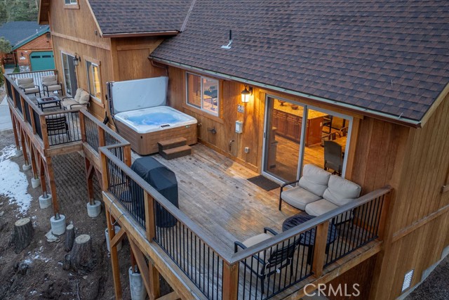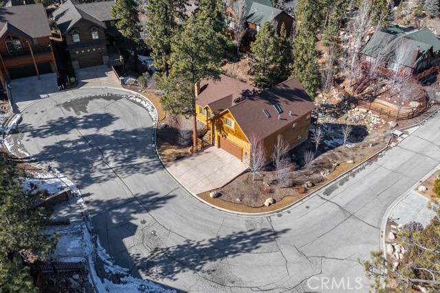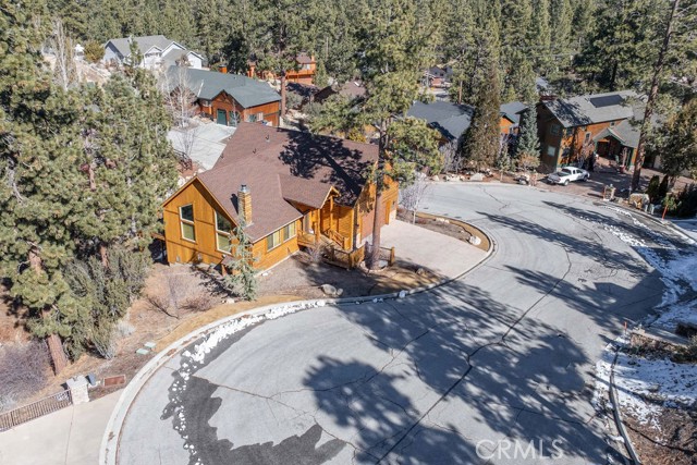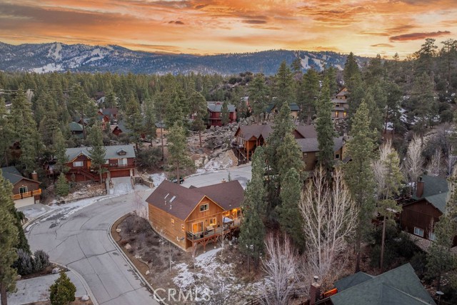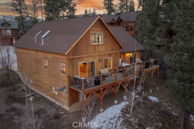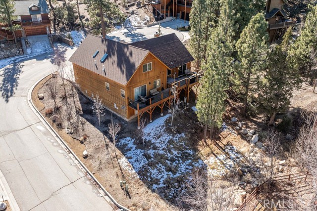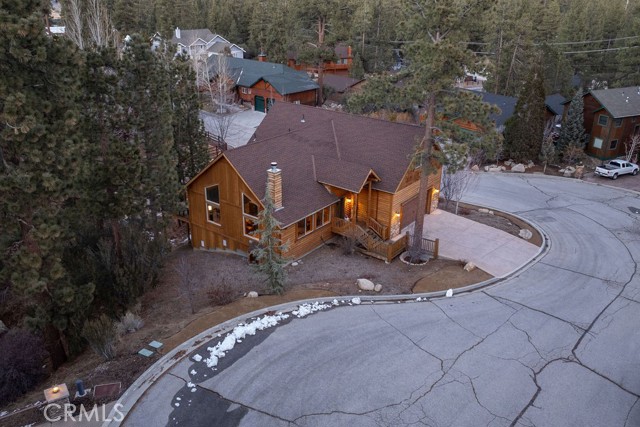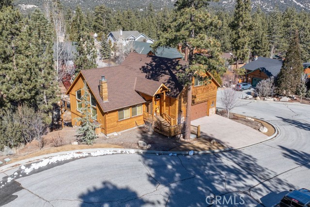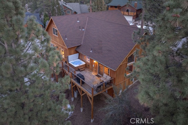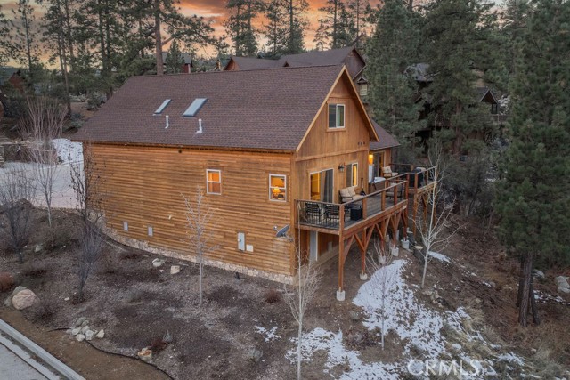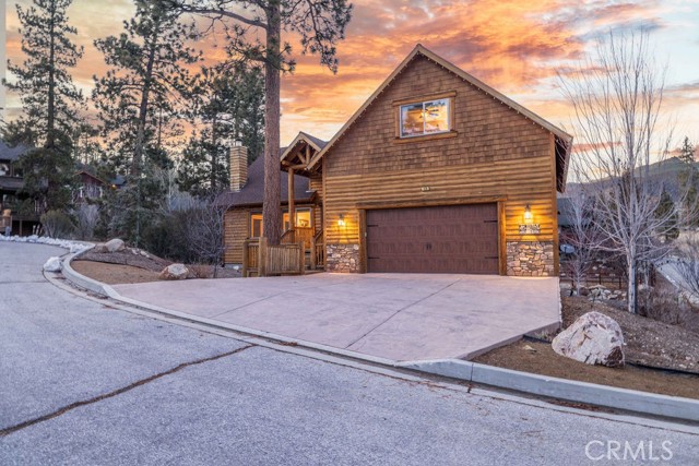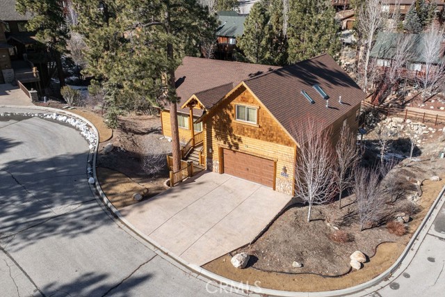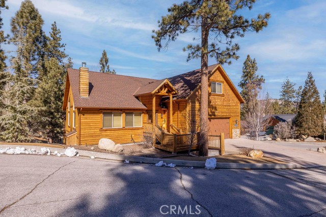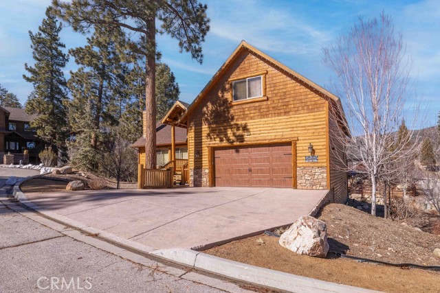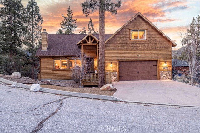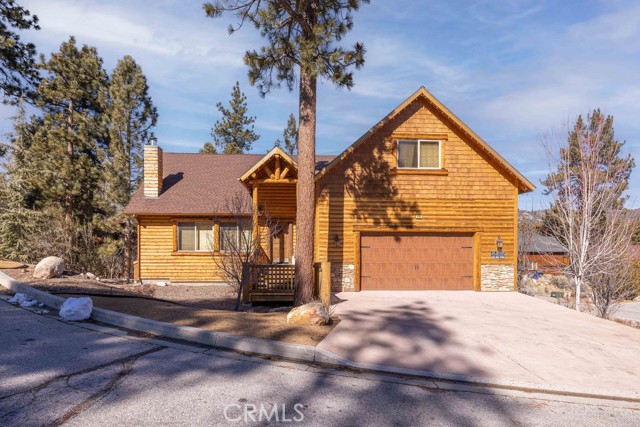Welcome to this charming custom-built log-sided home nestled in the desirable neighborhood of Castle Glen Estates. With a gorgeous open concept floor plan, this residence offers a perfect blend of rustic charm and modern convenience. As you enter, you'll be greeted by the warmth of the vaulted tongue and groove ceilings and beautiful high windows letting in an ample amount of natural light. Enjoy cozy winter nights gathered in front of a gorgeous floor to ceiling rock fireplace. The well-appointed kitchen is a chef's dream, featuring a kitchen island, custom cabinetry, and exquisite granite countertops. The master bedroom, conveniently located on the main level, offers a peaceful retreat with its own unique charm and direct access to the back deck. Upstairs, you'll find two additional bedrooms, a full bath and a versatile loft/game area, providing flexible living space to suit your needs. Step outside onto the expansive decking that covers the entire width of the home. Well appointed with outdoor furnishings and a spa, this is the perfect place to enjoy the fresh mountain air and entertain friends and family. Enjoy having a place to store all of your mountain toys in the attached oversized two-car garage. Whether you're seeking a weekend getaway or a year-round residence, this home in Castle Glen Estates is an ideal retreat, combining craftsmanship, comfort, and the allure of Big Bear Lake living.