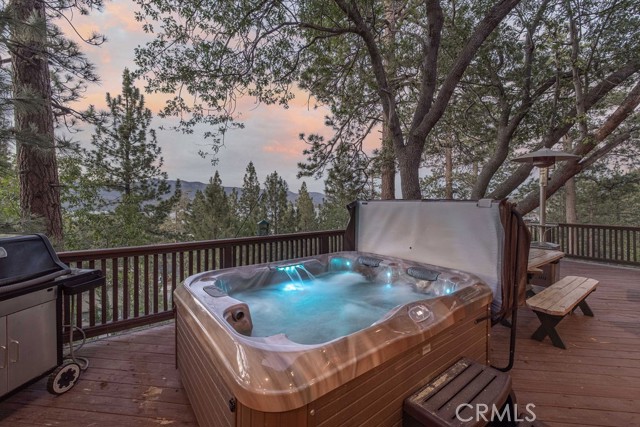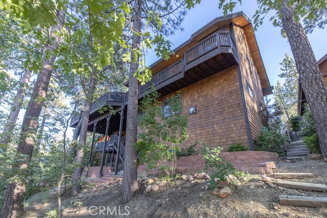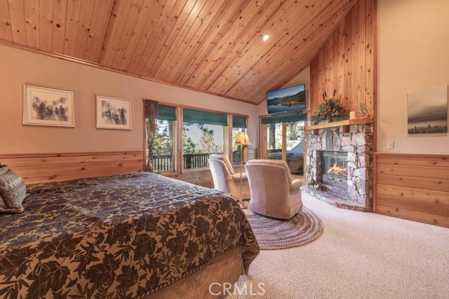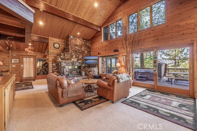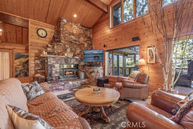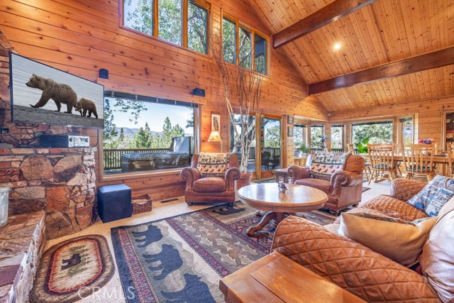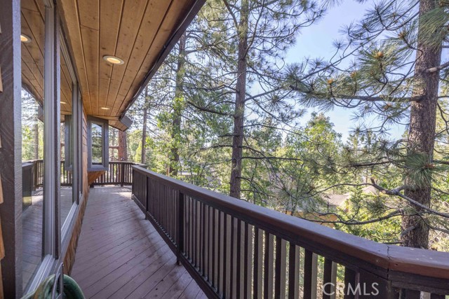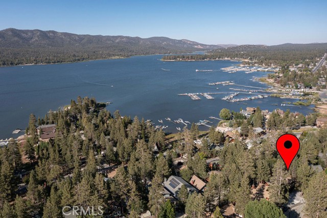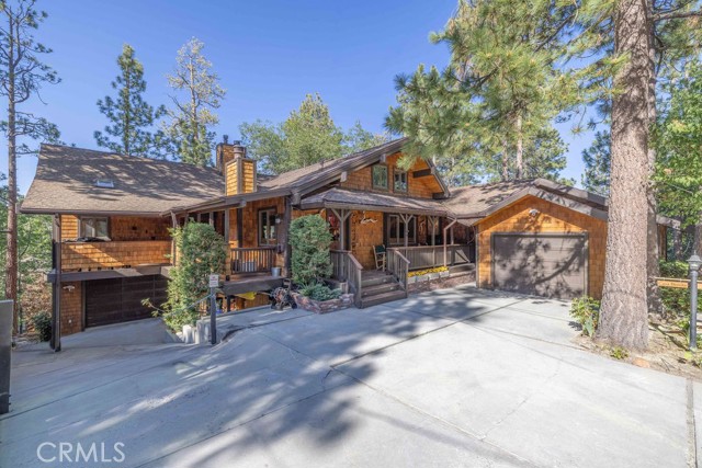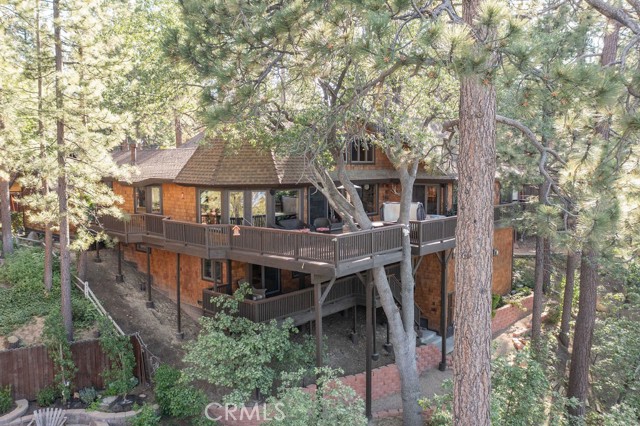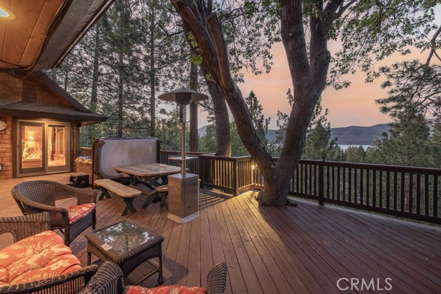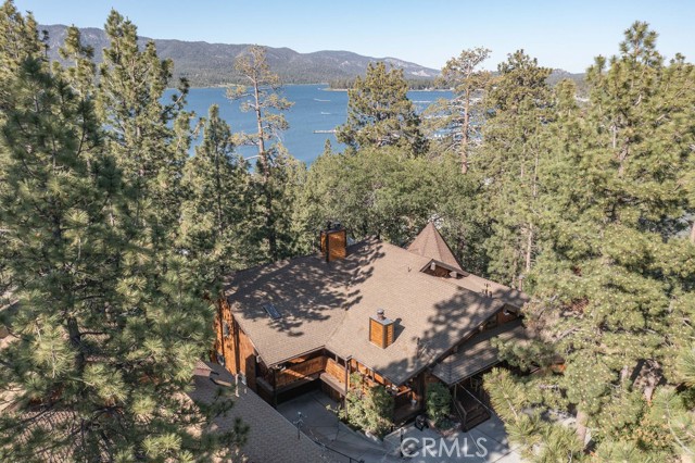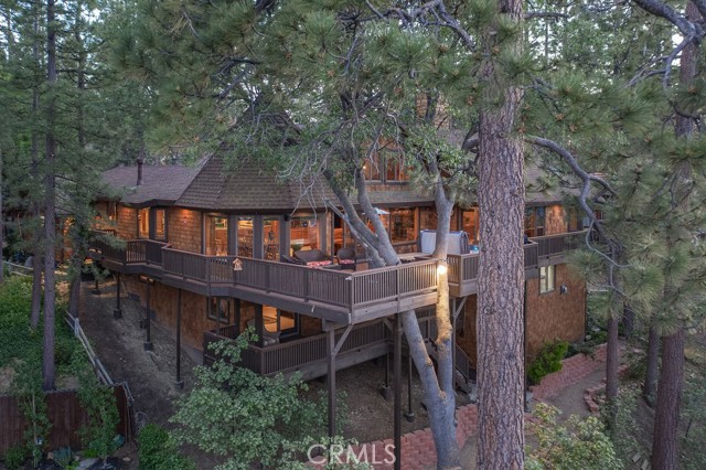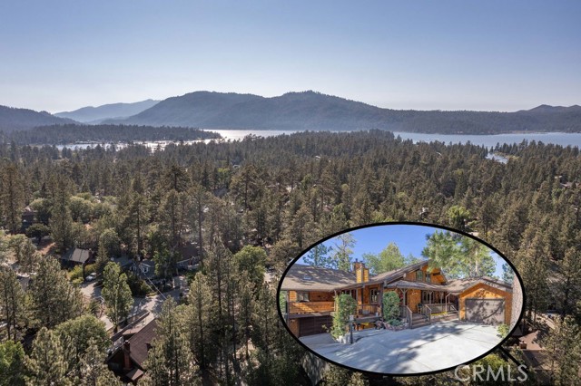 Stunning Panoramic Lake Views Await!! You will be in awe as you step out onto the sprawling deck and take in the incredible setting. Situated up in the trees you’ll feel like you’ve found your own treehouse in the woods. This home feels warm and cozy, yet offers 3 large en suite bedrooms, including a spacious main level master suite, a loft office/bedroom 4, 5 bathrooms and over 3,500 sq ft of living space. This does not include the well appointed converted lower garage which now serves as a heated and fully functioning game room. As you walk through the warm entry room (with it’s own fireplace!) you will find extensive cedar interior, vaulted ceilings and a beautiful indigenous rock & brick fireplace in the living room. The open kitchen area features dual sinks and high end appliances which include a Subzero refrigerator, Viking stovetop, Scotsman ice maker and Thermador warming drawers. Central Vac system, Anderson windows, partially heated driveway and an outdoor spa… there are honestly too many features to list. This home is coming fully furnished and turnkey, ready for the new owners to enjoy! It truly has all that you are looking for and more in a mountain retreat and is centrally located just a short distance from the lake, the Village, Snow Summit and all that Big Bear has to offer.
