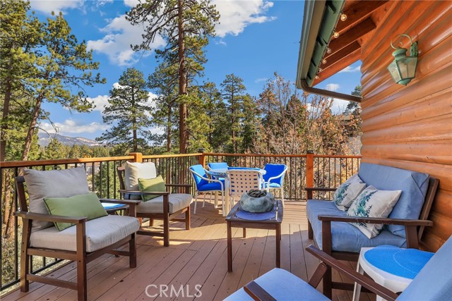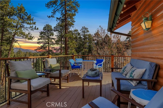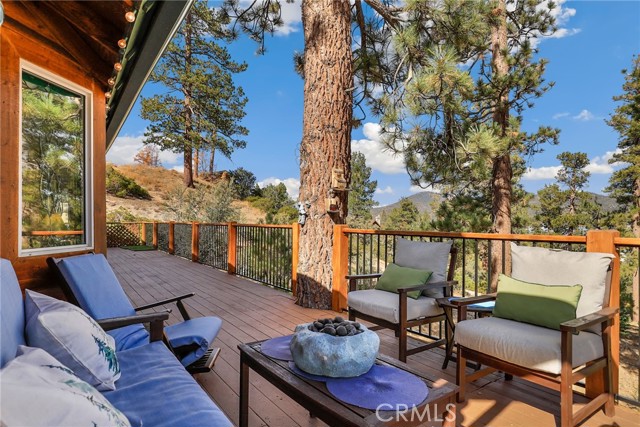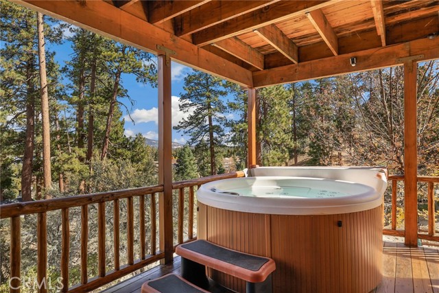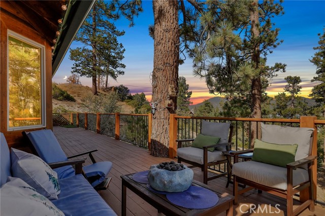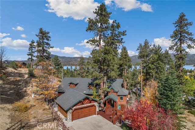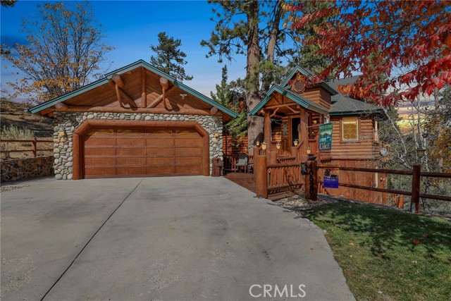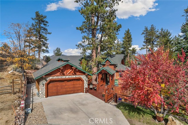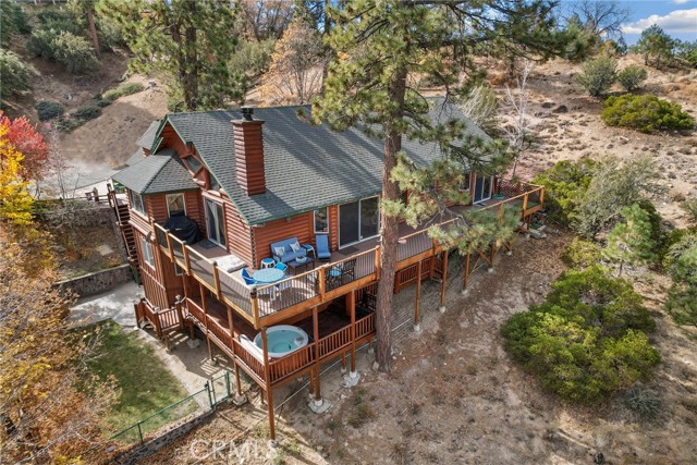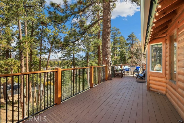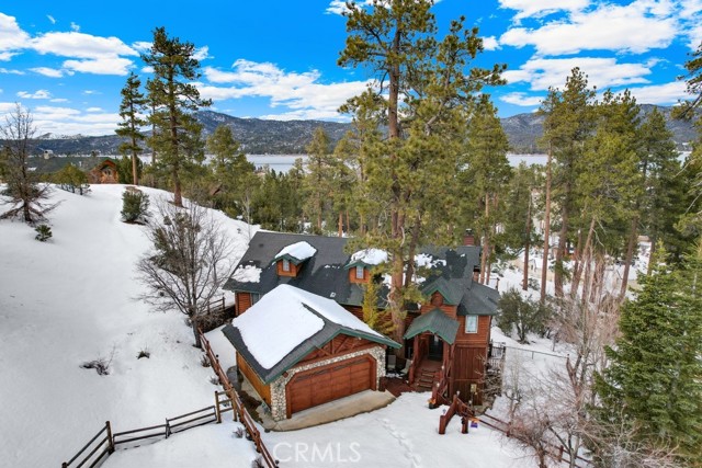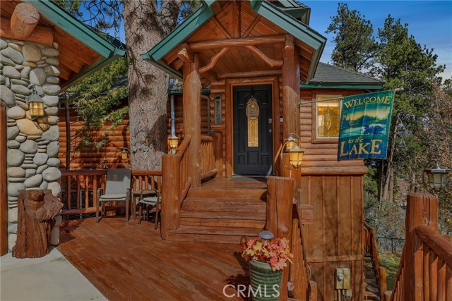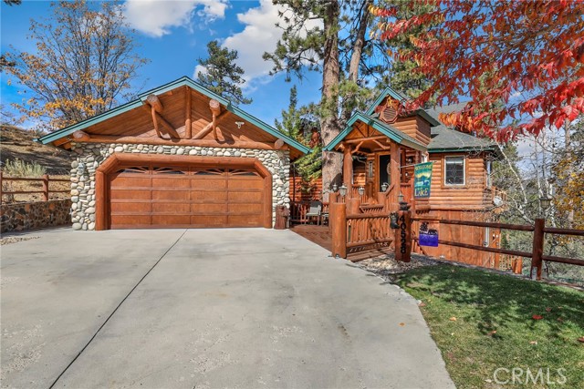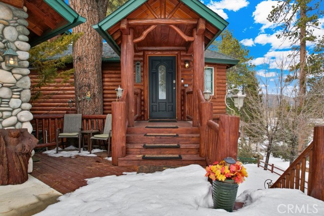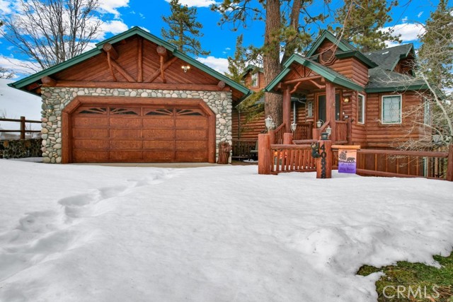 Welcome to the timeless charm of this classic mountain log cabin, a true retreat that embodies the essence of a rustic lodge. The two wrap-around balconies offer a Hot Tub, and access to the fenced yard, panoramic views of the surrounding woods, mountains, and the serene lake, to include lake fireworks shows from the privacy of your own balcony. The main level features an open floor plan. A pine log beams and trusses vaulted ceiling with a floor-to-ceiling stone fireplace in the living room adds warmth and character to the interior. The dining space seamlessly blends with the living room, creating a welcoming atmosphere for gatherings. The kitchen boasts granite counters and backsplash, pine cabinets, and offers a perfect space for entertaining. The main hallway leads to the primary suite, complete with an ensuite bathroom. Two secondary rooms share a full bathroom, providing ample space for everyone. Downstairs, you'll discover a family/game room, a primary bedroom with access door to the full bathroom, another bedroom, a study room, and even a sauna, making this lower level an ideal space for relaxation and recreation. A fenced area in the yard is perfect for pets and as a play area. The home is located in the highly desirable Ironwood Estates neighborhood on a quiet cul de sac. Minutes away from Big Bear Lake, the marina, and downtown shops and dining. This area offers an array of outdoor activities, no car needed to get to National forest hiking and biking trails, lake activities, and winter sports, ensuring that you can embrace the great outdoors in all seasons. This log cabin is more than a home; it's a retreat from the hustle and bustle of everyday life. Don't miss the opportunity to experience the charm of this mountain community. Schedule your viewing today and immerse yourself in the beauty of Big Bear Lake.