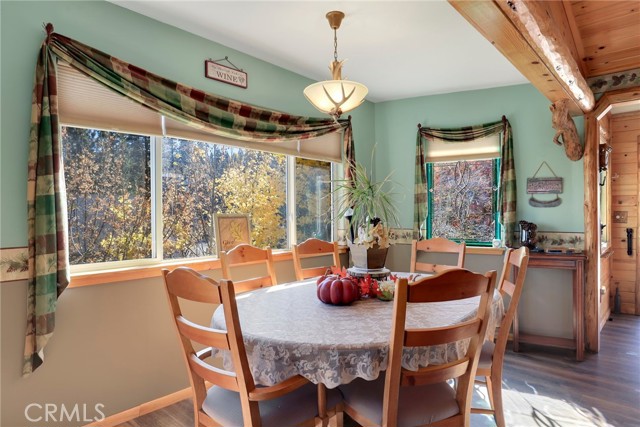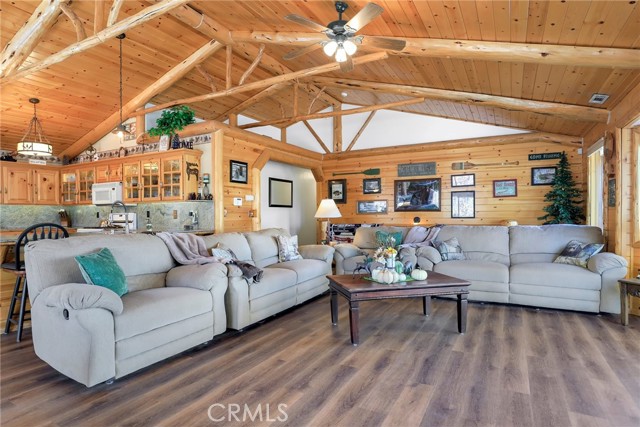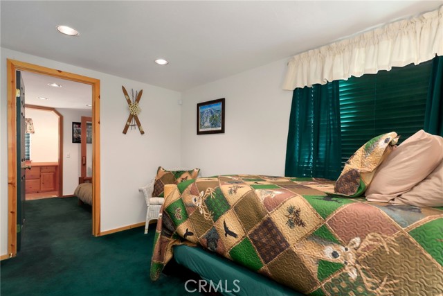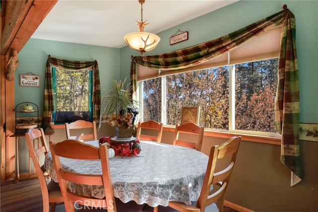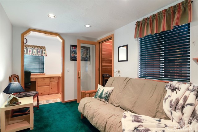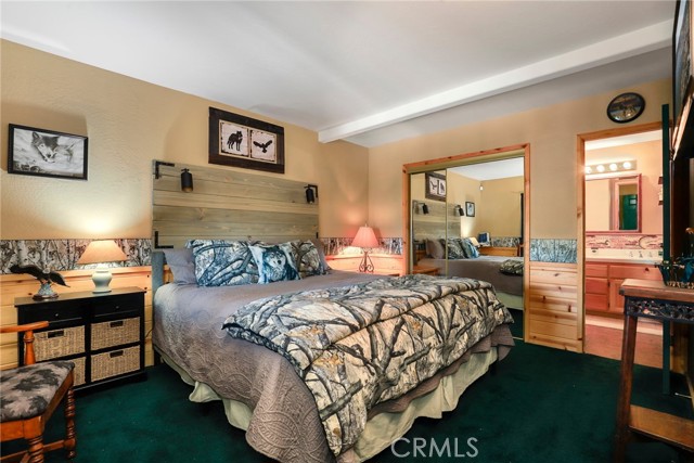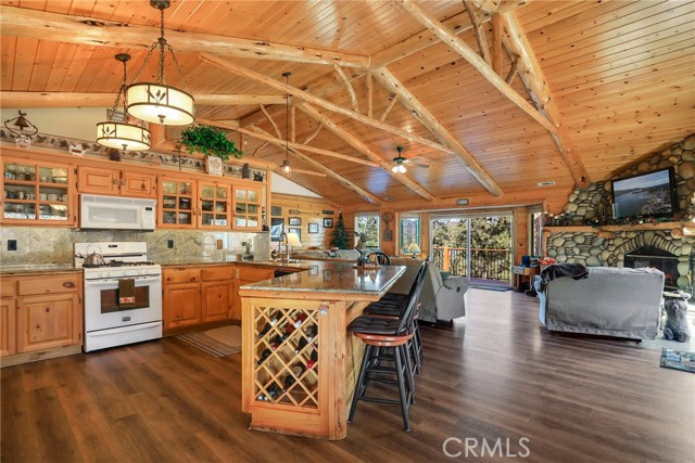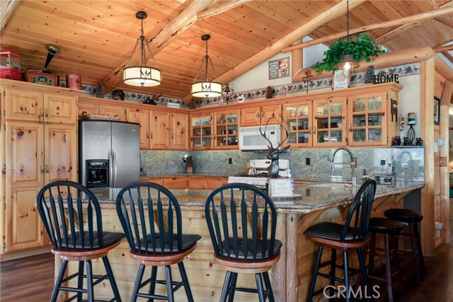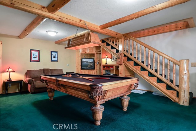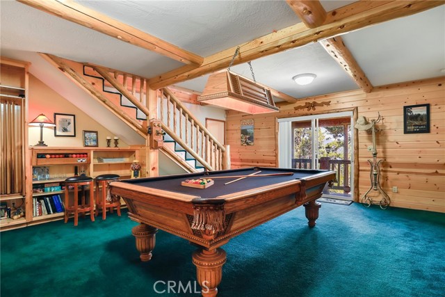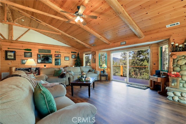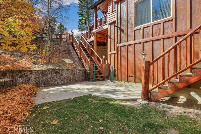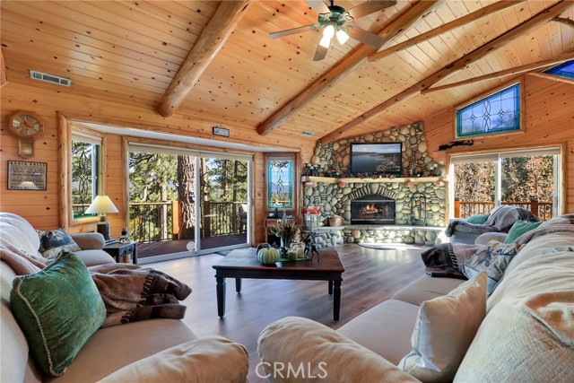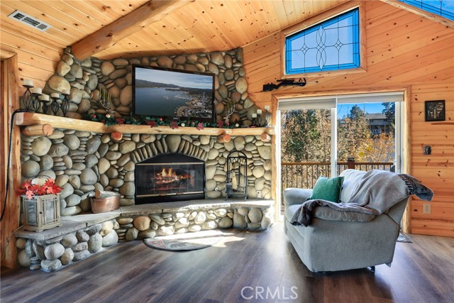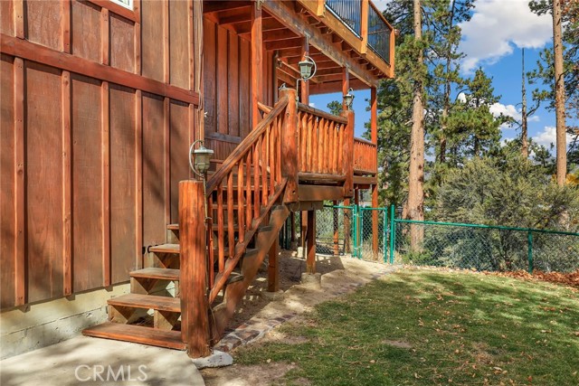 Welcome to the timeless charm of this classic mountain log cabin, a true retreat that embodies the essence of a rustic lodge. The two wrap-around balconies offer a Hot Tub, and access to the fenced yard, panoramic views of the surrounding woods, mountains, and the serene lake, to include lake fireworks shows from the privacy of your own balcony. The main level features an open floor plan. A pine log beams and trusses vaulted ceiling with a floor-to-ceiling stone fireplace in the living room adds warmth and character to the interior. The dining space seamlessly blends with the living room, creating a welcoming atmosphere for gatherings. The kitchen boasts granite counters and backsplash, pine cabinets, and offers a perfect space for entertaining. The main hallway leads to the primary suite, complete with an ensuite bathroom. Two secondary rooms share a full bathroom, providing ample space for everyone. Downstairs, you'll discover a family/game room, a primary bedroom with access door to the full bathroom, another bedroom, a study room, and even a sauna, making this lower level an ideal space for relaxation and recreation. A fenced area in the yard is perfect for pets and as a play area. The home is located in the highly desirable Ironwood Estates neighborhood on a quiet cul de sac. Minutes away from Big Bear Lake, the marina, and downtown shops and dining. This area offers an array of outdoor activities, no car needed to get to National forest hiking and biking trails, lake activities, and winter sports, ensuring that you can embrace the great outdoors in all seasons. This log cabin is more than a home; it's a retreat from the hustle and bustle of everyday life. Don't miss the opportunity to experience the charm of this mountain community. Schedule your viewing today and immerse yourself in the beauty of Big Bear Lake.