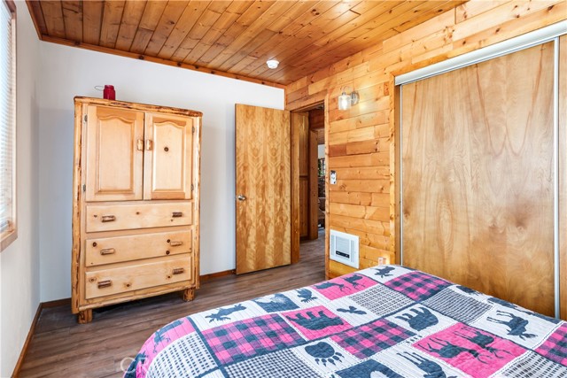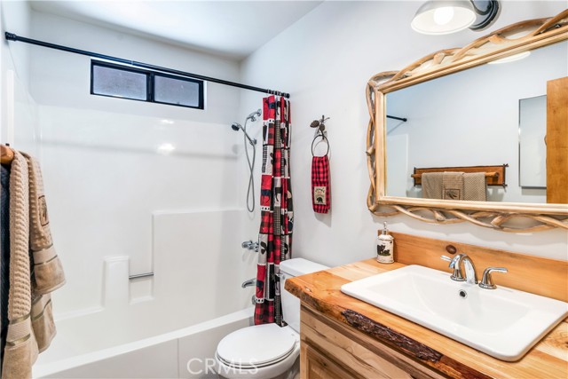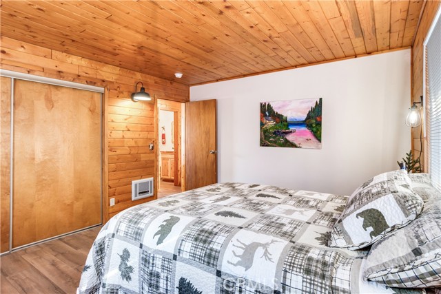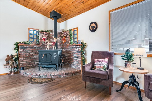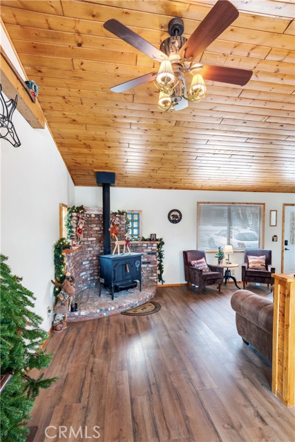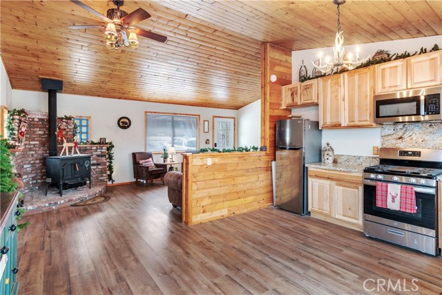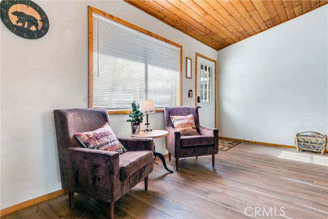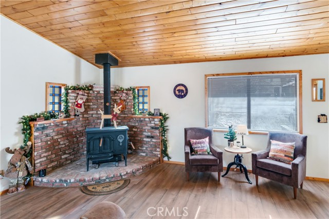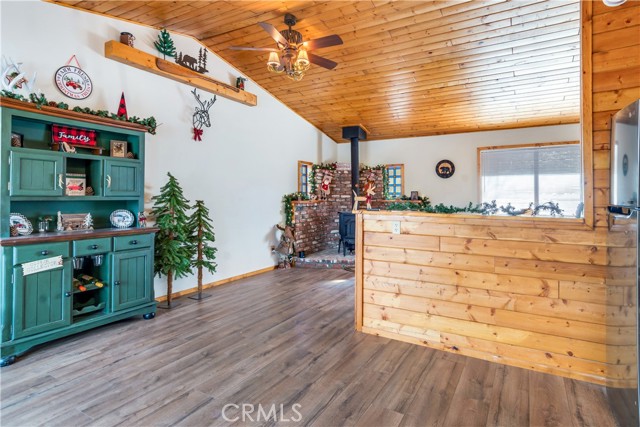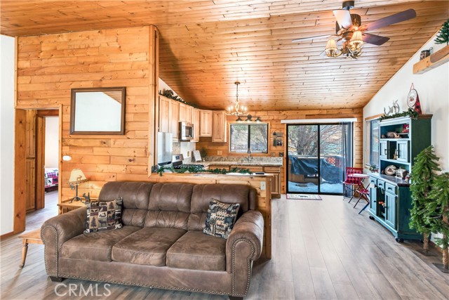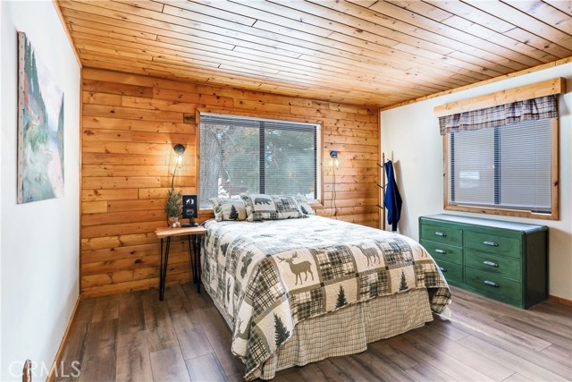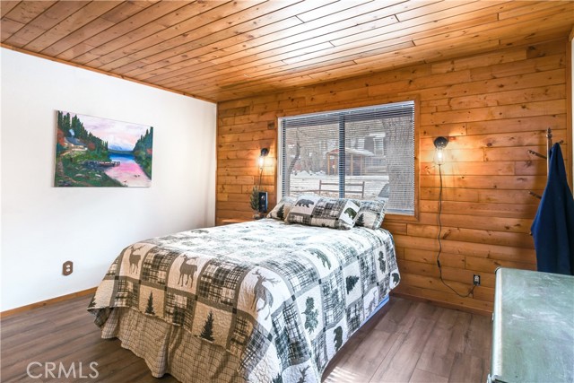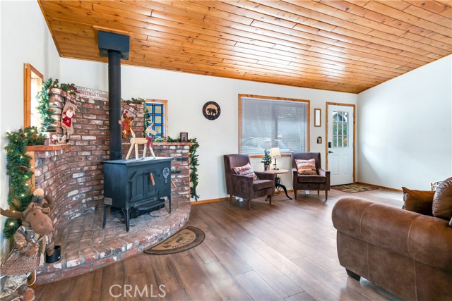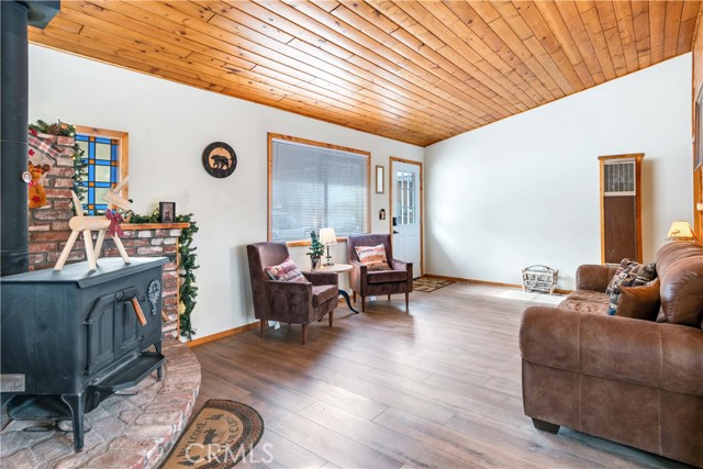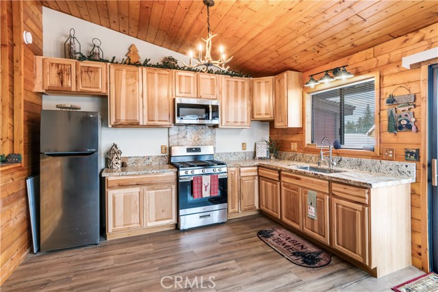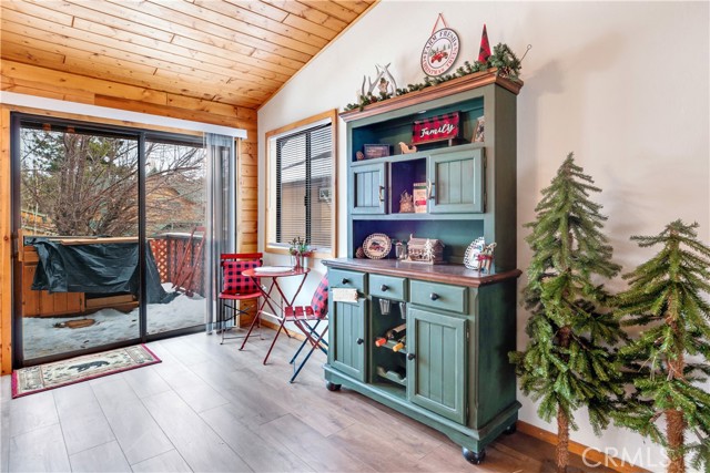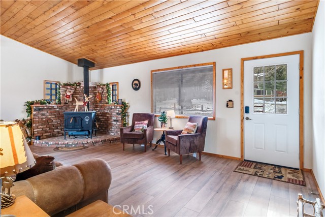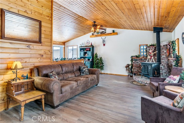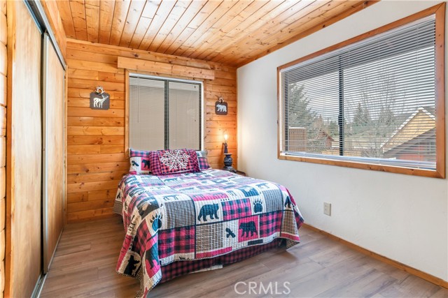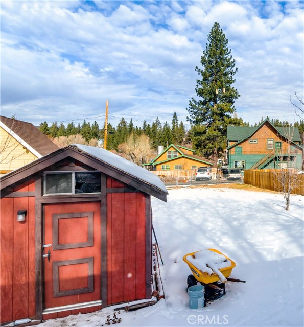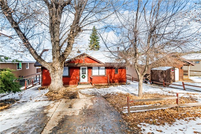 Location Location Location. Beautifully updated single story cabin located in Moonridge area one street behind the new Moonridge corridor and 4 minutes to Bear Mountain ski resort, would make a great vacation rental, vacation home or forever home. Features 2 bedrooms one bedroom is large enough for multiple beds. Brand new waterproof flooring throughout home, Large living room features wood burning stove for cozy snow days, tongue and groove wood ceilings, New updated modern kitchen with stainless steel appliances including built-in microwave, recessed can lighting throughout home. Storage building for extra space. HUGE backyard with a Deck off the kitchen for entertainment also has access from the back of the property for extra parking, Boat or RV . This is a must see property