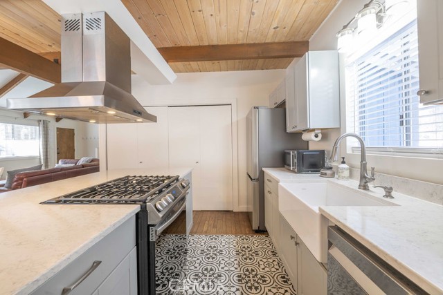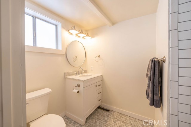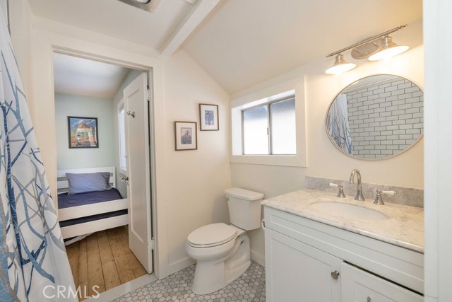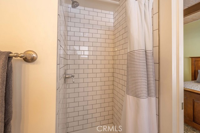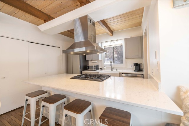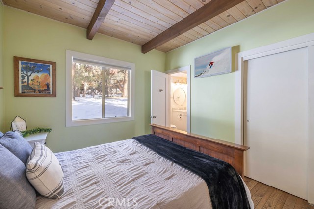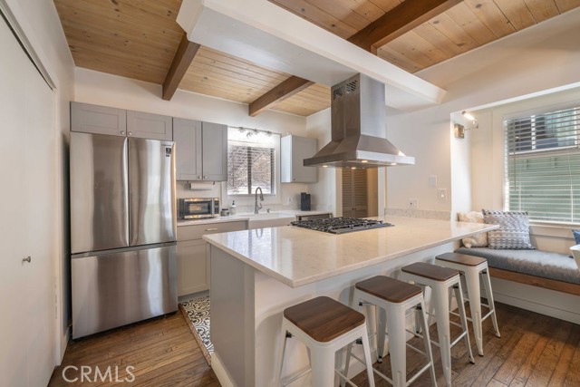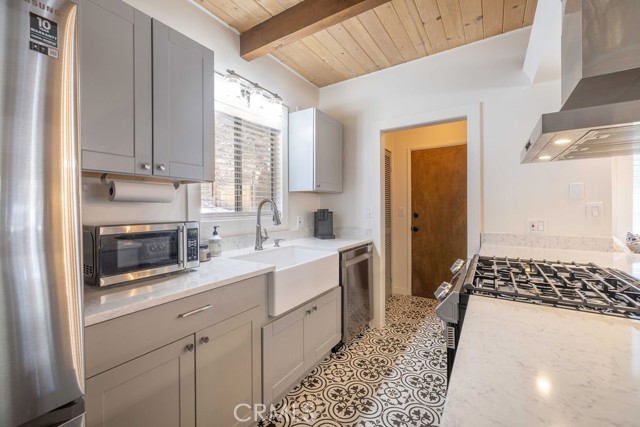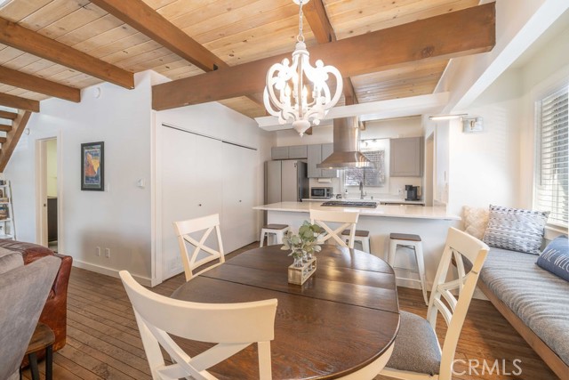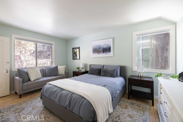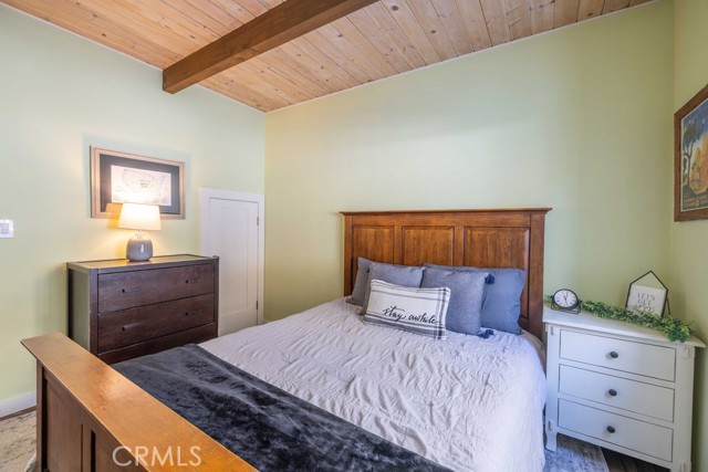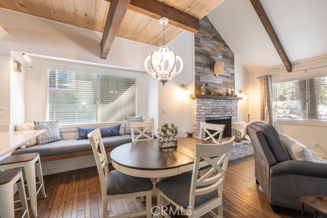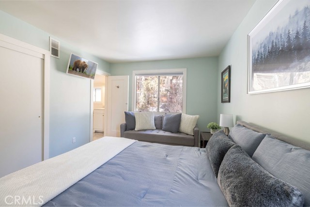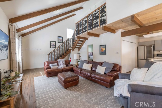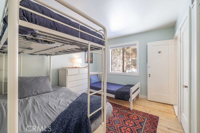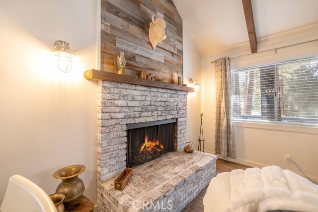 Welcome to your vintage meets modern Big Bear getaway! Walking in you’re greeted by vaulted exposed beam ceilings with a floor to ceiling fireplace beautifully updated and adorned with local Big Bear copper antiques! The staircase landing brings nature indoors with a metal silhouette mural of a bear and two her cubs frolicking in the Big Bear mountains. Framing the stairs diagonally is a brand new custom made steel railing that gives ode to the National Park Service’s uniform Sequoia cone dating back to the 1930’s. The kitchen has new cabinetry, stainless steel appliances, porcelain tile floors, and quartz countertops that are completed with a farmhouse sink and a touch activated faucet! With a master suite downstairs and two additional bedrooms and full bathroom upstairs, the customization doesn’t stop there! All bathrooms have mosaic marble flooring, brand new fixtures and timeless subway tiled showers! Don’t miss the solid wood shaker bedroom doors from an L.A. turn of the century home showcasing historic glass knobs. This fully customized home is walking distance to all things Moonridge, including the Big Bear Zoo, coffee shops and Bear Mountain parking for all of your mountain wants and needs!
