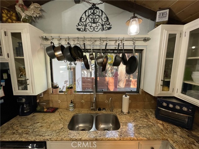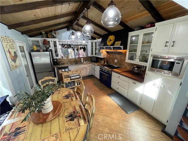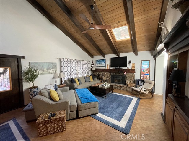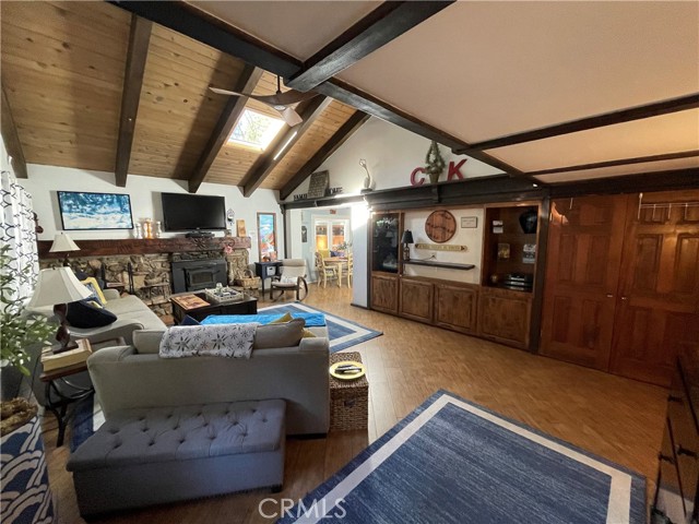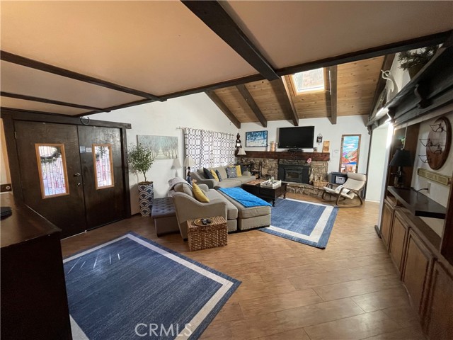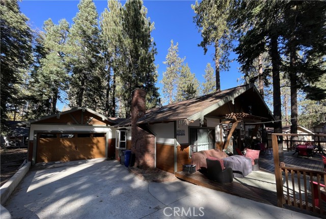 This well-maintained chalet in the San Bernardino mountains is a gem of a cabin! Surrounded by towering pine trees on a quiet Mountain Street, this gorgeous home is located in lower Moonridge close to Bear Mountain ski resort, the Big Bear Golf Course, and the Moonridge Zoo. It boasts 3 bedrooms and 2 bathrooms with a large game room and plenty of outdoor entertaining areas with fire pits and BBQ to host any party. You walk into a large living area with a beautiful, native Big Bear rock fireplace and exquisite mantle. This living space has high peak ceilings with skylights and exposed, dark wood beams are mirrored in the roomy updated eat-in chef style kitchen with granite and butcher block countertops and updated appliances. Wood floors and a mountain scene-stained glass window complete these living areas. This turn-key beauty has modern touches, but maintains the comfy, mountain cabin feel. Both updated bathrooms are spacious full bathrooms, close to all 3 bedrooms. A long driveway leads to the 2-car attached garage. There is a steamy hot tub to enjoy after a day on the slopes and a greenhouse in the backyard of the property to grow all those tasty fruits and vegetables from spring to fall!