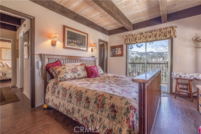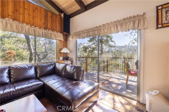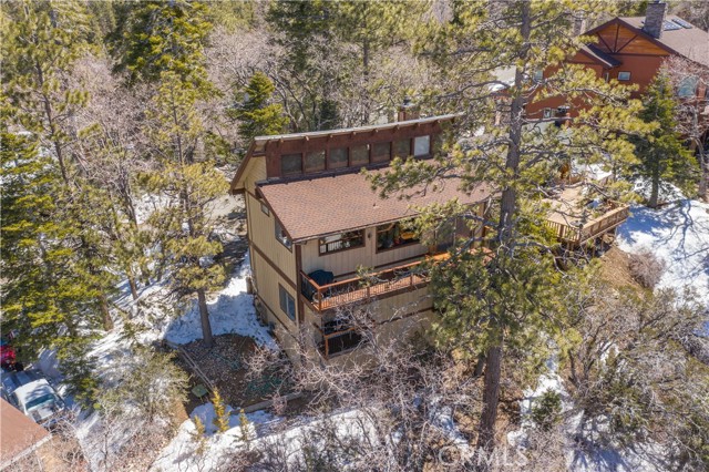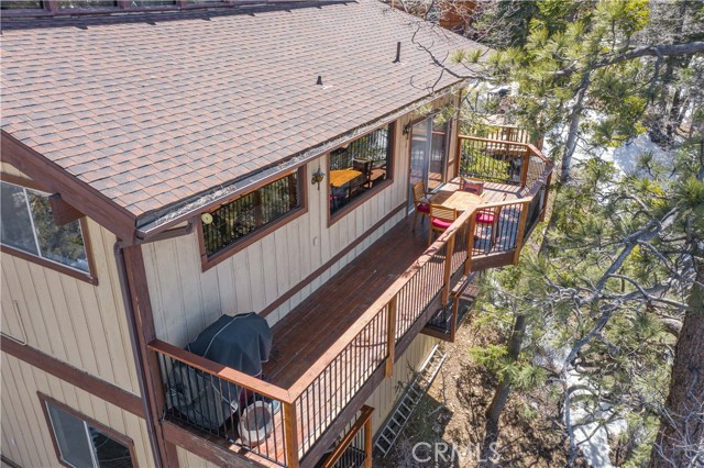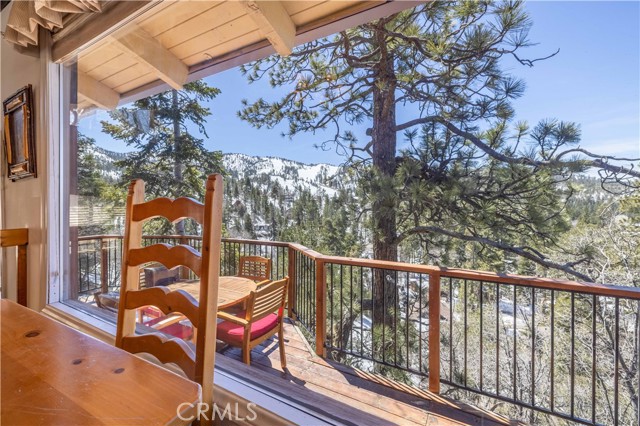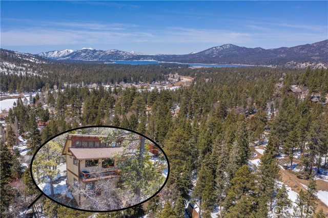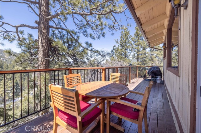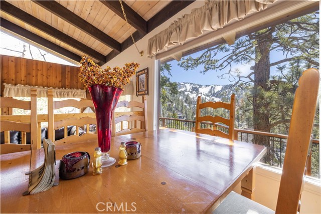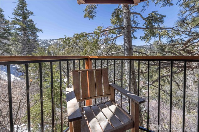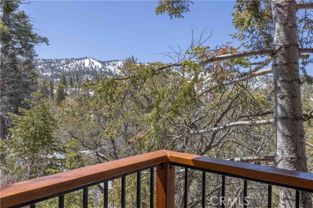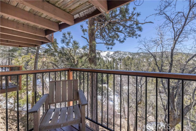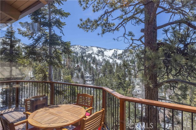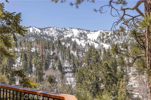 Enjoy the magnificent view of ski slopes and Big Bear Valley from this Moonridge cabin nestled in old growth trees. Upper level has an open floor plan with a spacious living room, approximately twenty-foot ceilings with massive wooden beams, an elevated dining area, a guest room or office, and large picture windows. Outside there’s an approximately 35-foot deck with a 180-degree panoramic view. Back inside the cook gets to take in the view from a kitchen with solid maple cabinets. A big stone fireplace will keep you warm in winter, in summer you’ll be cooled by the Moonridge breezes blowing through the many windows. The downstairs has three bedrooms, two with their own balconies, and the master suite has a walk-in closet and Jack- and-Jill bathroom. Mudroom, laundry room, and an upstairs loft complete this wonderful mountain home. And there’s even a friendly raccoon family living right off the deck! You will never get tired of this view!