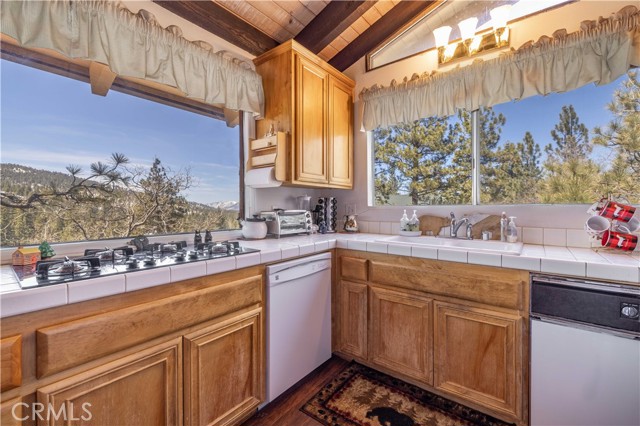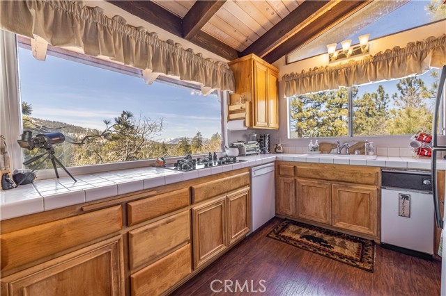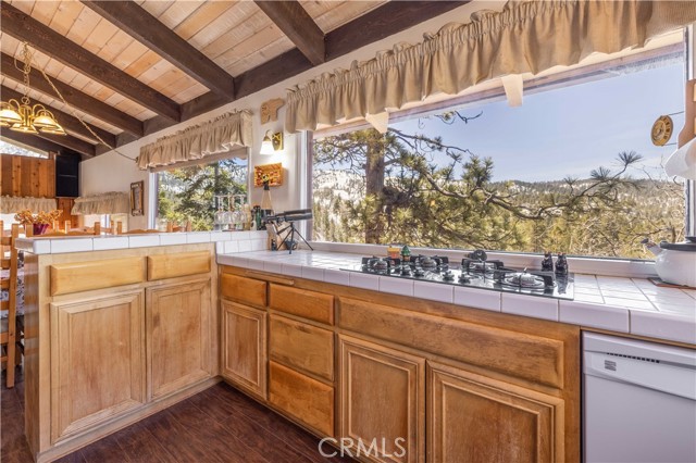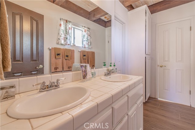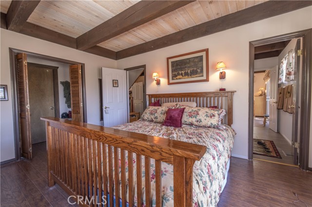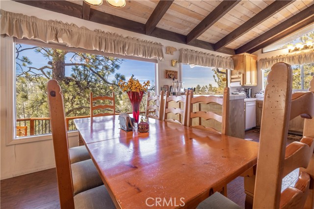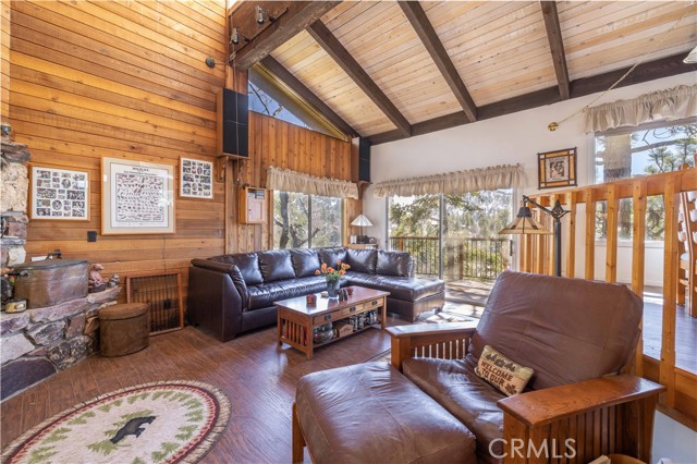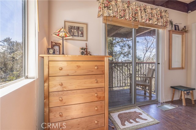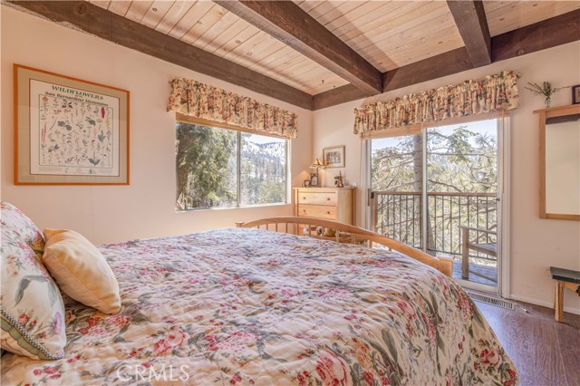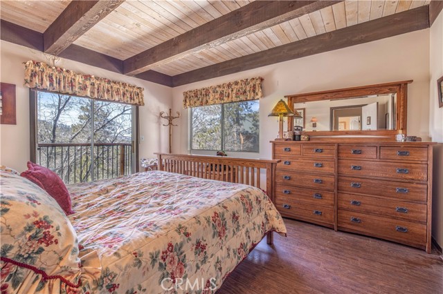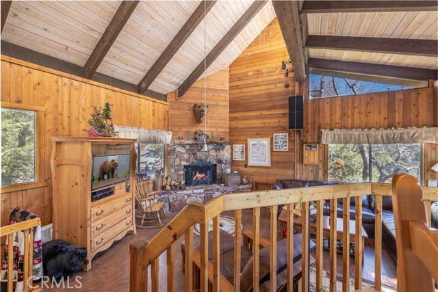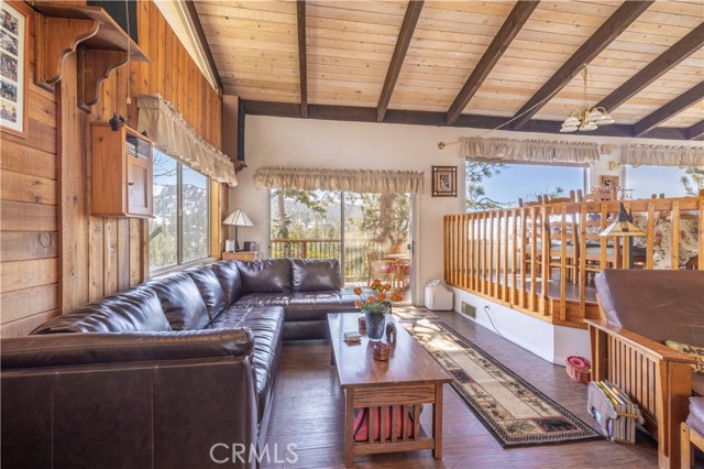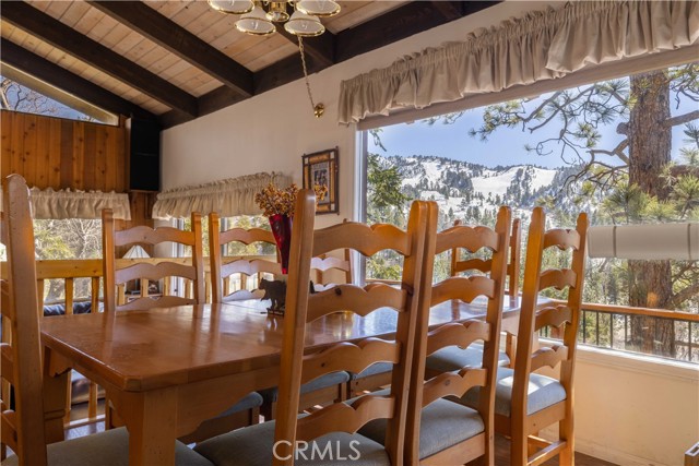 Enjoy the magnificent view of ski slopes and Big Bear Valley from this Moonridge cabin nestled in old growth trees. Upper level has an open floor plan with a spacious living room, approximately twenty-foot ceilings with massive wooden beams, an elevated dining area, a guest room or office, and large picture windows. Outside there’s an approximately 35-foot deck with a 180-degree panoramic view. Back inside the cook gets to take in the view from a kitchen with solid maple cabinets. A big stone fireplace will keep you warm in winter, in summer you’ll be cooled by the Moonridge breezes blowing through the many windows. The downstairs has three bedrooms, two with their own balconies, and the master suite has a walk-in closet and Jack- and-Jill bathroom. Mudroom, laundry room, and an upstairs loft complete this wonderful mountain home. And there’s even a friendly raccoon family living right off the deck! You will never get tired of this view!