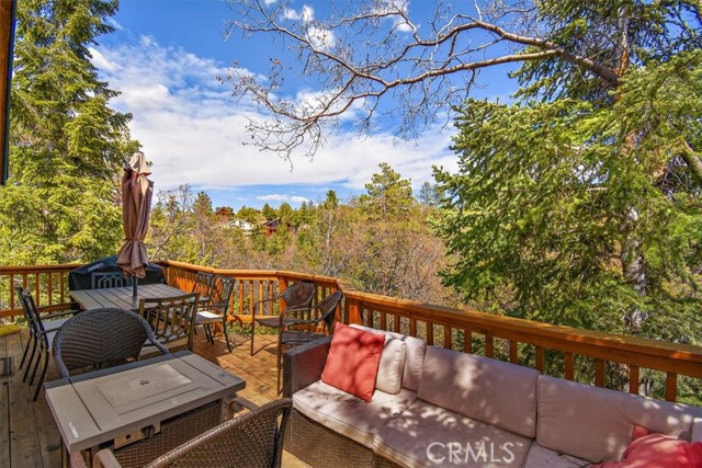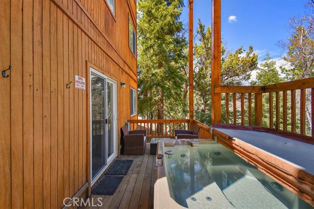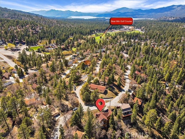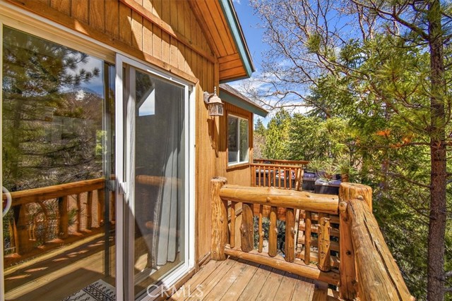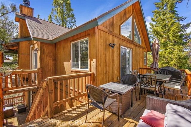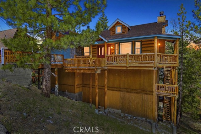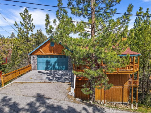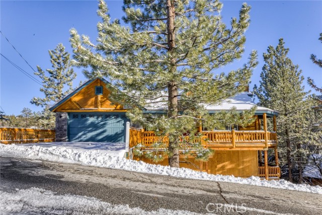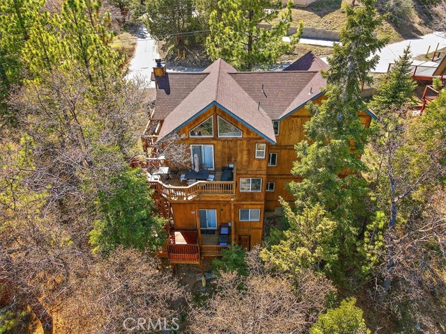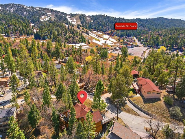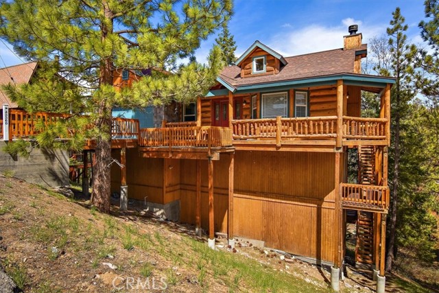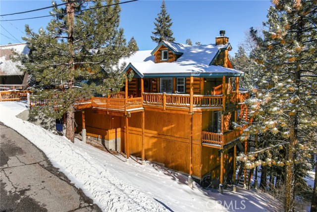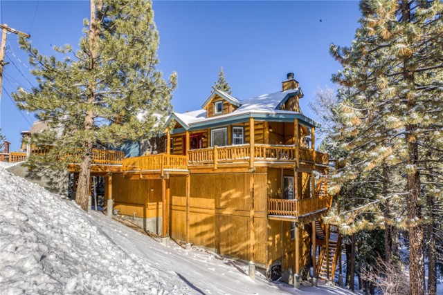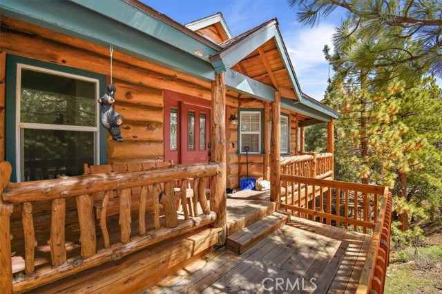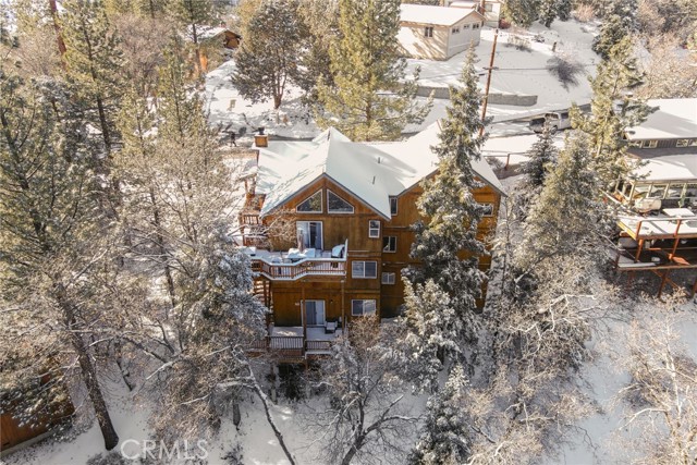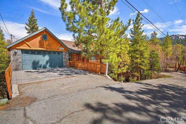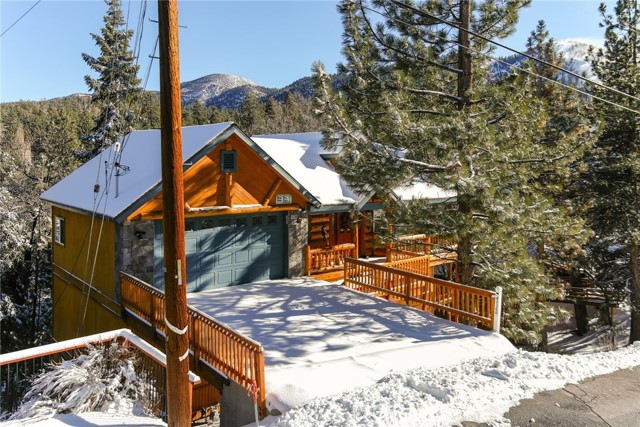 Immerse yourself in a mountain escape with this exquisite log-style home located in the charming Moonridge neighborhood. This exceptional residence offers 5 bedrooms, 3 1/2 bathrooms, a spacious family/game room, and an open main-level floor plan adorned with vaulted truss-ceilings. Embracing the perfect fusion of rustic charm and modern conveniences, the home showcases new wood flooring, a captivating rock fireplace, granite counters, and brand-new stainless steel appliances. Stay comfortable throughout the seasons with central forced air heating and air conditioning, and indulge in relaxation with a jetted tub in the master bath. Additional features include mirrored wardrobe closets, convenient laundry facilities, an outdoor spa, expansive redwood decking, and a convenient street-level 2-car attached garage. Nestled on a well-treed, 8,400 sq ft lot, this property is only a few blocks from the Bear Mountain ski area. This remarkable home presents an ideal opportunity as a vacation or a short-term/long-term rental, with a gross income of $145,000 in 2022 and $65,000 year-to-date for 2023. The property comes fully furnished and underwent remodeling in 2021, boasting arcade games, updated bathrooms, high-end finishes, and tastefully selected decor and furniture. As one of Big Bear's established luxury short-term rentals, this property stands out as one of the top offerings available. Don't miss out on this exceptional opportunity to own a piece of mountain paradise.