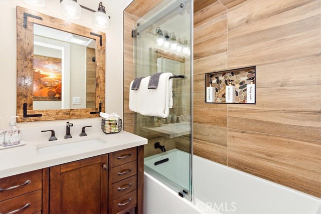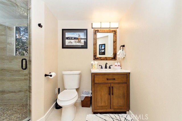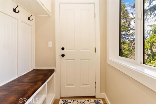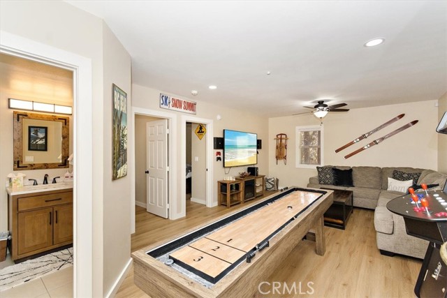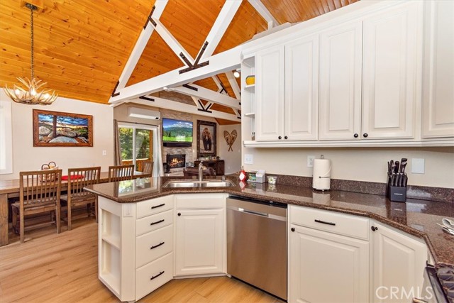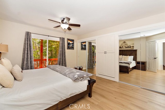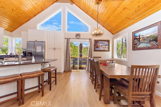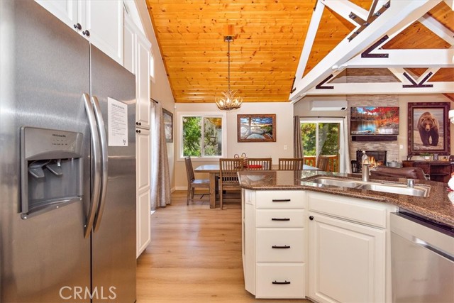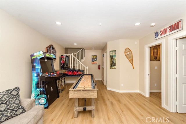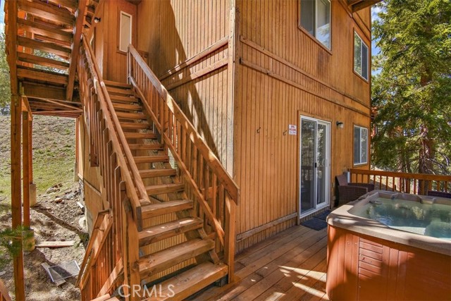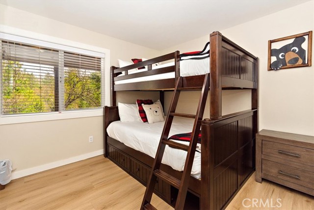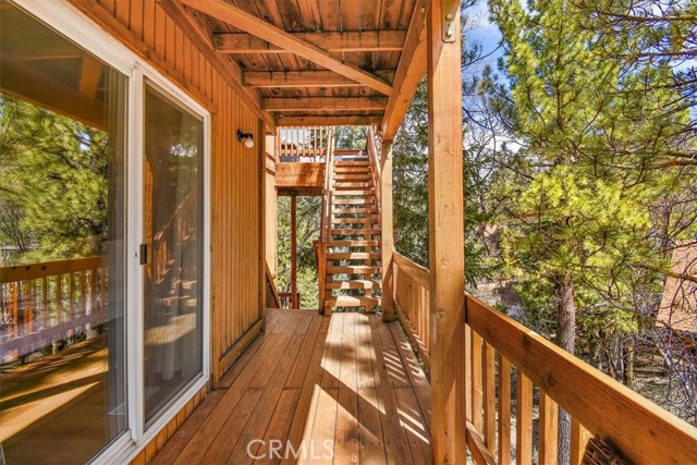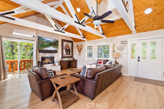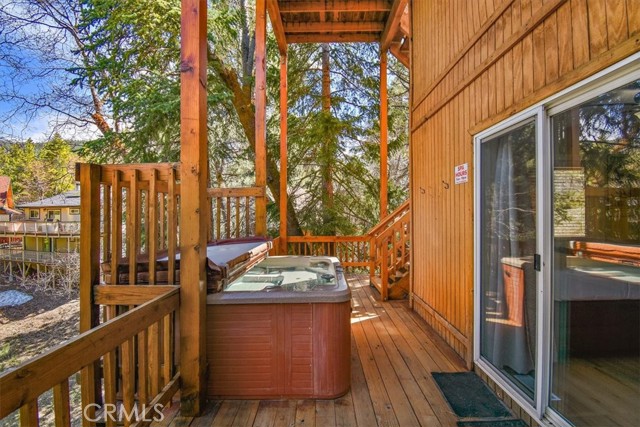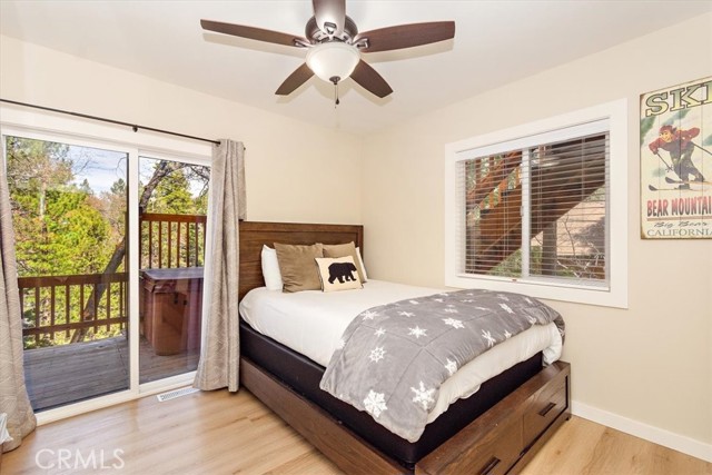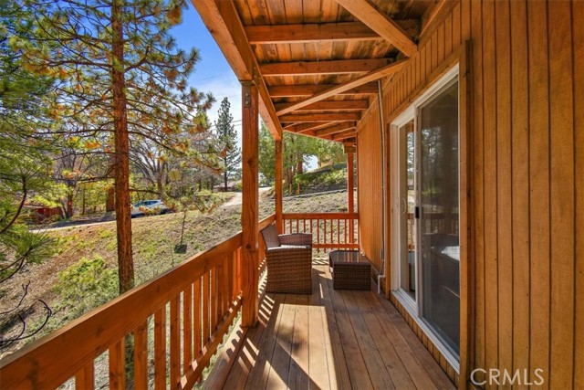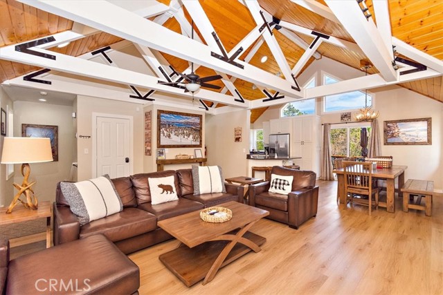 Immerse yourself in a mountain escape with this exquisite log-style home located in the charming Moonridge neighborhood. This exceptional residence offers 5 bedrooms, 3 1/2 bathrooms, a spacious family/game room, and an open main-level floor plan adorned with vaulted truss-ceilings. Embracing the perfect fusion of rustic charm and modern conveniences, the home showcases new wood flooring, a captivating rock fireplace, granite counters, and brand-new stainless steel appliances. Stay comfortable throughout the seasons with central forced air heating and air conditioning, and indulge in relaxation with a jetted tub in the master bath. Additional features include mirrored wardrobe closets, convenient laundry facilities, an outdoor spa, expansive redwood decking, and a convenient street-level 2-car attached garage. Nestled on a well-treed, 8,400 sq ft lot, this property is only a few blocks from the Bear Mountain ski area. This remarkable home presents an ideal opportunity as a vacation or a short-term/long-term rental, with a gross income of $145,000 in 2022 and $65,000 year-to-date for 2023. The property comes fully furnished and underwent remodeling in 2021, boasting arcade games, updated bathrooms, high-end finishes, and tastefully selected decor and furniture. As one of Big Bear's established luxury short-term rentals, this property stands out as one of the top offerings available. Don't miss out on this exceptional opportunity to own a piece of mountain paradise.