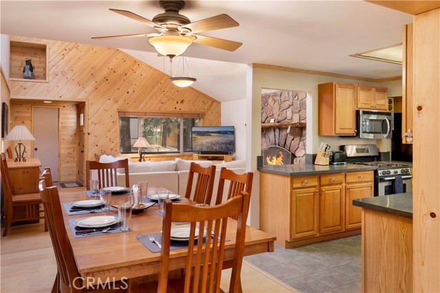 Just a stone’s throw from Snow Summit Ski Resort, this single-level home presents an open concept living area that's both inviting and stylish, with a vaulted ceiling and skylights that drench the space in natural light. The heartbeat of this space is the native rock wood-burning fireplace, perfect for those chilly mountain evenings. With three comfortable bedrooms and two full bathrooms, the master suite is particularly noteworthy, offering T&G walls that add a touch of mountain chic, while the spacious master bath promises relaxation with its jetted tub and separate shower. The kitchen, equipped with stainless appliances and ample storage, flows seamlessly into the dining area. Convenience is key in this home, with full laundry facilities discreetly located off the kitchen. There is added peace of mind provided by a new furnace. The covered front porch and back deck offer additional spaces for relaxation. A paved walkway leads to the new hot tub, a perfect retreat after a day of adventure. This centrally located gem is the epitome of easy mountain living with its year-round, level access and proximity to Big Bear’s most renowned attractions including the lake and Village. Fully furnished and turnkey, this home is not only a personal retreat but also an established vacation rental. All the amenities you need for a memorable stay are included, leaving you nothing more to do than to bring your suitcase and start enjoying mountain life at its finest.