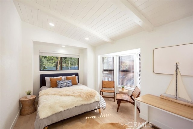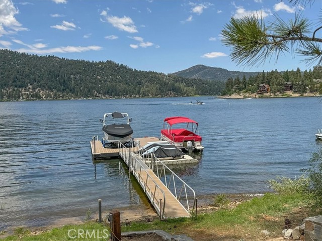Experience Contemporary Lakefront living at its BEST in this meticulously renovated 4 Bedroom, 3 Bath home, professionally designed to be an amazing contemporary lakefront retreat while boasting over 60 feet of DEEP-WATER lake frontage. The heart of this home is the magnificent wall of glass in the remarkable great room offering stunning panoramic views of Big Bear Lake and the majestic trees & mountains beyond. Imagine waking up to the glass-like shimmer of the lake in the morning or experiencing the wondrous starlit Big Bear sky at night. The expansive deck offers an invitation to relax & enjoy while providing front-row seats to the beauty of nature and fun of the lake. Whether enjoying the warmth of the sun, immersing in a great book or hosting friends for dinner, every moment on this deck is unforgettable! The recently installed central heat & air conditioning allows the home to be comfortable year round. The chef-inspired kitchen features a Wolf Range and high-end stainless-steel appliances & the adjacent butler-style pantry with a 2nd refrigerator allows entertaining with ease. Descend the gracefully designed backyard stairs to discover more of this lively lakefront escape. Here awaits a cozy fire pit, a wonderful spot to connect with friends or family, a spacious grass play area fun for kids & adults, while lounge chairs on the pristine sandy beach offer the invitation to soak up the sun and the sound of water gently lapping the shoreline. Winter transforms the landscape into a magical wonderland, with the lake as a stunning backdrop. A new composition shingle roof crowns this home with the addition of engineered hardwood floors, Quartz counters upgraded electrical, LED recessed lighting, skylights + a new security system providing peace of mind for years to come. In the expansive great room, nestled between the kitchen & living area, a captivating dining space unfolds. The expansive round dining table effortlessly commands attention, enhanced by the high ceiling & dramatic light fixture that adds to the WOW factor. Surrounding it are chairs that strike a balance between beauty & whimsy! Whether you're navigating the lake by boat~kayak~paddleboard, or enjoying activities like wakeboarding or waterskiing, this homes low maintenance 2-slip dock w/boat lift & room for PWCs or water toys provides the perfect launchpad for aquatic adventures! Most of the homes beautifully curated furnishings are included so you can Begin your BIG BEAR DREAM right away!