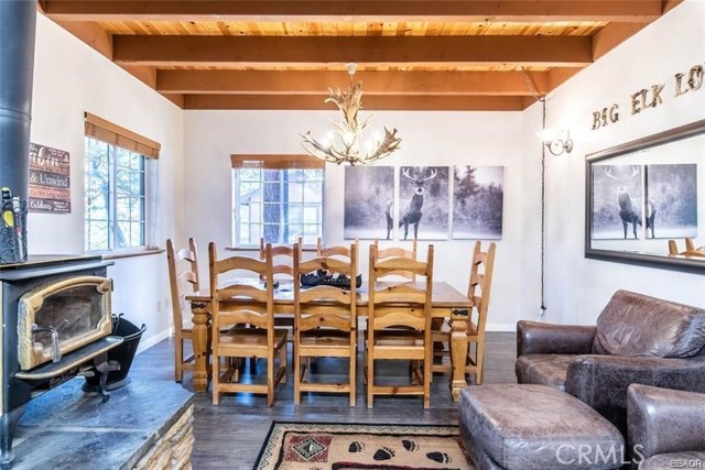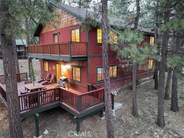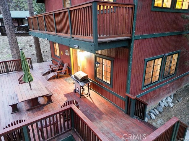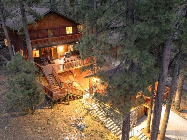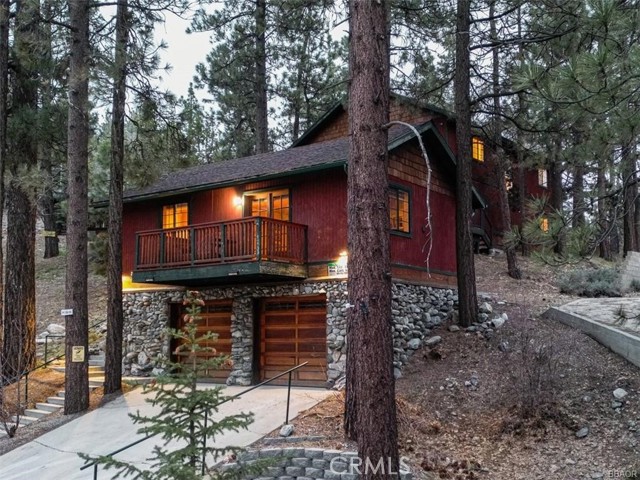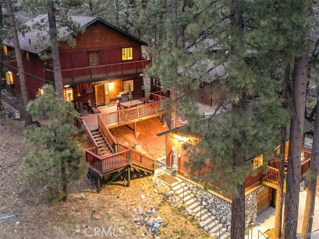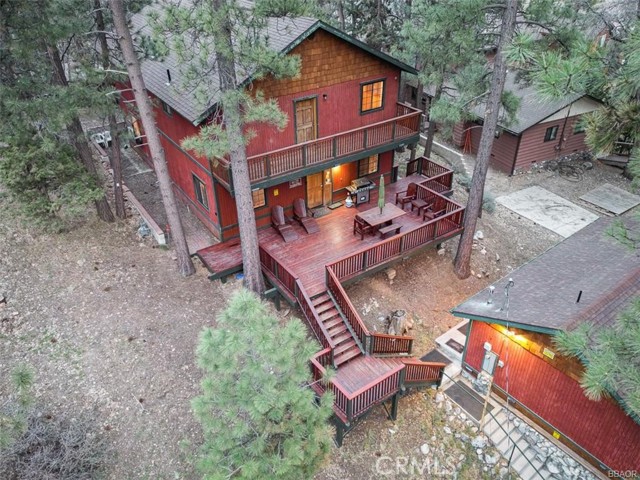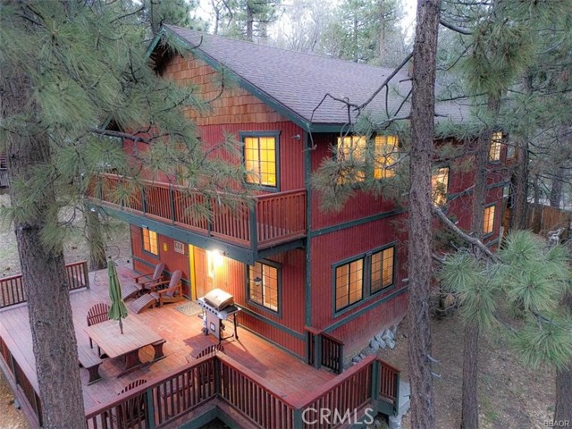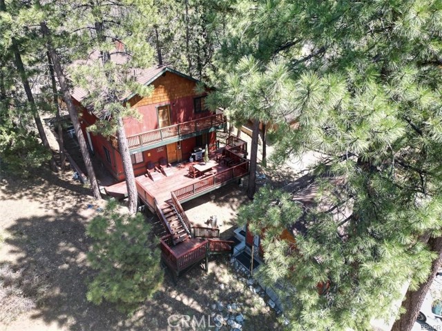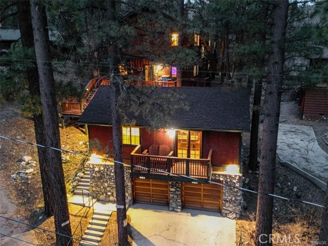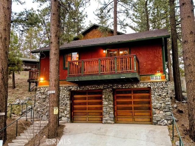 Beautiful 4-bedroom Chalet Style Mountain Cabin! Located on a cul-de-sac with a secluded setting and stunning views of the surrounding treetops with peekaboo ski slope views. The cabin features extensive decking off three of the bedrooms, a quiet backyard with a spa, and newer flooring. The main cabin downstairs includes a spacious living room with wood ceilings and tiled flooring, a separate "card room", a large upgraded kitchen with a wood countertop island/breakfast bar, and an adjacent large dining room complete with a wood burning stove and access to the backyard. Upstairs, there are 3 bedrooms and 2 baths, including a large primary bedroom. In addition to the main cabin, there is a 4th bedroom/Game Room/bunkhouse located above the detached garage off the front deck. This additional space features a kitchenette, bathroom, 6 beds, pool table, and deck, making it a great space for guests or entertaining. The oversized garage is made with river rock and provides plenty of storage space, as well as room to park. This cabin is less than a mile from the Bear Mountain Ski Resort and Golf course, with National Forest/Trails. Overall, this property is an excellent vacation rental opportunity for the current owner, offering guests a peaceful and secluded setting with easy access to nearby attractions and activities.
