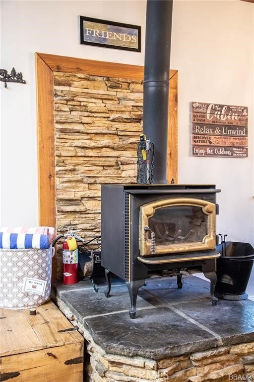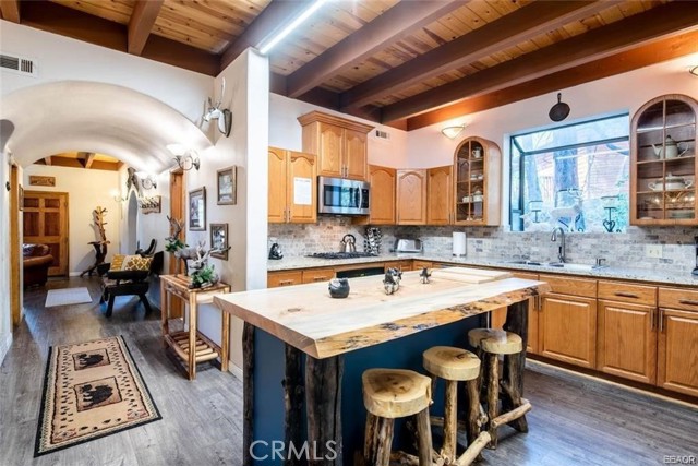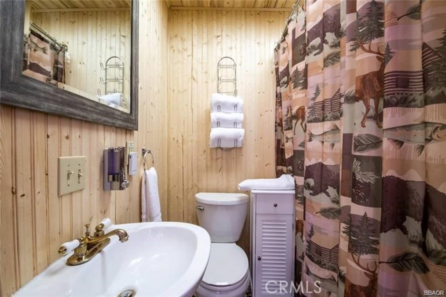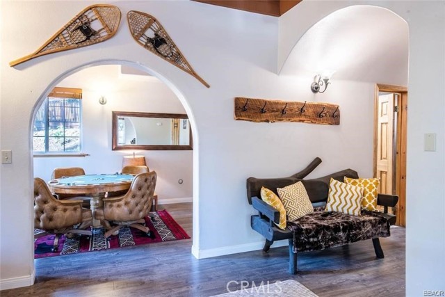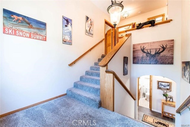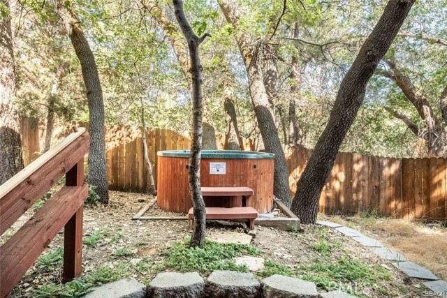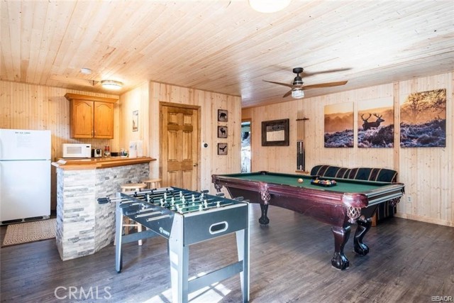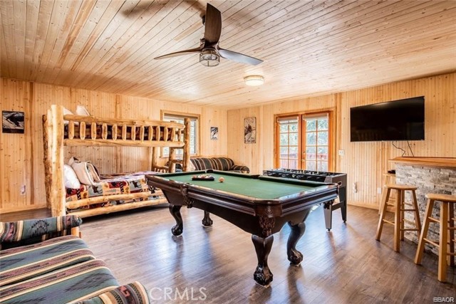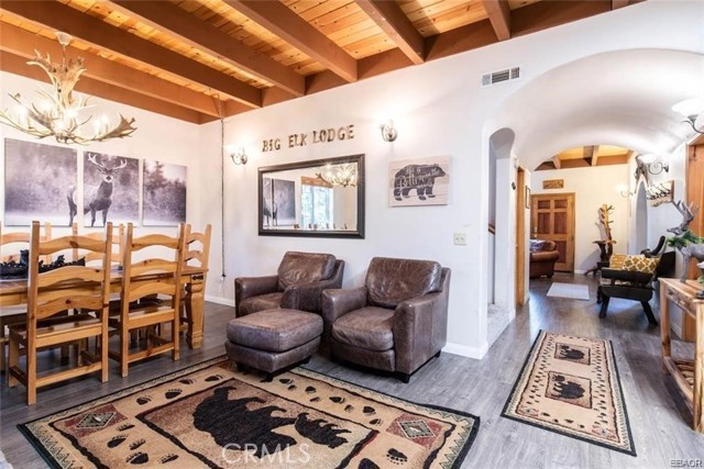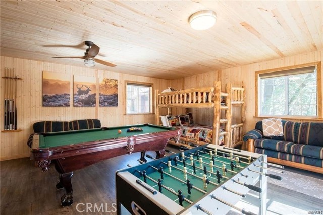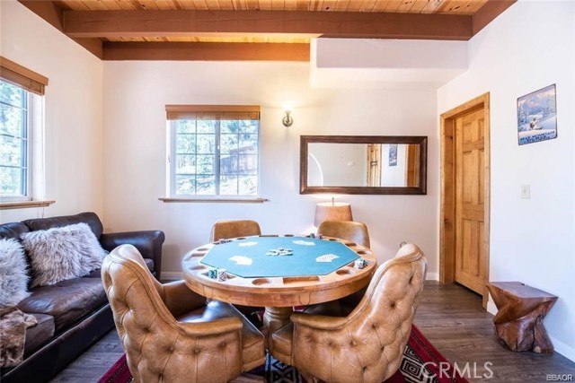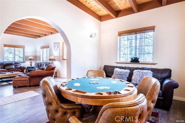 Beautiful 4-bedroom Chalet Style Mountain Cabin! Located on a cul-de-sac with a secluded setting and stunning views of the surrounding treetops with peekaboo ski slope views. The cabin features extensive decking off three of the bedrooms, a quiet backyard with a spa, and newer flooring. The main cabin downstairs includes a spacious living room with wood ceilings and tiled flooring, a separate "card room", a large upgraded kitchen with a wood countertop island/breakfast bar, and an adjacent large dining room complete with a wood burning stove and access to the backyard. Upstairs, there are 3 bedrooms and 2 baths, including a large primary bedroom. In addition to the main cabin, there is a 4th bedroom/Game Room/bunkhouse located above the detached garage off the front deck. This additional space features a kitchenette, bathroom, 6 beds, pool table, and deck, making it a great space for guests or entertaining. The oversized garage is made with river rock and provides plenty of storage space, as well as room to park. This cabin is less than a mile from the Bear Mountain Ski Resort and Golf course, with National Forest/Trails. Overall, this property is an excellent vacation rental opportunity for the current owner, offering guests a peaceful and secluded setting with easy access to nearby attractions and activities.