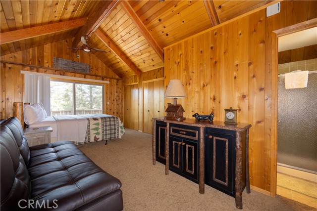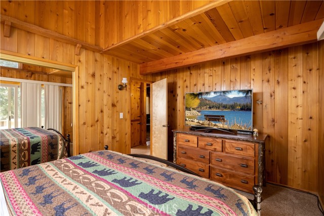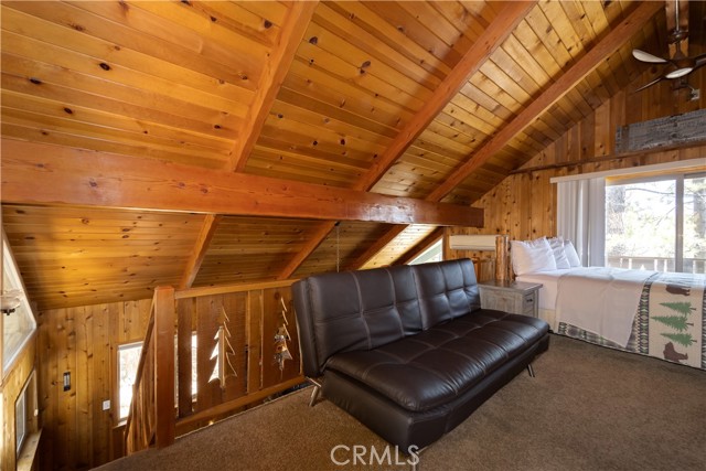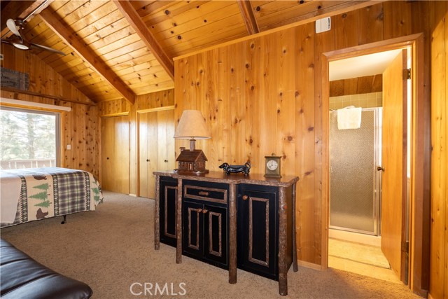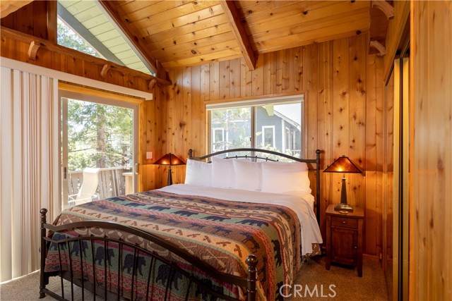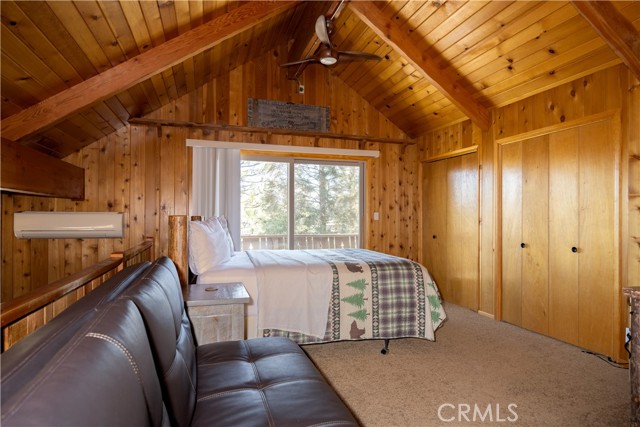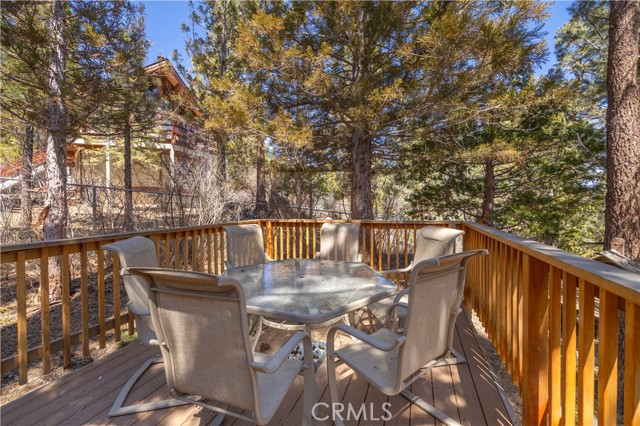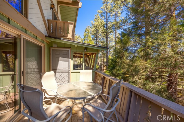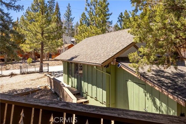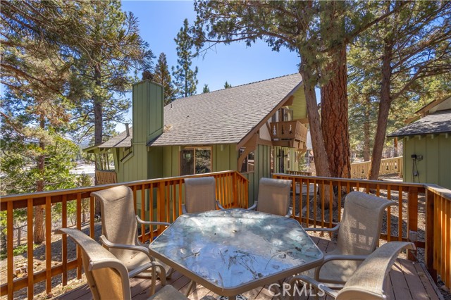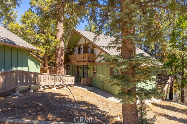 This charming Chalet-style home in Whispering Forest is custom-built and boasts a spacious bedroom with a balcony on the main level, along with a full bath and separate laundry room. Upstairs, you'll find a large loft area that serves as the second bedroom, complete with two balconies. This mountain home is well-appointed with granite countertops, high-end appliances, dual pane windows, a Mitsubishi A/C unit, central heat, a rock fireplace, composite decking, and more. The large two-car garage includes a workshop and storage space. Additionally, there is a bonus room below the main floor with a room and a 1/2 bath, which is approximately 260 sq ft and not included in the total square footage. This home may be perfect for those seeking an investment property or a peaceful retreat. It comes fully furnished with easy access to the lake, East Boat Ramp, Big Bear City Convention Center, shopping, restaurants, and hiking trails. You can also reach Snow Summit or Bear Mountain Ski Resorts within minutes.