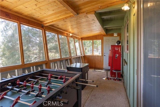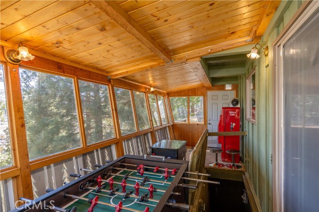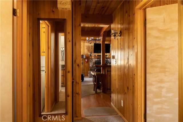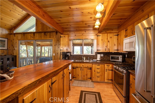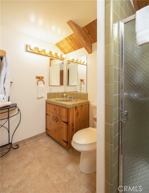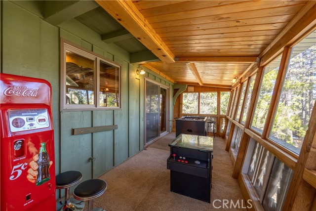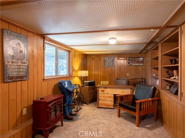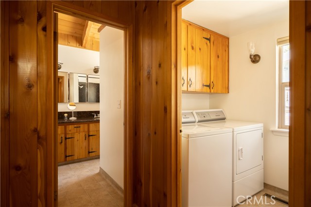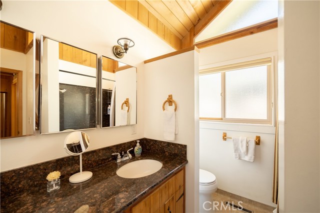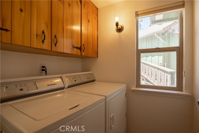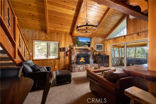 This charming Chalet-style home in Whispering Forest is custom-built and boasts a spacious bedroom with a balcony on the main level, along with a full bath and separate laundry room. Upstairs, you'll find a large loft area that serves as the second bedroom, complete with two balconies. This mountain home is well-appointed with granite countertops, high-end appliances, dual pane windows, a Mitsubishi A/C unit, central heat, a rock fireplace, composite decking, and more. The large two-car garage includes a workshop and storage space. Additionally, there is a bonus room below the main floor with a room and a 1/2 bath, which is approximately 260 sq ft and not included in the total square footage. This home may be perfect for those seeking an investment property or a peaceful retreat. It comes fully furnished with easy access to the lake, East Boat Ramp, Big Bear City Convention Center, shopping, restaurants, and hiking trails. You can also reach Snow Summit or Bear Mountain Ski Resorts within minutes.