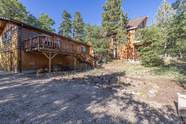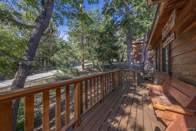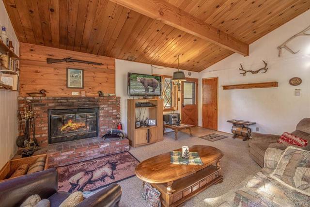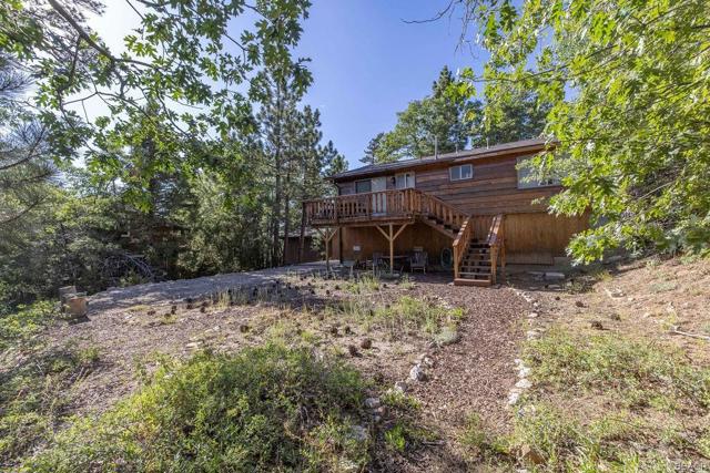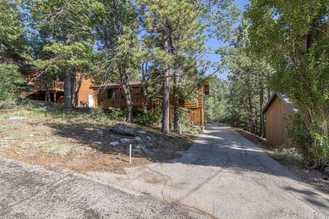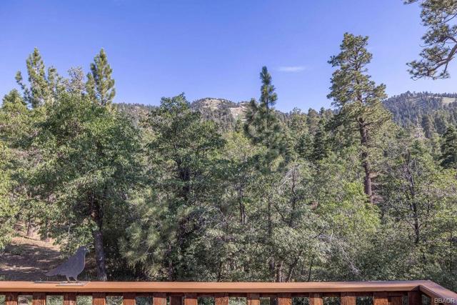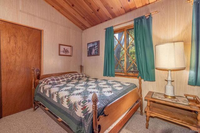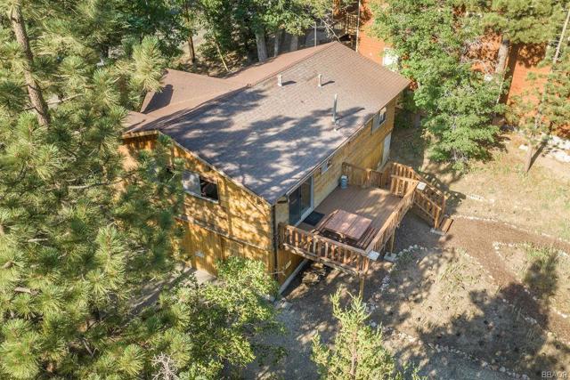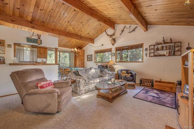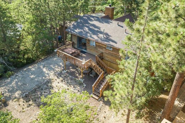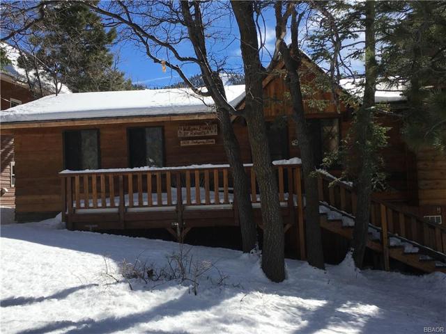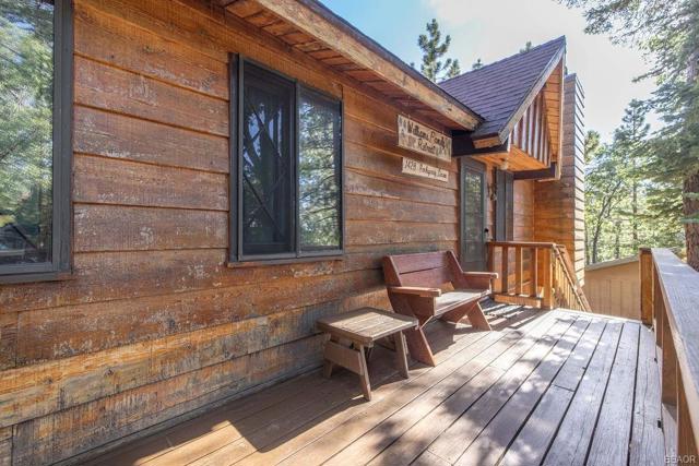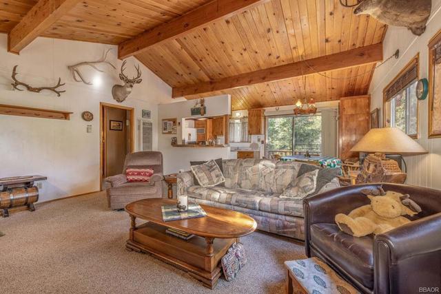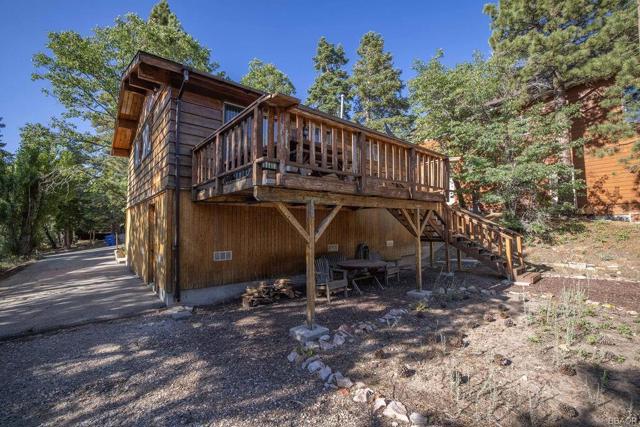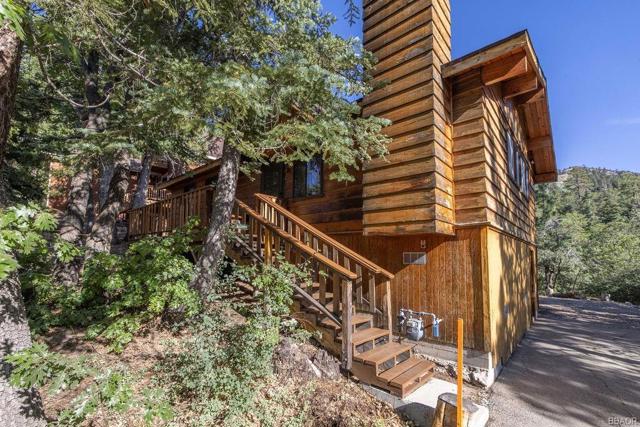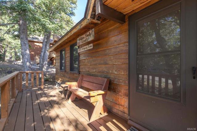 Welcome to this exquisite Sierra-style cabin, situated in a prime location next to the National Forest, offering easy access to the ski slopes of Bear Mountain and the golf course. This convenient arrangement ensures that no neighbors obstruct your view from the backyard, perfectly nestled in the secluded environs of Moonridge. This property presents an investment opportunity or an ideal haven for creating cherished moments with your beloved family and friends. Enjoy the newly built front deck and embrace the breathtaking views, capturing the beauty of nature and the enchanting vistas of the ski slope. Don't worry about parking; the driveway fits up to 4 cars, and your family can enjoy the private snow play area in the backyard during the winter months. Its raised foundation provides for a large walk-in storage area under the home. This residence boasts two well-appointed bedrooms, an open living room & kitchen with a dining area, featuring knotty pine beamed ceilings, and a tasteful full bathroom, creating an inviting atmosphere of warmth and comfort. The living room's welcoming wood-burning fireplace and new gas wall heater add to the cozy ambiance, providing a perfect space to unwind and create lasting memories. Seamlessly surrounded by nature's tranquil embrace, this exceptional opportunity perfectly combines a quiet prime location with an enchanting communion with the natural surroundings. Don't let this chance slip away.