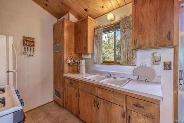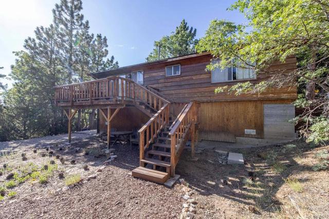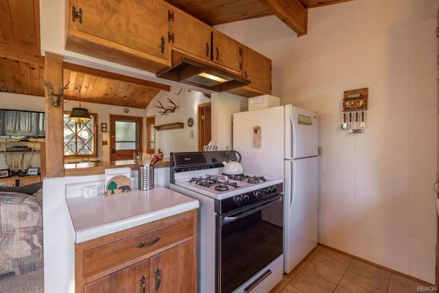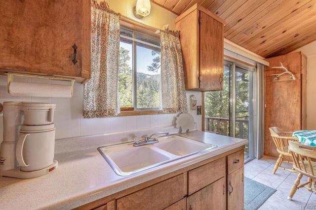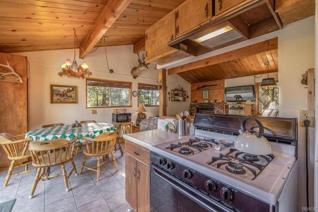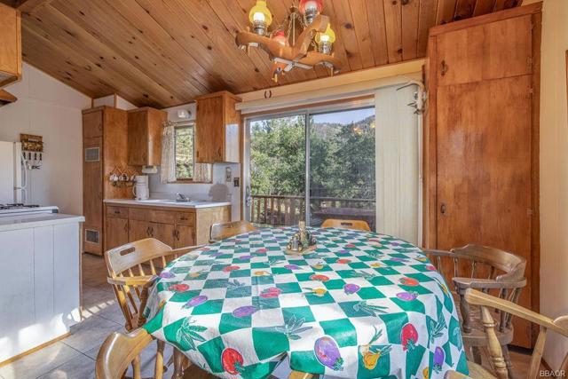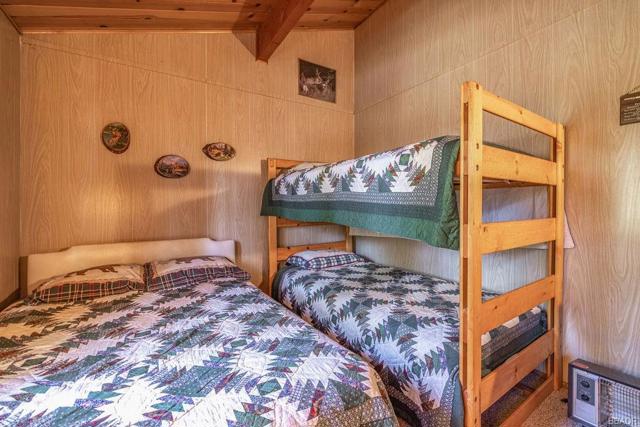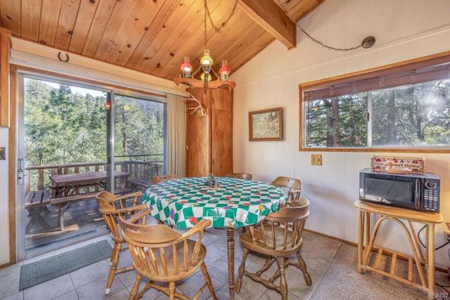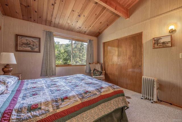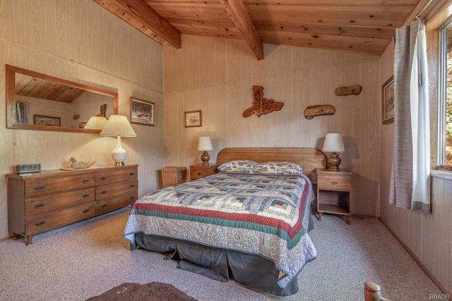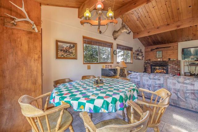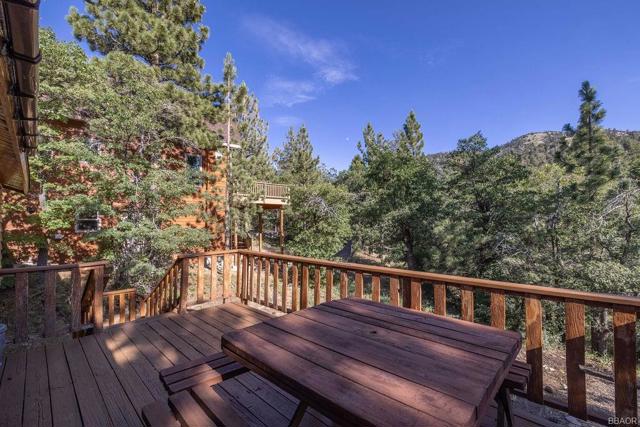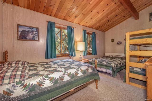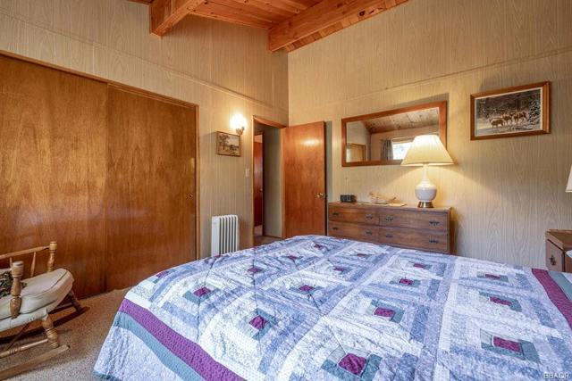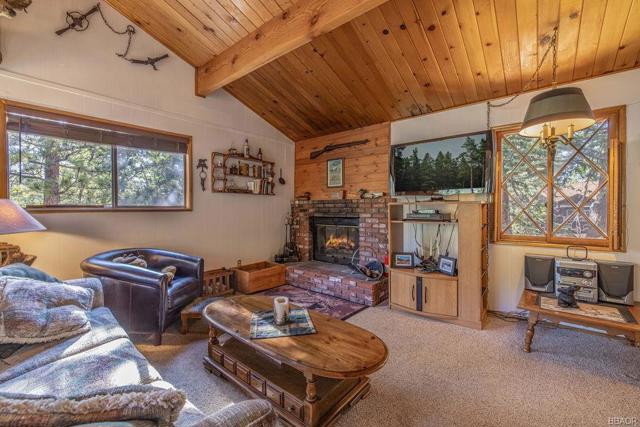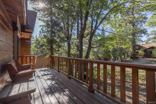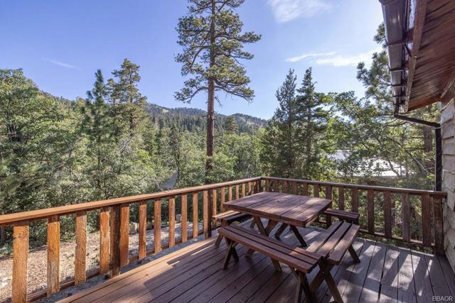 Welcome to this exquisite Sierra-style cabin, situated in a prime location next to the National Forest, offering easy access to the ski slopes of Bear Mountain and the golf course. This convenient arrangement ensures that no neighbors obstruct your view from the backyard, perfectly nestled in the secluded environs of Moonridge. This property presents an investment opportunity or an ideal haven for creating cherished moments with your beloved family and friends. Enjoy the newly built front deck and embrace the breathtaking views, capturing the beauty of nature and the enchanting vistas of the ski slope. Don't worry about parking; the driveway fits up to 4 cars, and your family can enjoy the private snow play area in the backyard during the winter months. Its raised foundation provides for a large walk-in storage area under the home. This residence boasts two well-appointed bedrooms, an open living room & kitchen with a dining area, featuring knotty pine beamed ceilings, and a tasteful full bathroom, creating an inviting atmosphere of warmth and comfort. The living room's welcoming wood-burning fireplace and new gas wall heater add to the cozy ambiance, providing a perfect space to unwind and create lasting memories. Seamlessly surrounded by nature's tranquil embrace, this exceptional opportunity perfectly combines a quiet prime location with an enchanting communion with the natural surroundings. Don't let this chance slip away.