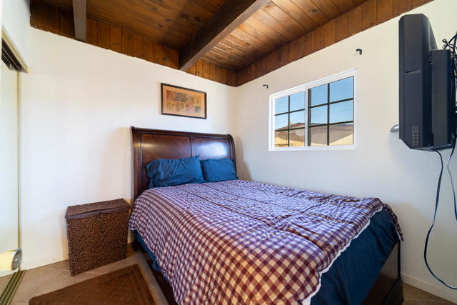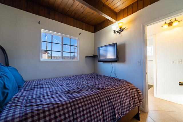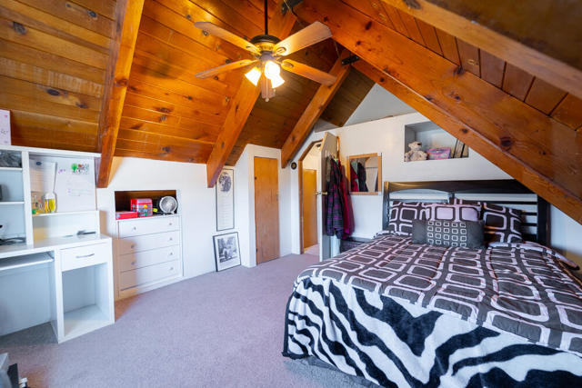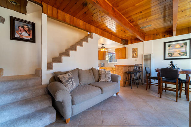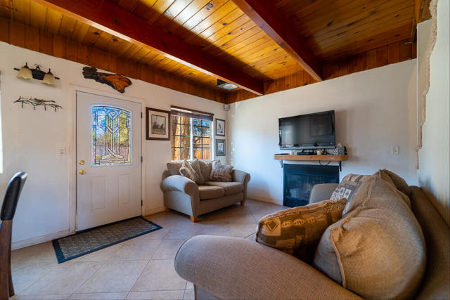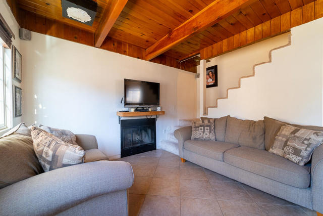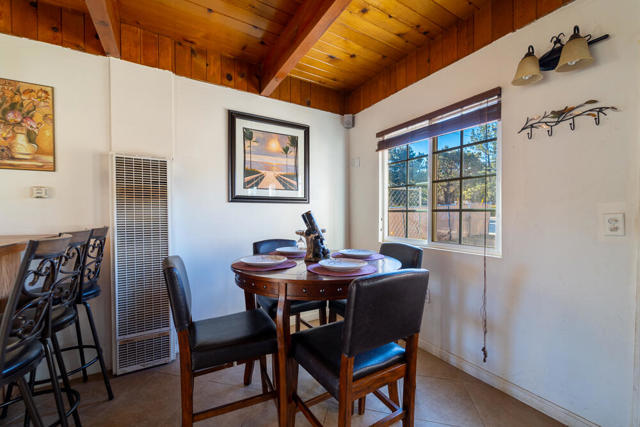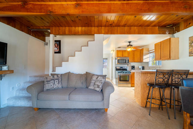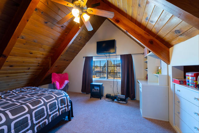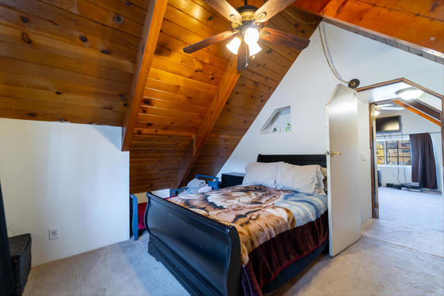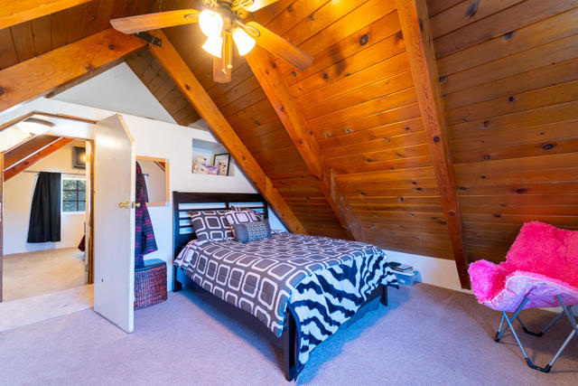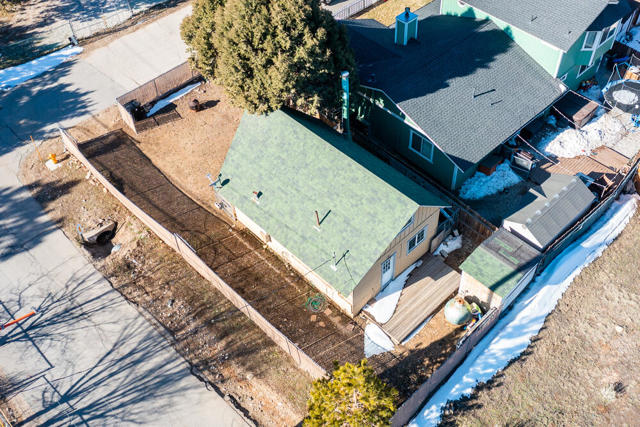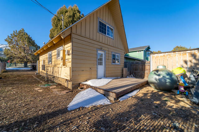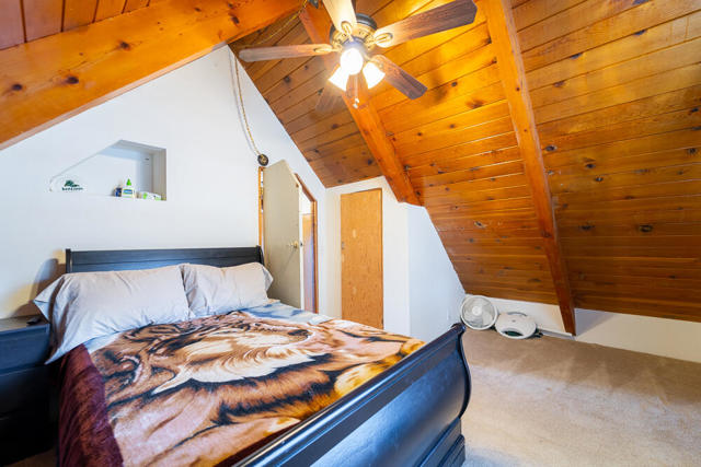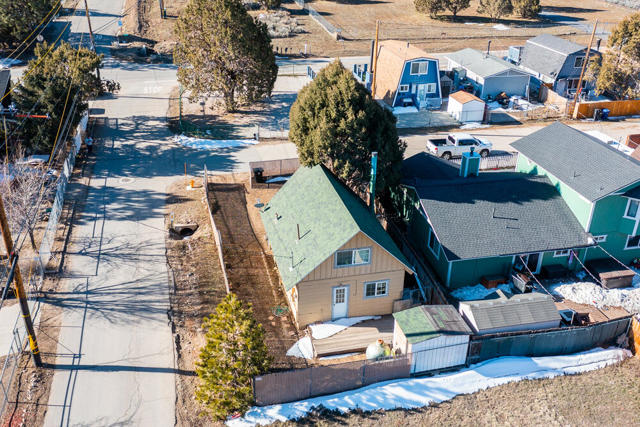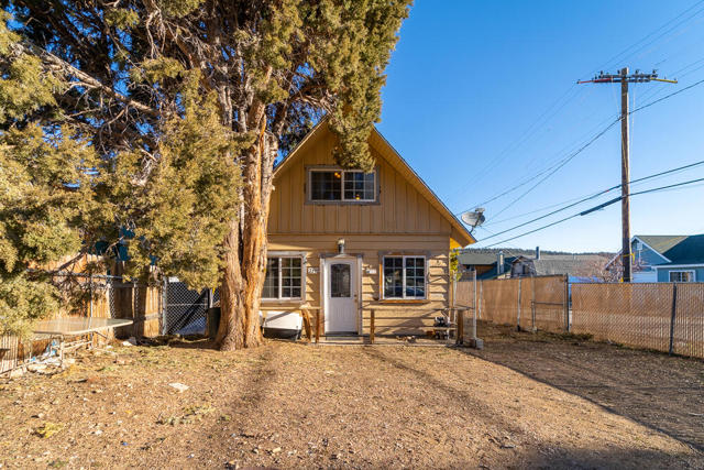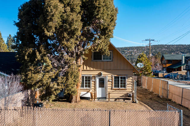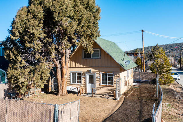 This corner lot cabin is completely fenced in which provides privacy and security, but still allows for gorgeous mountain views. Located minutes from downtown Big Bear, this quaint property provides 3 cozy bedrooms and a bathroom (2 bedrooms upstairs and 1 downstairs). The newer dual pane windows and front door have been recently replaced and the large wood beams create an inviting cabin atmosphere as you enter the home. Home comes with large ceramic tiles downstairs and carpet upstairs. The living room has a beautiful wood burning fireplace making this ideal to surround yourself with loved ones. The kitchen has been remodeled to include tile countertops, refinished cabinets, and stainless-steel appliances. The updated bathroom includes tiled shower surround, ceramic floor tile, and newer vanity. The laundry is located in the downstairs bedroom. This house also offers a yard that has plenty of space, and a storage shed in the back.
