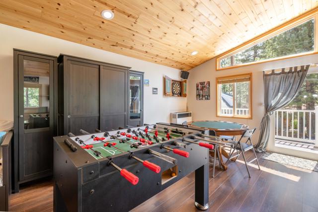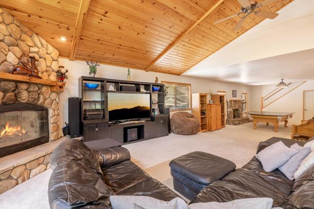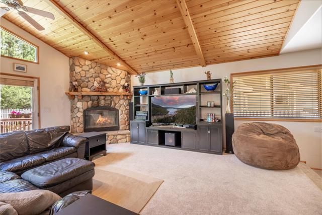 Premium Eagle Point Location: This four bedroom, four bath, plus game room, should not be missed. Close to the lake, the park and shopping centers. Under a mile to Snow Summit and a short stroll to the overflow parking and shuttle stops for both Bear Mountain and Snow Summit Ski Resorts. Large, flat, fenced and landscaped lot, at just under 14,000 sq/ft. is both private and centrally located: Backing to a green- belt, making the trees your only neighbor behind, delivers the secluded setting you've been searching for. And wait until you see the interior! You'll appreciate the open great-room floor plan with vaulted wood beamed ceilings, floor to ceiling river-rock fireplace and fixed glass windows that bring in lots of natural light. Solid maple floors, granite counters, stainless appliances, French doors, three fireplaces, large back deck with hot-tub and spacious game room with balcony above oversized garage make this one a winner. Schedule a showing today.