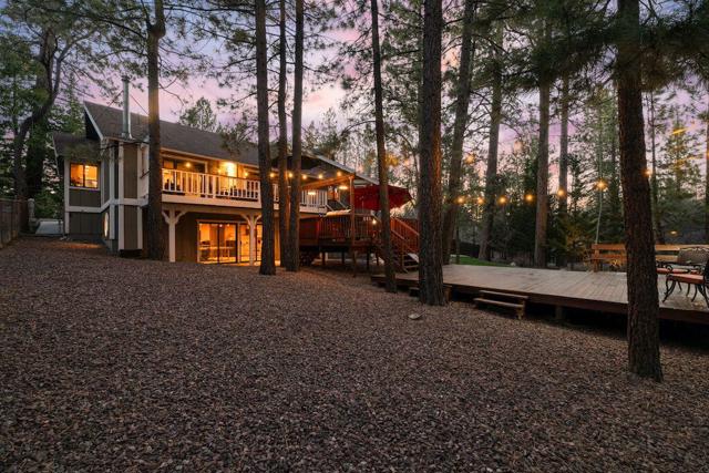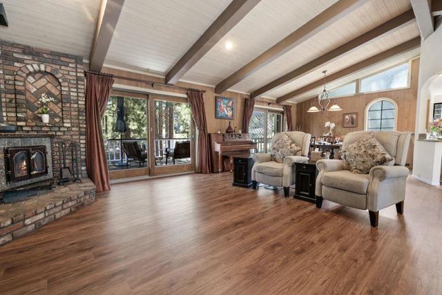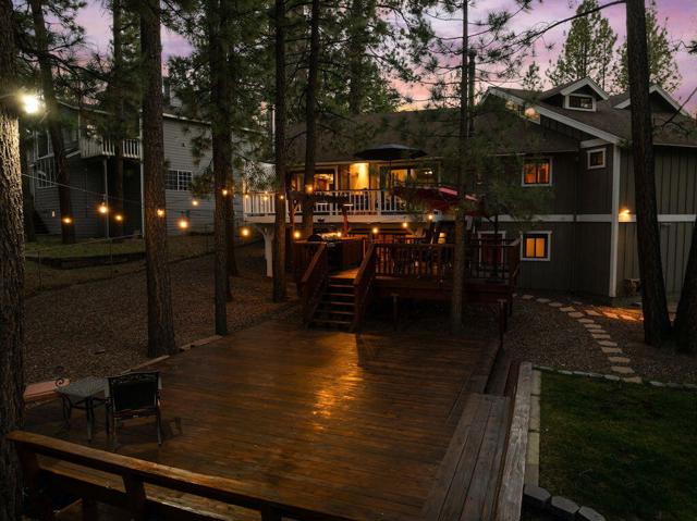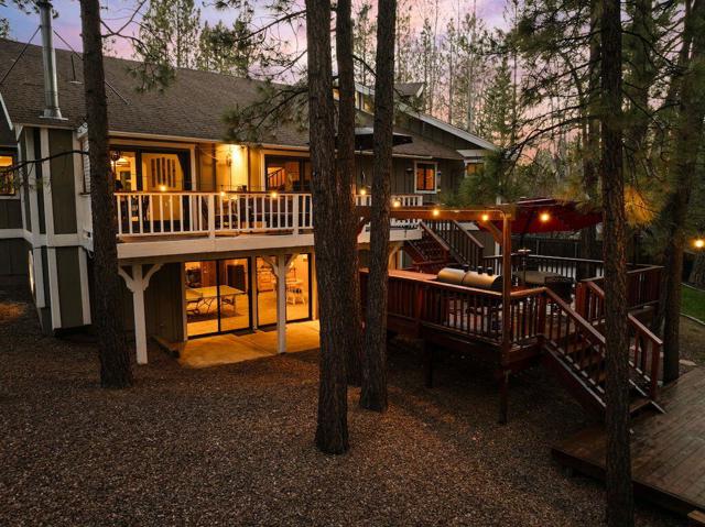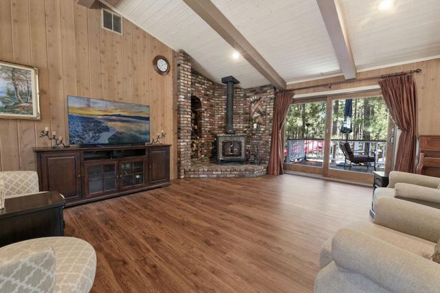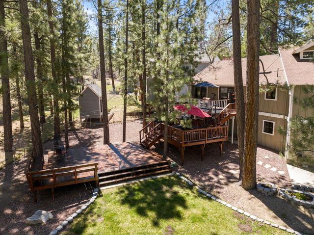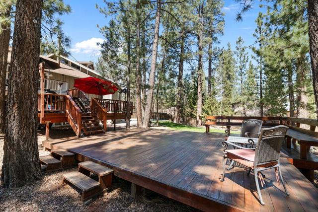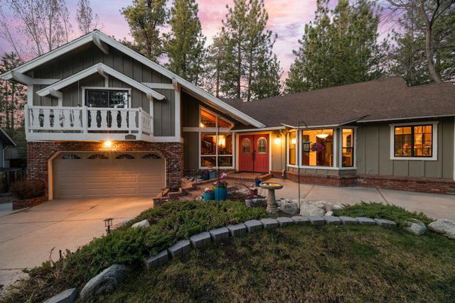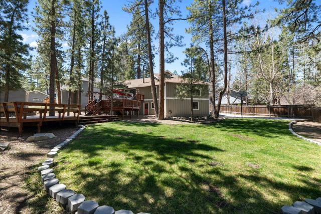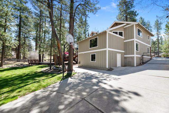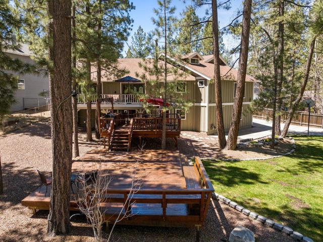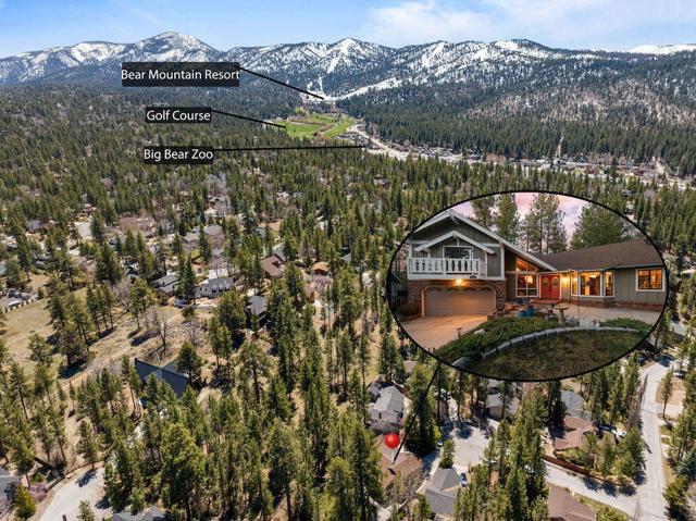 Located on a quiet cul-de-sac in the desirable Fox Farm neighborhood close to Big Bear Lake, the Village, Snow Summit, Bear Mountain, Zoo, Golf Course, mountain biking, and hiking trails. You'll love the vaulted ceilings, wood laminate flooring and custom wood burning brick fireplace in the spacious living room. Indoor pond/ water feature adds to the tranquil setting. Modern kitchen with granite countertops and stainless-steel appliances. Separate dining area along with breakfast nook area in kitchen. Huge primary bedroom with walk-in closet is located on the main floor. 2 spacious guest bedrooms, full guest bath, and loft located upstairs. Downstairs is a large game room with kitchenette & fireplace which could be a separate living area with a 3/4 bath in hallway. This home has lots of storage space including a crawl space with a wine cellar and storage shelves. Huge entertaining back yard with 3 tier deck that has outdoor fridge/counter/natural gas BBQ hookup, RV hookups and a great secluded forest view. Loads of parking including 2 car attached garage, side driveway with security gate/opener and additional parking. This home has a Nest door lock and security cameras plus a bonus workshop which includes a countertop with sink, is heated and could be potential additional living space.