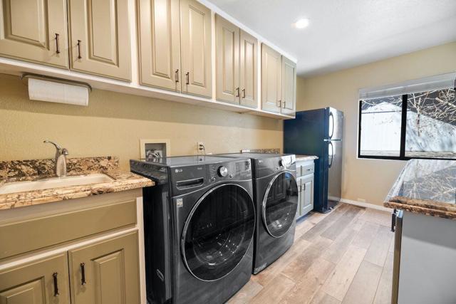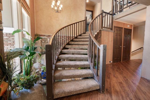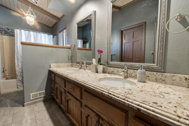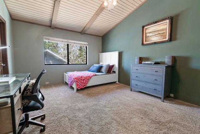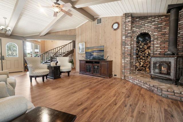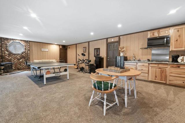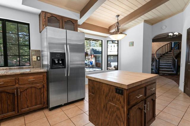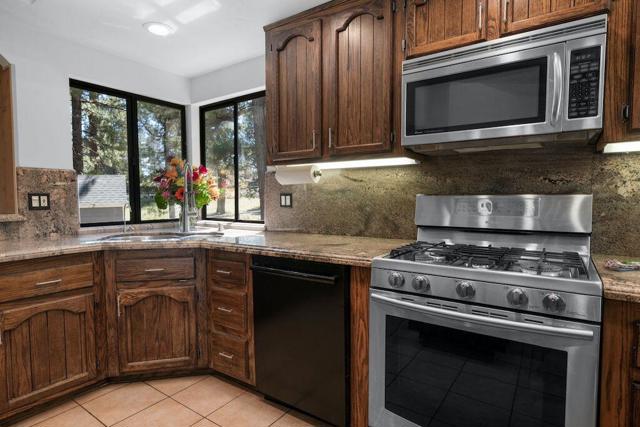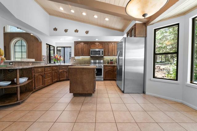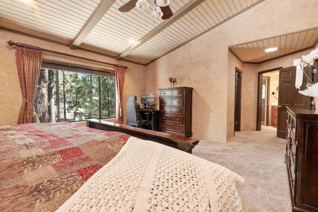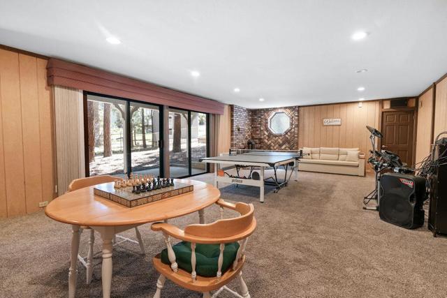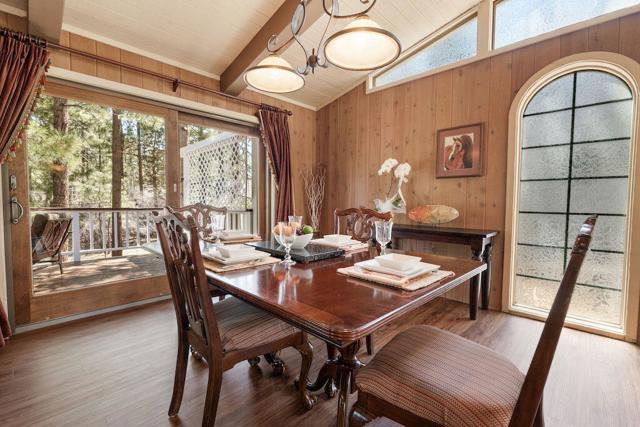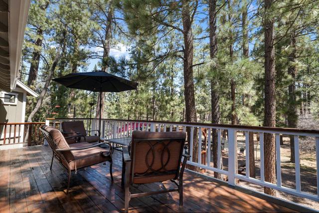 Located on a quiet cul-de-sac in the desirable Fox Farm neighborhood close to Big Bear Lake, the Village, Snow Summit, Bear Mountain, Zoo, Golf Course, mountain biking, and hiking trails. You'll love the vaulted ceilings, wood laminate flooring and custom wood burning brick fireplace in the spacious living room. Indoor pond/ water feature adds to the tranquil setting. Modern kitchen with granite countertops and stainless-steel appliances. Separate dining area along with breakfast nook area in kitchen. Huge primary bedroom with walk-in closet is located on the main floor. 2 spacious guest bedrooms, full guest bath, and loft located upstairs. Downstairs is a large game room with kitchenette & fireplace which could be a separate living area with a 3/4 bath in hallway. This home has lots of storage space including a crawl space with a wine cellar and storage shelves. Huge entertaining back yard with 3 tier deck that has outdoor fridge/counter/natural gas BBQ hookup, RV hookups and a great secluded forest view. Loads of parking including 2 car attached garage, side driveway with security gate/opener and additional parking. This home has a Nest door lock and security cameras plus a bonus workshop which includes a countertop with sink, is heated and could be potential additional living space.