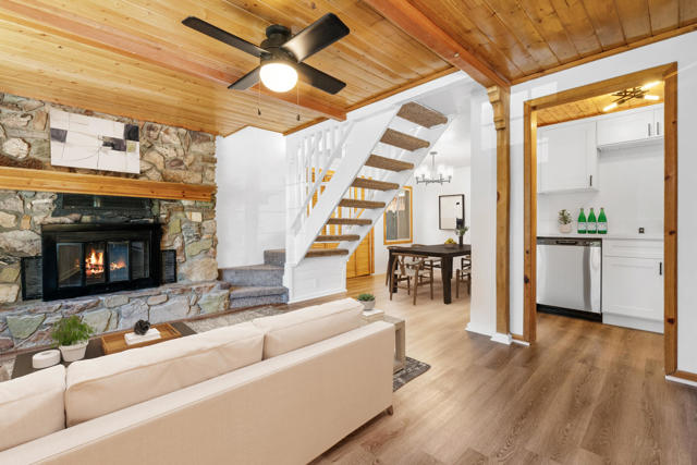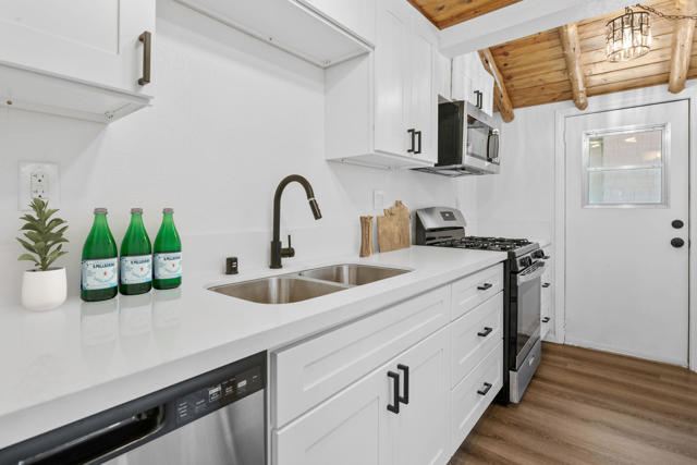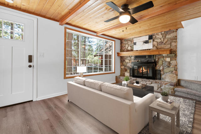 Charming Remodeled Mountain Cabin. This gem of a cabin is walking distance to the Bear Mountain Resort parking and shuttle. Also the golf course, zoo, restaurants and shopping. Amazing remodel job just finished. This cabin has been freshly painted, inside and out. New hard surface flooring and carpet. Kitchen totally remodeled with new countertops, cabinets and stainless appliances. Updated bathroom with a newly tiled shower enclosure, new vanity and new plumbing. New ceiling fan and wall heater. New lighting and plumbing fixtures throughout. New exterior doors and new electrical panel. Set back off the street on a nicely wooded lot. Plenty of parking. Only a short drive to the lake, Snow Summit and the Village. Many biking and hiking trails close by. A truly remarkable cabin.