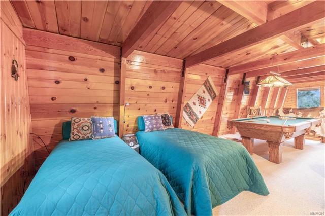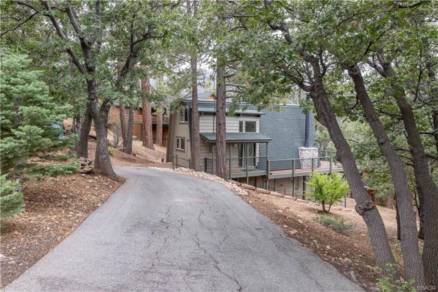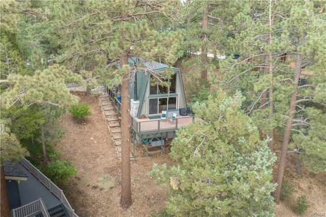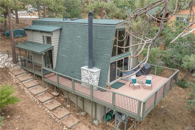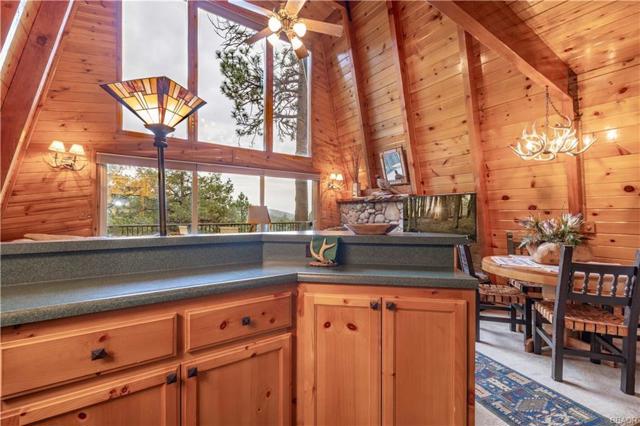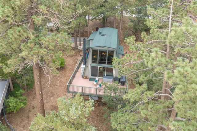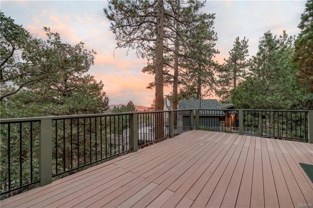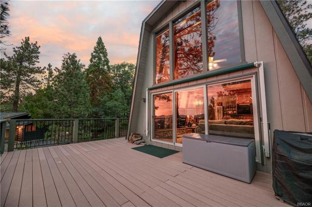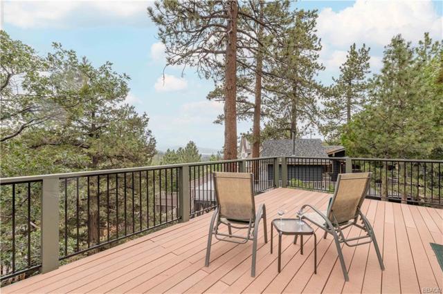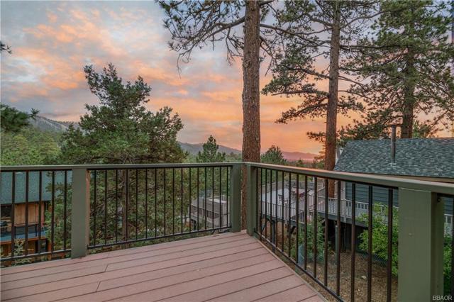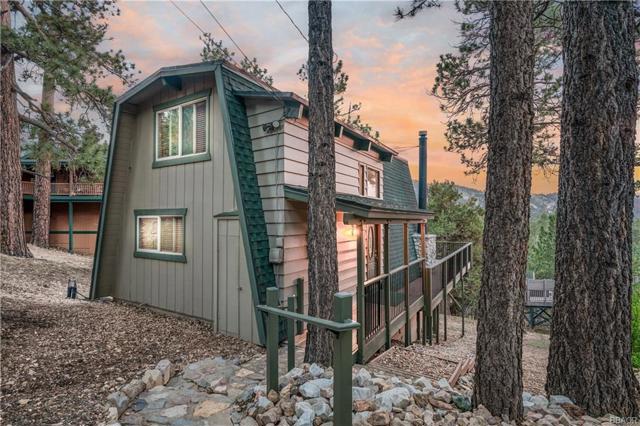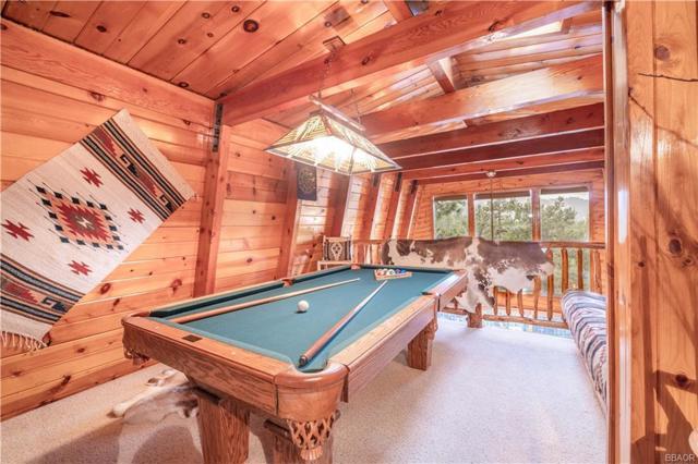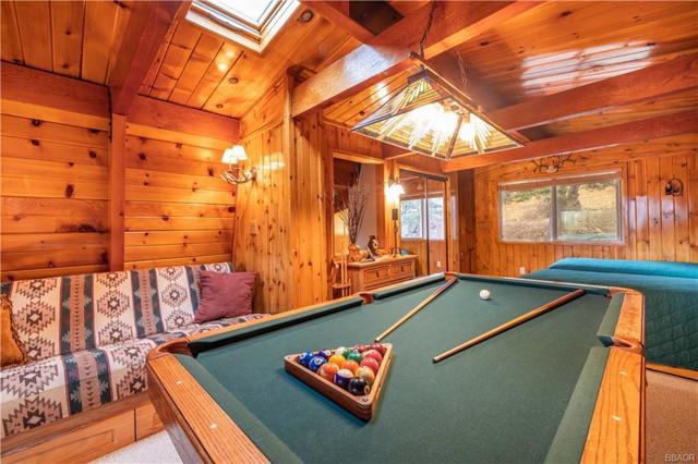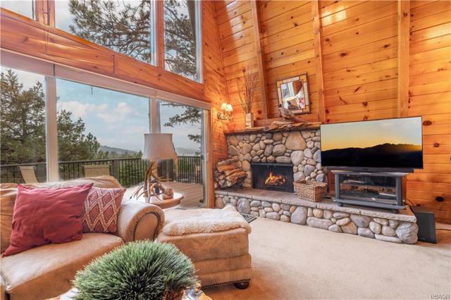 Enjoy the fantastic views from this classic, gorgeous, Big Bear mountain home! 180 degree views of Bear Mountain Ski Resort, Big Bear Lake and overall valley views along with stunning sunsets from the spacious, newer deck. This mountain Gambrell features: Beautifully aged knotty pine beamed T&G ceilings, floor to ceiling living room windows, a lovely wood burning stone fireplace, cozy mountain style furniture, upgraded black kitchen appliances with knotty pine cabinetry, open floor plan with kitchen, dining and living room layout. There is a full bathroom, and two bedrooms. One bedroom features a Cal-King sized bed, with lovely mountain decor. The upstairs bedroom has two XL single beds and a double sized futon sofa bed, along with a queen sized sofa bed in LR. In addition, there is a pool table in the loft area, with views of the mountains from the loft while enjoying a game of pool! This home has a new roof cap, and the exterior has been freshly painted. The decking is synthetic and is newer. The lot size is over 11,000 sq. ft., and the home sits to the left of the lot leaving room for expansion if so desired. The home comes completely furnished, and is ready to enjoy with family, friends or just yourself! Enjoy, relax and take in the beauty from this absolutely fabulous, mountain home. There is plenty of parking and lots of storage under the home too! In addtion, this home is steps away from the national forest, hiking and biking. A real Big Bear charmer.