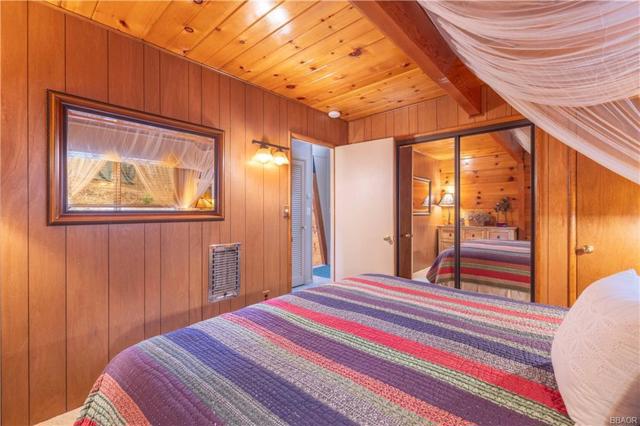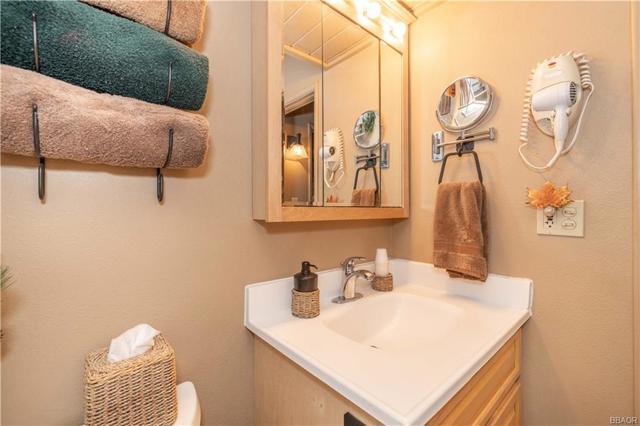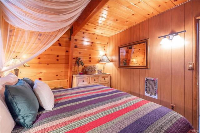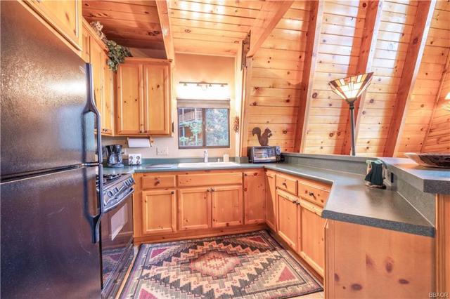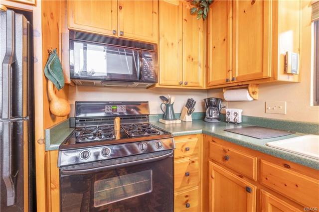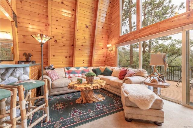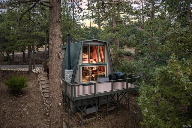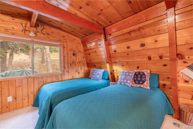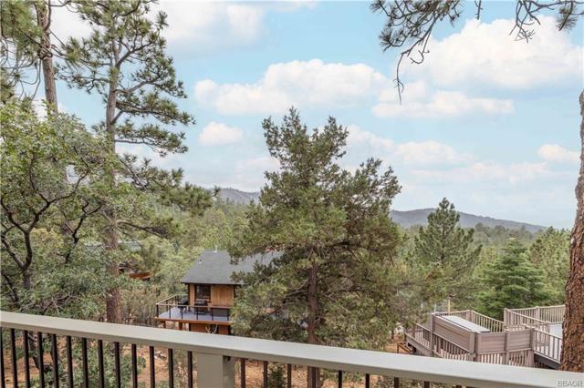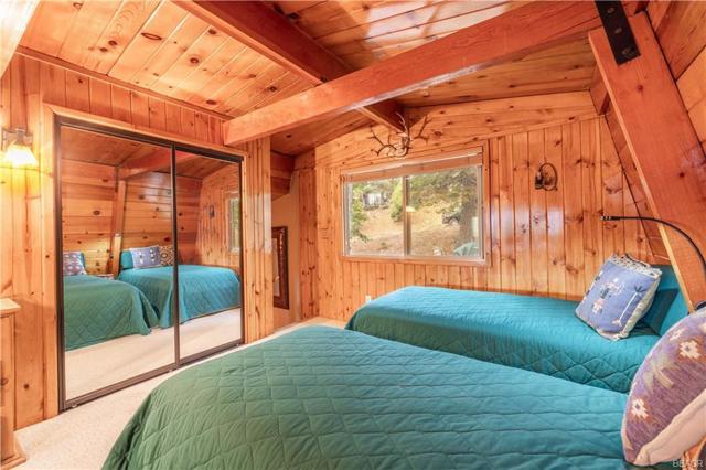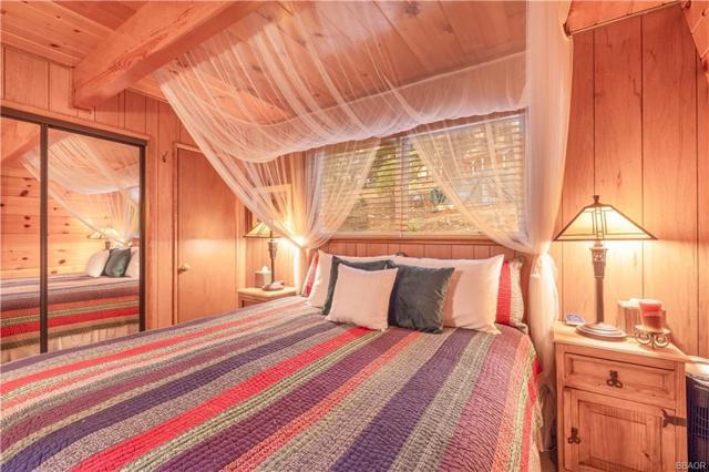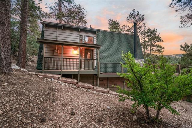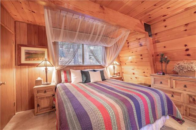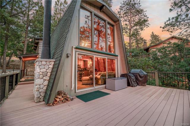 Enjoy the fantastic views from this classic, gorgeous, Big Bear mountain home! 180 degree views of Bear Mountain Ski Resort, Big Bear Lake and overall valley views along with stunning sunsets from the spacious, newer deck. This mountain Gambrell features: Beautifully aged knotty pine beamed T&G ceilings, floor to ceiling living room windows, a lovely wood burning stone fireplace, cozy mountain style furniture, upgraded black kitchen appliances with knotty pine cabinetry, open floor plan with kitchen, dining and living room layout. There is a full bathroom, and two bedrooms. One bedroom features a Cal-King sized bed, with lovely mountain decor. The upstairs bedroom has two XL single beds and a double sized futon sofa bed, along with a queen sized sofa bed in LR. In addition, there is a pool table in the loft area, with views of the mountains from the loft while enjoying a game of pool! This home has a new roof cap, and the exterior has been freshly painted. The decking is synthetic and is newer. The lot size is over 11,000 sq. ft., and the home sits to the left of the lot leaving room for expansion if so desired. The home comes completely furnished, and is ready to enjoy with family, friends or just yourself! Enjoy, relax and take in the beauty from this absolutely fabulous, mountain home. There is plenty of parking and lots of storage under the home too! In addtion, this home is steps away from the national forest, hiking and biking. A real Big Bear charmer.