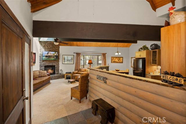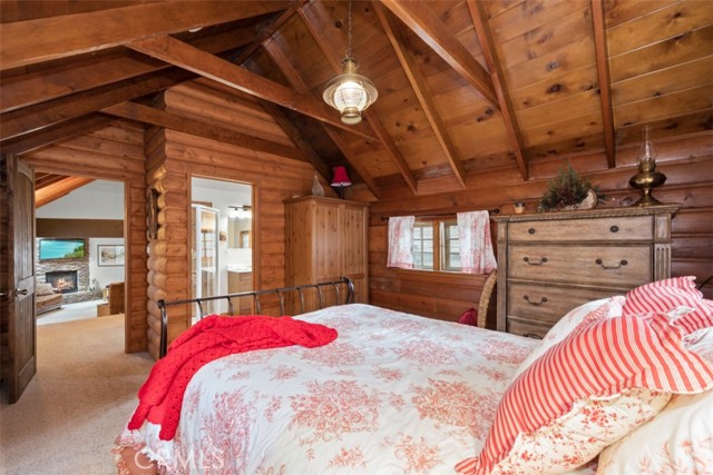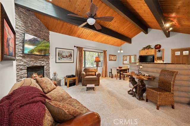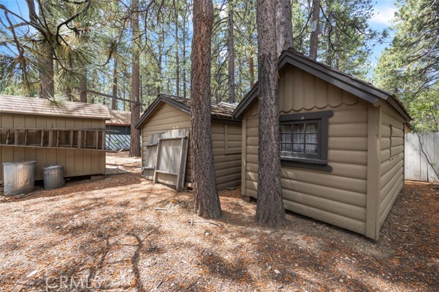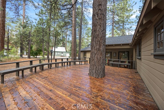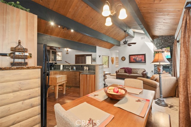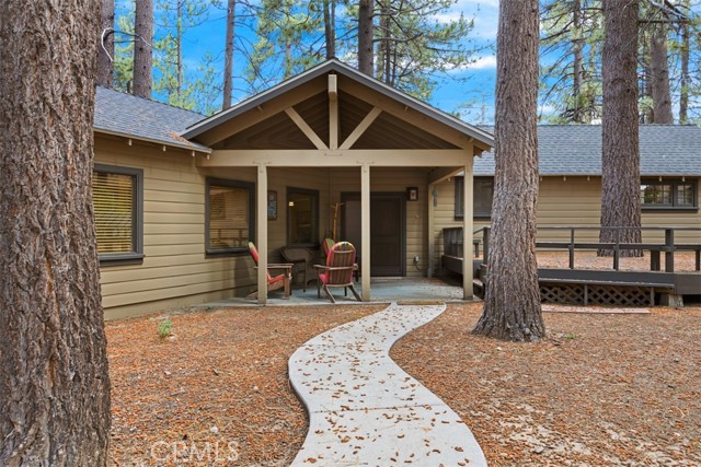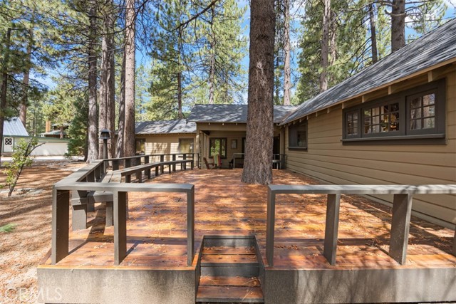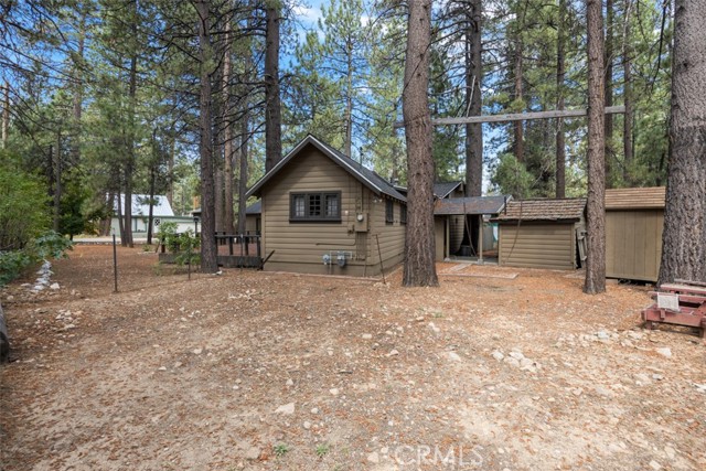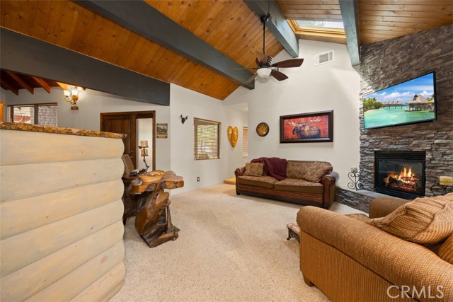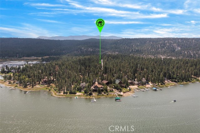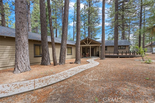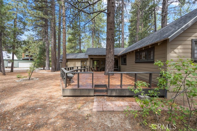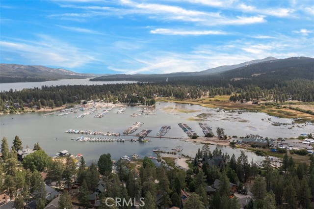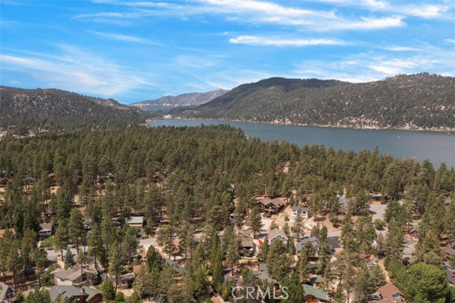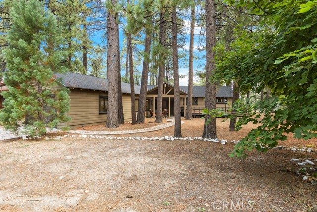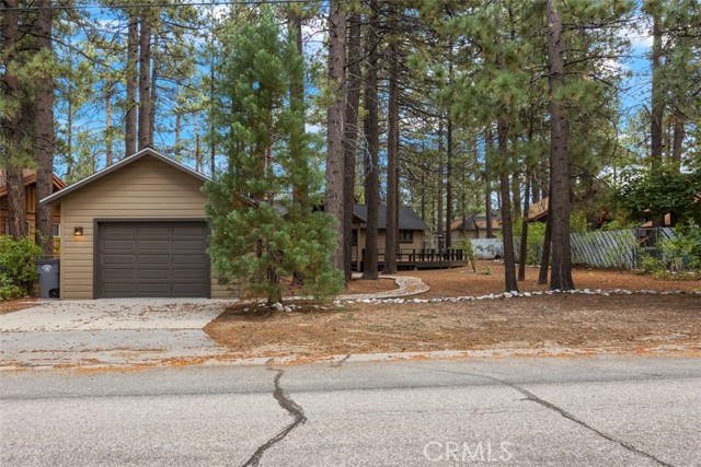 Nestled amidst the serene beauty of Big Bear Lake, this delightful 3 bed 2 bath home offers the perfect blend of rustic charm and modern comfort. The master bedroom has the log interior with exposed beams, and the attached bath has a skylight. The updated kitchen offers an open area to prepare and be able to host in an open setting with your guests. Off the kitchen is a vaulted wood ceiling with stone fireplace and skylight. Just off the living room are two more bedrooms that lead to the attached garage. The backyard features a bunk house and separate laundry and workshop area. With its larger street to street 8625 sq ft lot you will have plenty of room to enjoy the outdoors or room for boat and RV parking. A front deck offers the perfect place for grilling, entertaining, or simply savoring your morning coffee as you take in the mountain air. The home is just minutes to the lake, Boulder Bay Park, and Pleasure Point Marina. Home is being sold furnished.