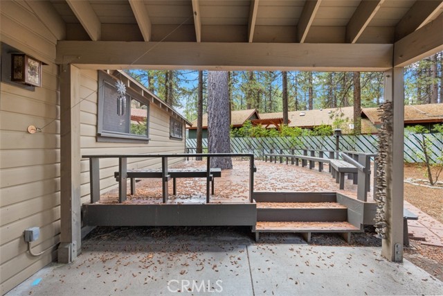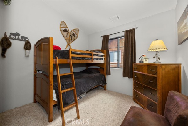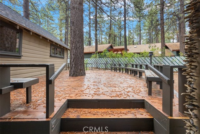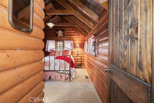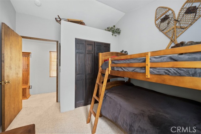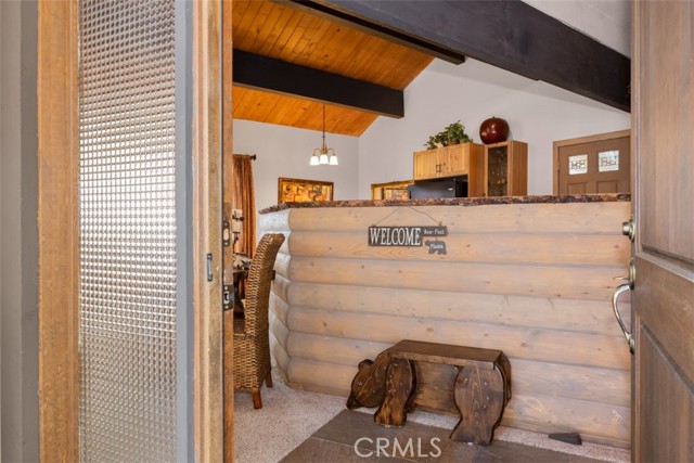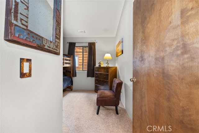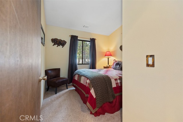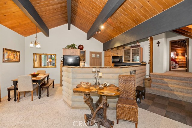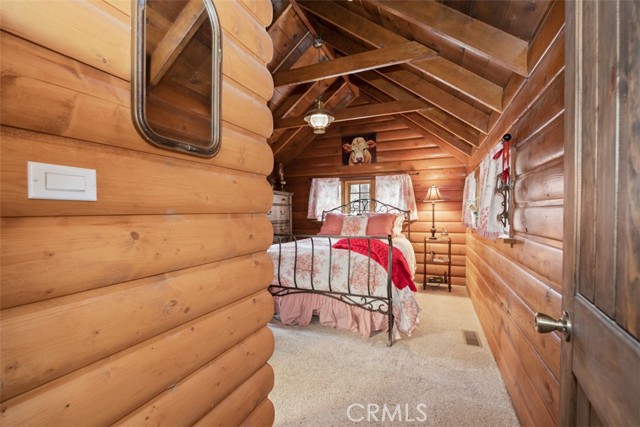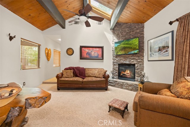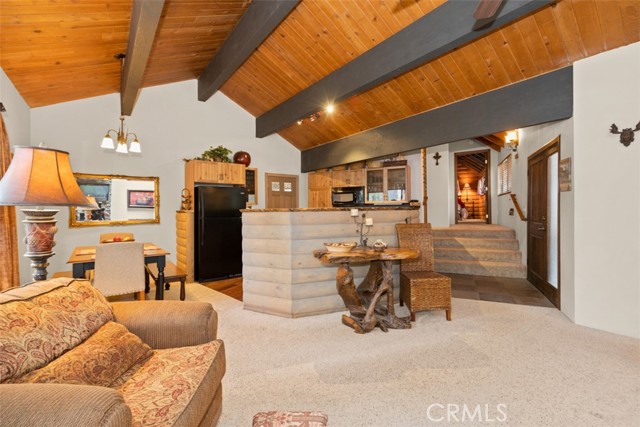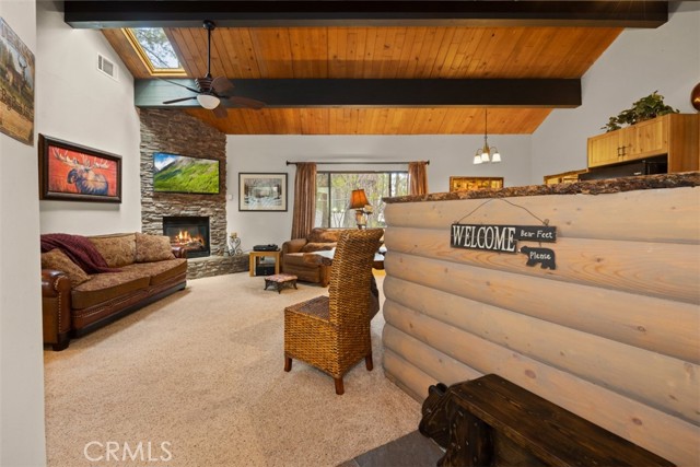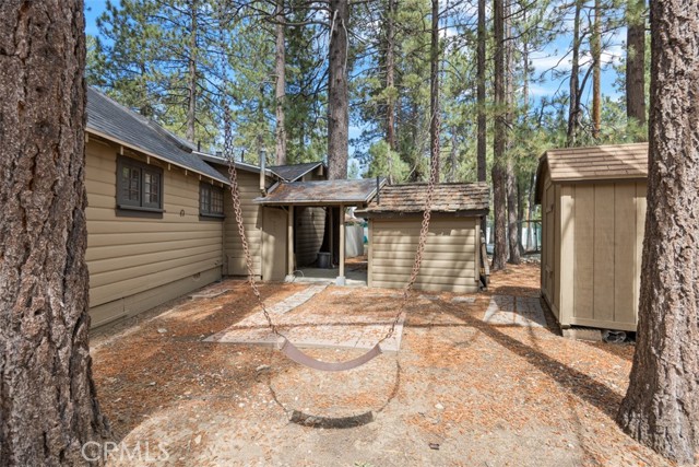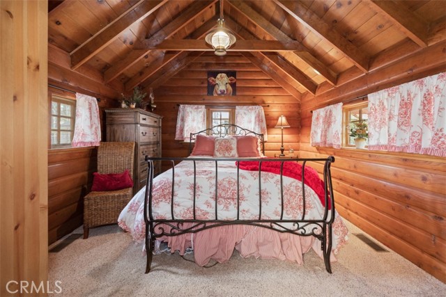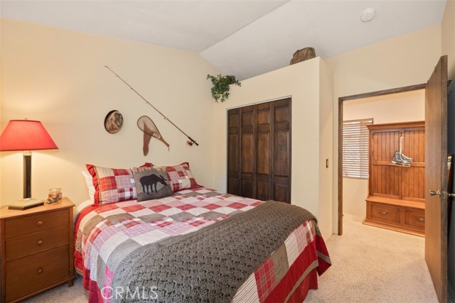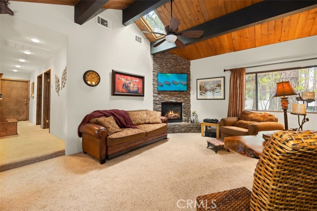 Nestled amidst the serene beauty of Big Bear Lake, this delightful 3 bed 2 bath home offers the perfect blend of rustic charm and modern comfort. The master bedroom has the log interior with exposed beams, and the attached bath has a skylight. The updated kitchen offers an open area to prepare and be able to host in an open setting with your guests. Off the kitchen is a vaulted wood ceiling with stone fireplace and skylight. Just off the living room are two more bedrooms that lead to the attached garage. The backyard features a bunk house and separate laundry and workshop area. With its larger street to street 8625 sq ft lot you will have plenty of room to enjoy the outdoors or room for boat and RV parking. A front deck offers the perfect place for grilling, entertaining, or simply savoring your morning coffee as you take in the mountain air. The home is just minutes to the lake, Boulder Bay Park, and Pleasure Point Marina. Home is being sold furnished.