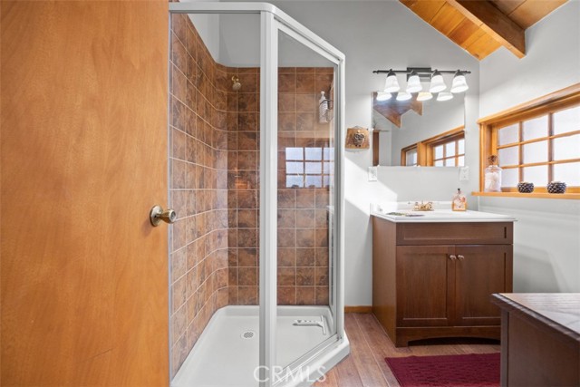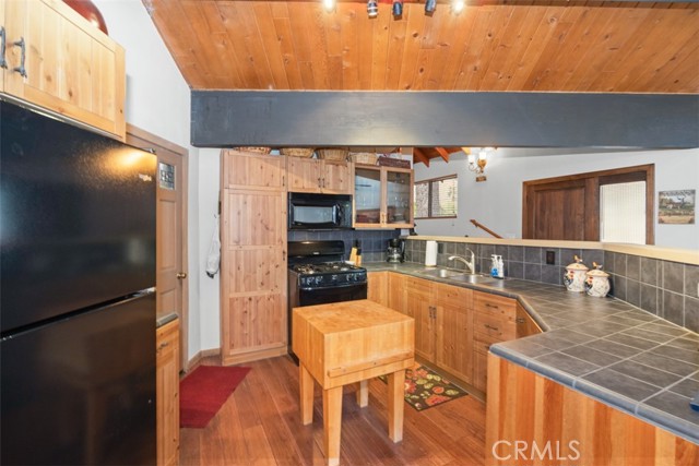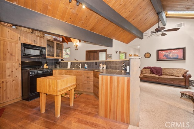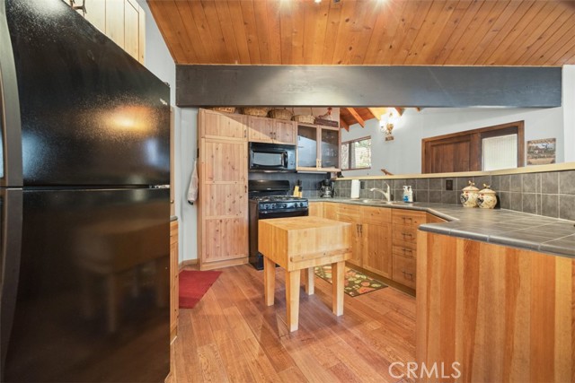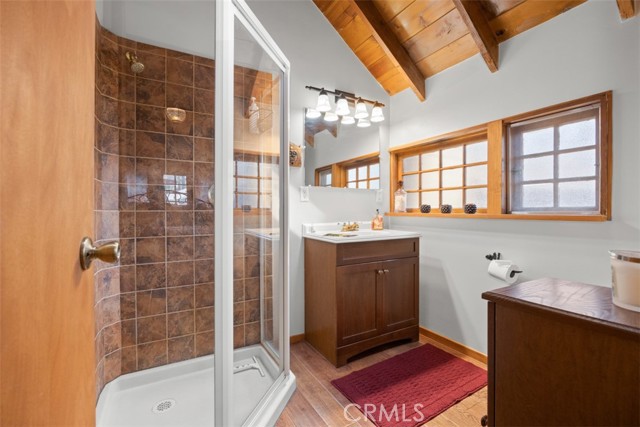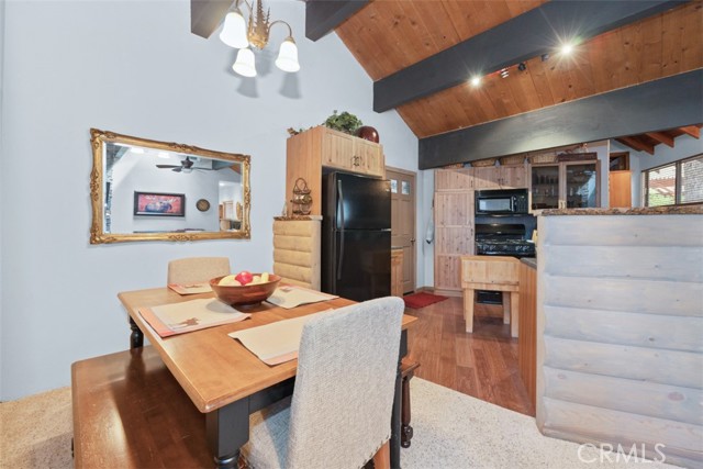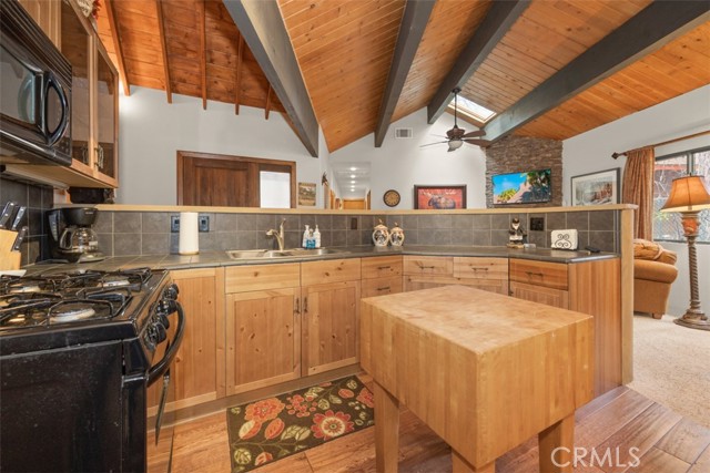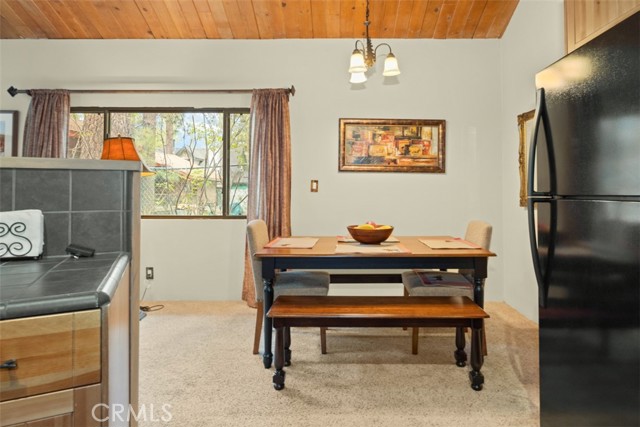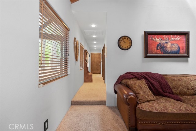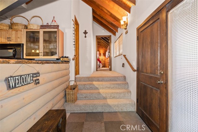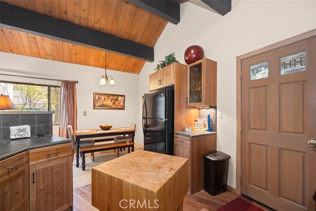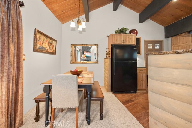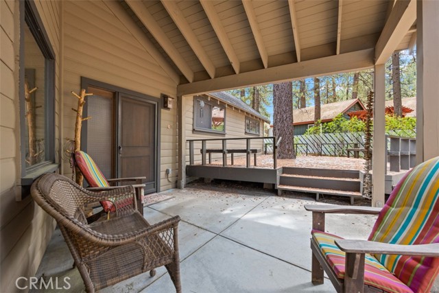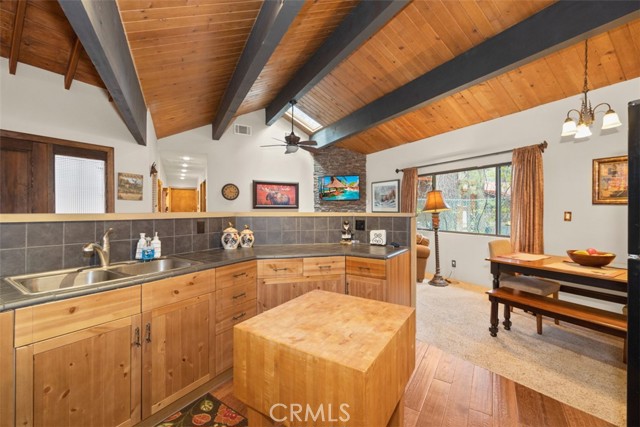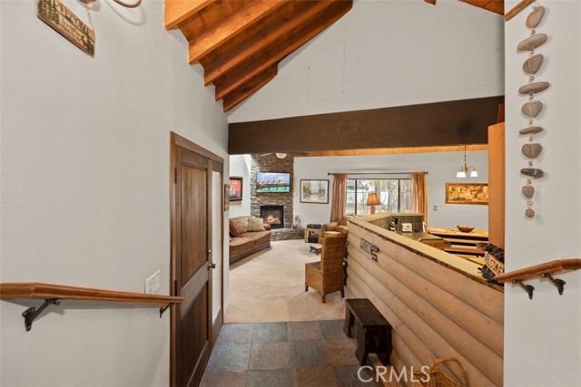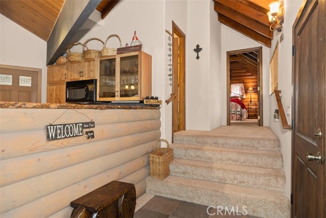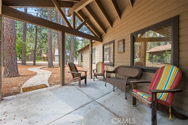 Nestled amidst the serene beauty of Big Bear Lake, this delightful 3 bed 2 bath home offers the perfect blend of rustic charm and modern comfort. The master bedroom has the log interior with exposed beams, and the attached bath has a skylight. The updated kitchen offers an open area to prepare and be able to host in an open setting with your guests. Off the kitchen is a vaulted wood ceiling with stone fireplace and skylight. Just off the living room are two more bedrooms that lead to the attached garage. The backyard features a bunk house and separate laundry and workshop area. With its larger street to street 8625 sq ft lot you will have plenty of room to enjoy the outdoors or room for boat and RV parking. A front deck offers the perfect place for grilling, entertaining, or simply savoring your morning coffee as you take in the mountain air. The home is just minutes to the lake, Boulder Bay Park, and Pleasure Point Marina. Home is being sold furnished.