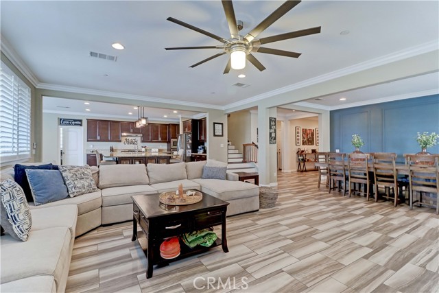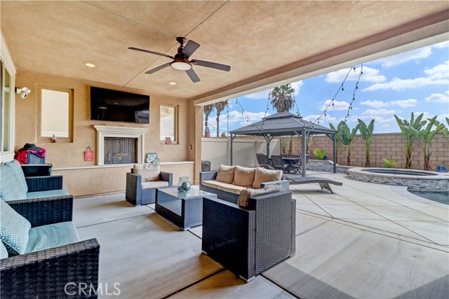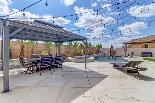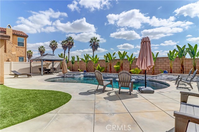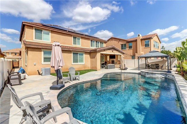 Welcome to the gated community of “Pepper Tree Grove” which boasts a small enclave of Beautiful Stately Homes and manicured landscaping. Fall in love upon arrival at curbside as this residence boasts pride of ownership throughout. Seldom does a home become available for sale in this community and now’s your chance to make this Gem your new home. The well thought out floor plan is perfect for family living and formal entertainment. There are 5 bedrooms and 4/1/2 baths and two of the bedrooms are downstairs, one which services a mothers-in-law bedroom and bath and one that hosts a home school space. The Great Room with fireplace and formal dining area opens to a designer Kitchen with beautiful cabinetry and custom counters, pantry and a large center island perfect for all your gourmet cooking and friendly gatherings. The custom flooring is a combination of custom tile and laminated flooring with new baseboards and interior paint. The additional upstairs Family Room is a great “break out” room for the 3 additional bedrooms including the Main Suite with gorgeous bath, including soaking tub separate shower and walk in closet. The attention to detail is beyond expectations as the outside “Oasis” is a dream come true. The covered patio extending from main house, offers cozy fireplace and comfort as you enjoy your dining pleasure in Summer and Fall, and a full additional cabana for extended entertainment under roof, Pool, Spa, waterfall, Turf area for the pups three car tandem garage with epoxy floors and EC availability and Solar. see this home it won't disappoint.