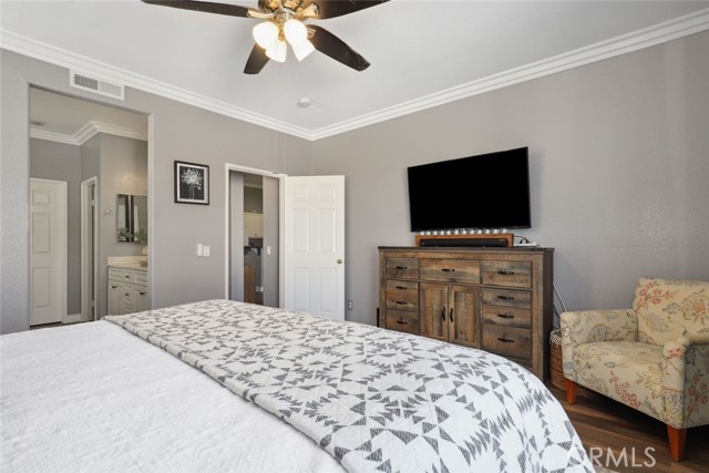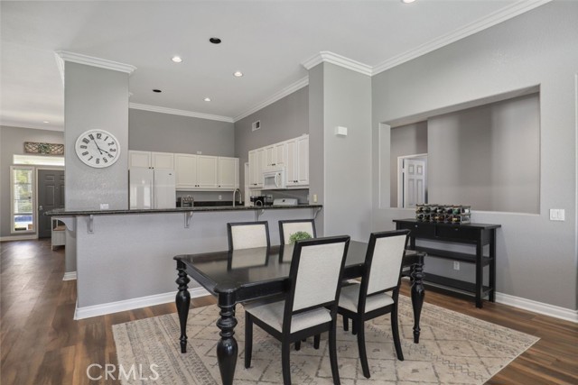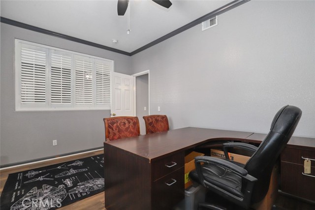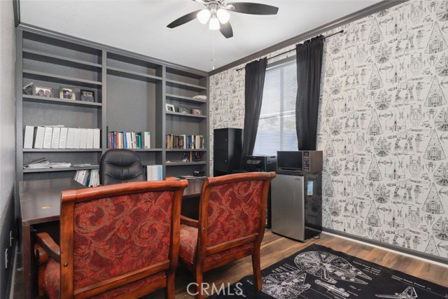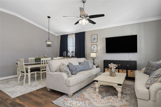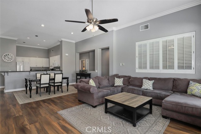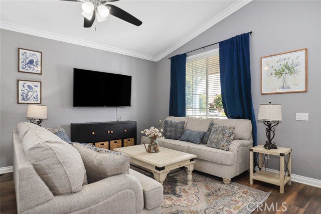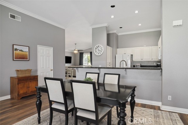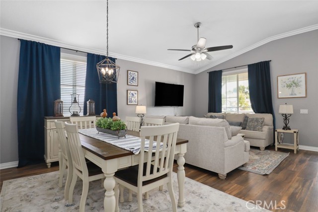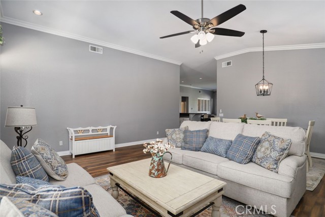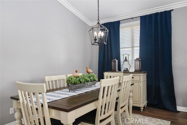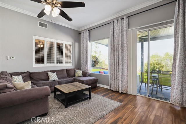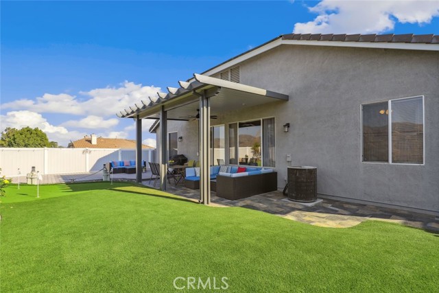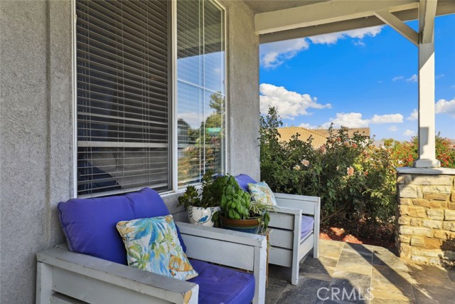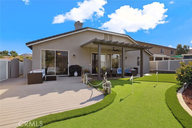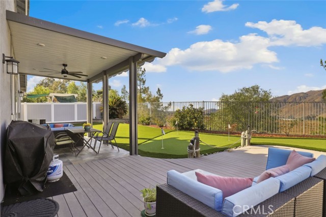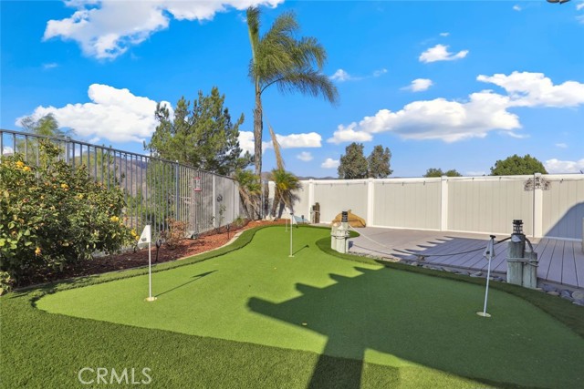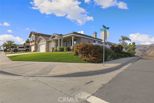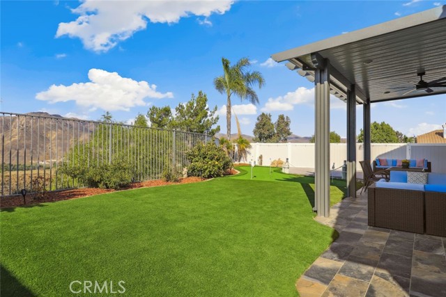 GORGEOUS SINGLE STORY HOME ON A CORNER LOT WITH INCREDIBLE VIEWS! This Home is a dream! Welcome to your beautiful 4 Bedroom/2 Bath offers plenty of privacy and space in the desirable Horsethief Canyon. Pulling up to this stunning home, you will notice the turf in the front yard and the cozy front porch, perfect for sitting and enjoying your coffee! Inside, you're greeted with vaulted ceilings, new custom paint throughout the entire home, and new wide plank LVP throughout the entire home. The Formal Living room has a ceiling fan while the Formal Dining room includes a modern chandelier. The Kitchen and Living room are one big, open space. The Living room showcases a fireplace with custom tile facing and a ceiling fan, while the Kitchen boasts white cabinets and granite countertops. The Laundry room is right off the Kitchen and it has access to the 3 Car Garage. This lovely home has a split wing floorplan- with 3 Rooms and a Bathroom on 1 side of the home and the Primary Suite situated on the other side of the home. The Primary Suite includes a Dual Sink Vanity, Soaking Tub, Separate Shower, and a Walk in Closet. The 2 Bedrooms share a Bathroom with a dual sink vanity and a shower/tub combo. You're going to LOVE the Home Office, which can be converted to the 4th Bedroom. It has a built in floor to ceiling bookcase and custom Wallpaper that really catches your eye! If you're a Star Wars Lover, this Blueprint Wallpaper is awesome! All 4 Rooms in the house have ceiling fans too! Outside, a relaxing Backyard awaits! There are NO NEIGHBORS BEHIND YOU, just views of the hills and canyon. The breeze up on this hill cools you down quickly! The Backyard has an Alumawood Patio Cover with recessed lights and a ceiling fan, luxurious decking, and a putting green built in off to the side of the turf backyard. This Community has a gorgeous Olympic size pool with parks and playgrounds. There is a School just around the corner, and you're minutes to the 15 Freeway. With LOW TAXES AND LOW HOA, you can't go wrong! The best part of this CORNER LOT is that the corner it sits on is a DEAD END STREET. This minimizes traffic and also gives ample parking or space to play! You don't want to miss this home! It's really beautiful and nicely updated!