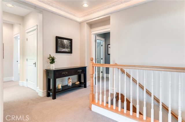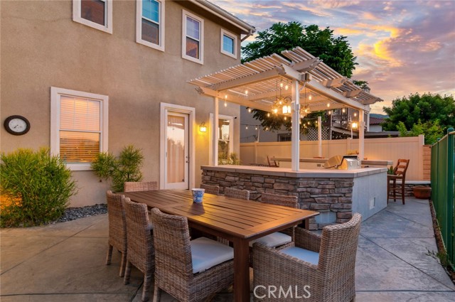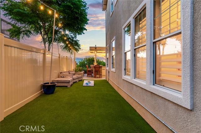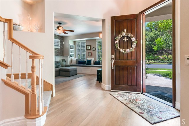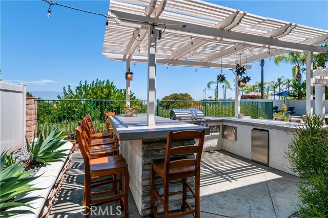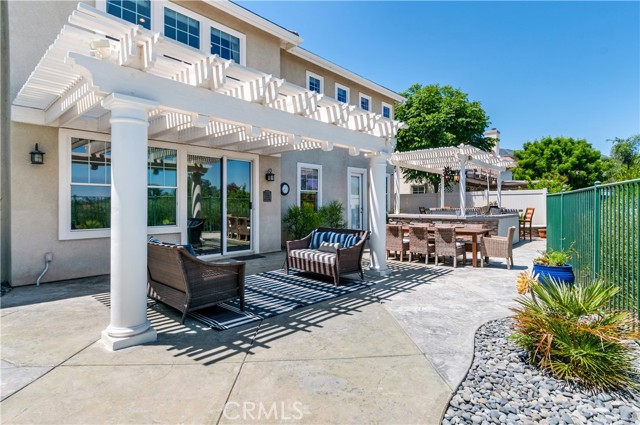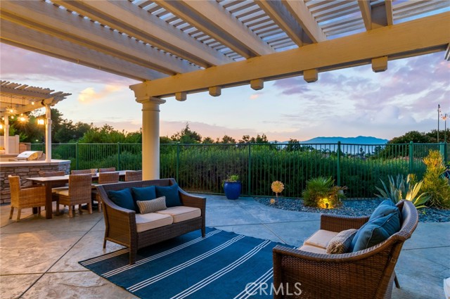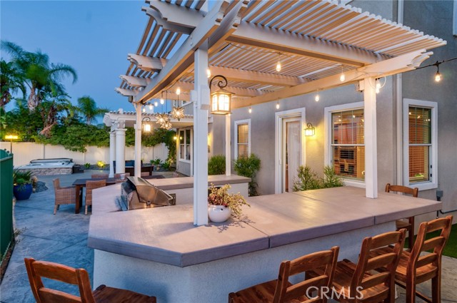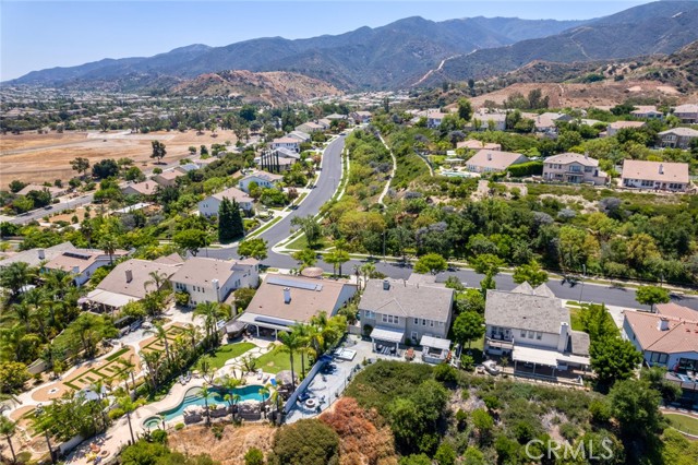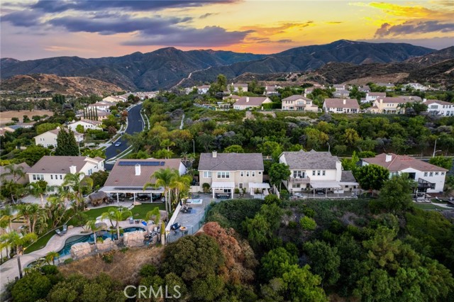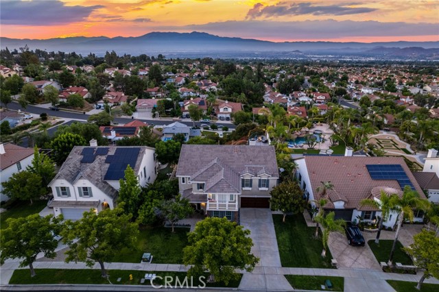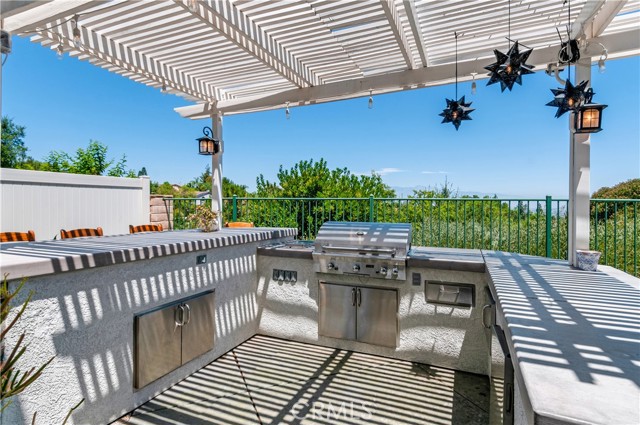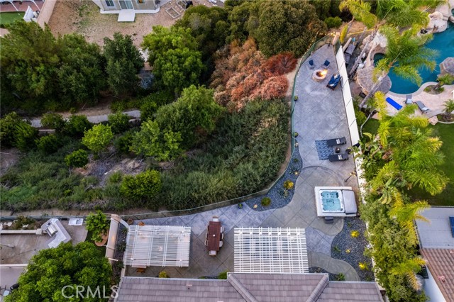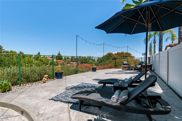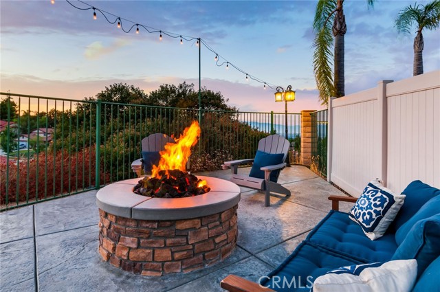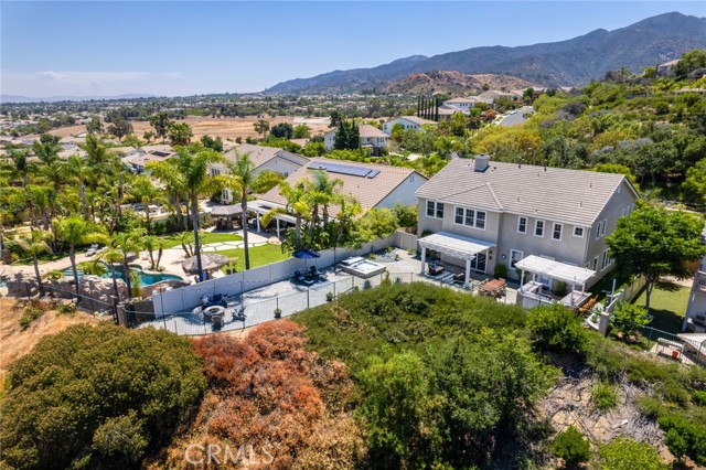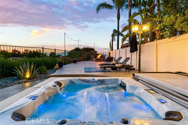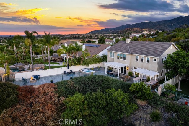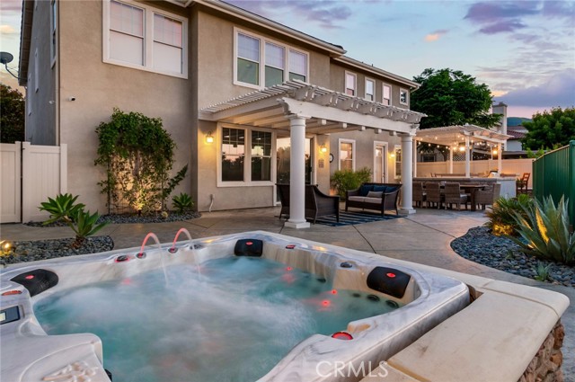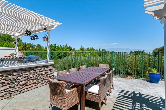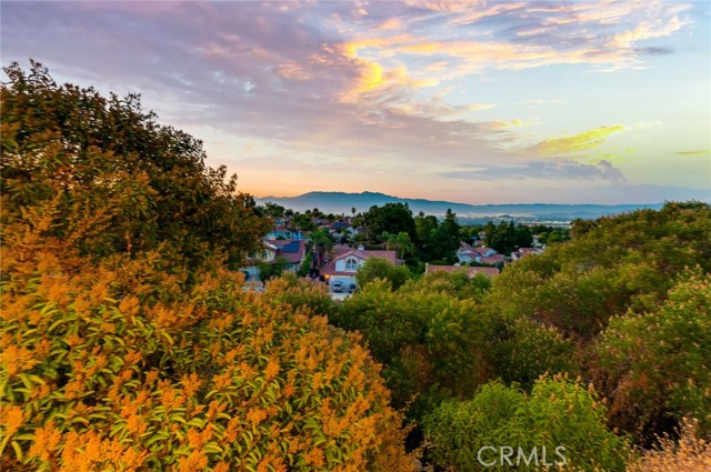 Welcome to your private sanctuary nestled in the single loaded streets of the Hidden Crest neighborhood. Indulge in breathtaking views across the back of the home, which offer night views of the city and the mountains by day. The backyard is an oasis that was thoughtfully designed to help you enjoy all of the different areas. You can immerse yourself in the relaxation of your private hot tub, complete with a lounger, LED lighting and a water feature. Or, as the sun sets, enjoy the enchanting glow of the fire pit that invites you to share the warmth as a cozy gathering spot. For those who relish the art of grilling, the lattice covered BBQ is showcased by 3-sides of concrete workspace and feature a 36-inch grill, side burner, storage areas, a built-in fridge and seating for 6 at the high-top bar. This BBQ area is well-equipped and will surely be a hub for all your outdoor gatherings. The side yard features low maintenance artificial turf where you can relax and enjoy a game of corn hole. As you enter the home you are welcomed by 19-foot vaulted ceilings and a grand two-sided staircase. The front of the home offers a downstairs bedroom currently being shown as a den with a custom built-in bench seat, wainscoting, wine bar, and brick decor. The dining room is filtered by shutters that open to the formal living room or can be closed to create a more private dining experience. The back of the home delights with a large family room with brick fireplace that opens into the spacious kitchen and breakfast nook. This kitchen offers raised panel solid maple cabinets, pullout shelving, farm sink with touch faucet, stainless appliances, which include a brand-new microwave and double convection oven. The back entry features an oversized two door closet off the three car tandem garage. Upstairs you will find a 400 sq foot master that has a commanding view out the back and features hardwood floors, a remodeled master en suite with a large custom walk-in closet and an oversized shower. In the front you will find a tranquil guest en suite with built-in closet organizer and a private balcony with views of the Cleveland National Forest. The central upstairs laundry is on the way to two additional bedrooms. The back bedroom is shown as an office, marble countertop, and custom shelving and has an amazing view. You will also find a library loft area, which can serve as a home office. This area is truly a hidden gem, with low taxes, & quick access for the commute to the O.C.