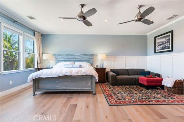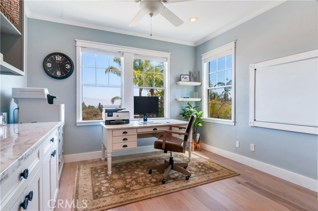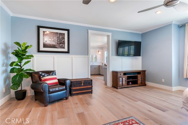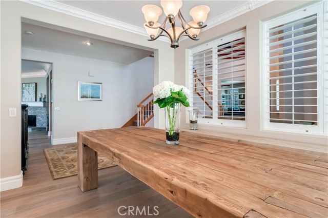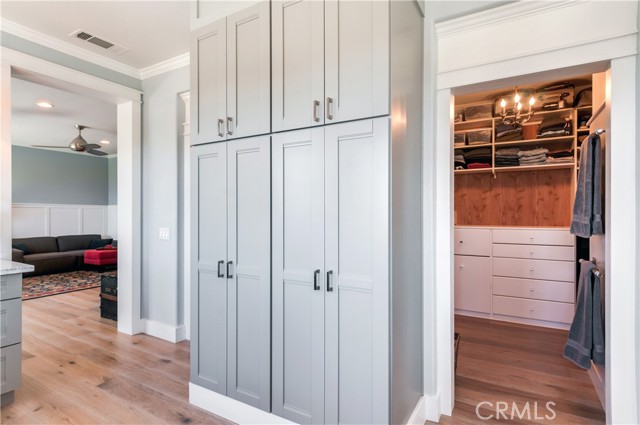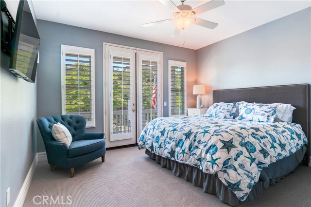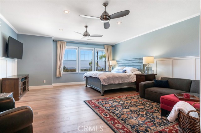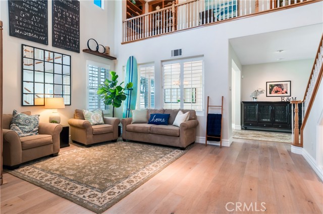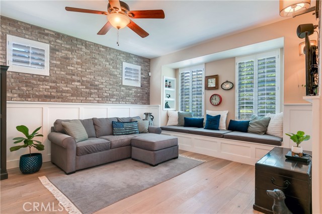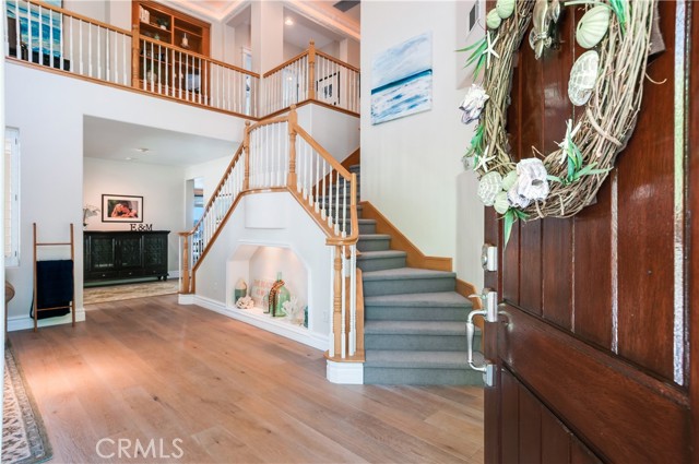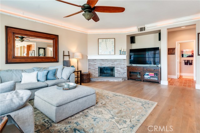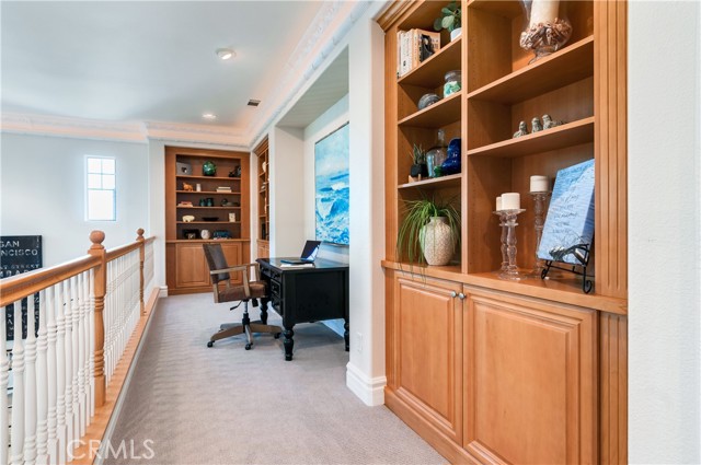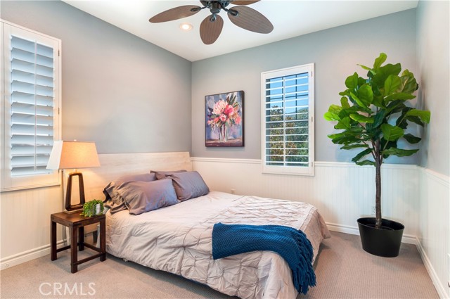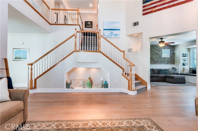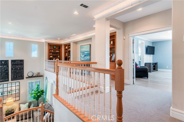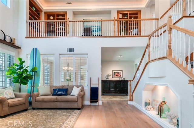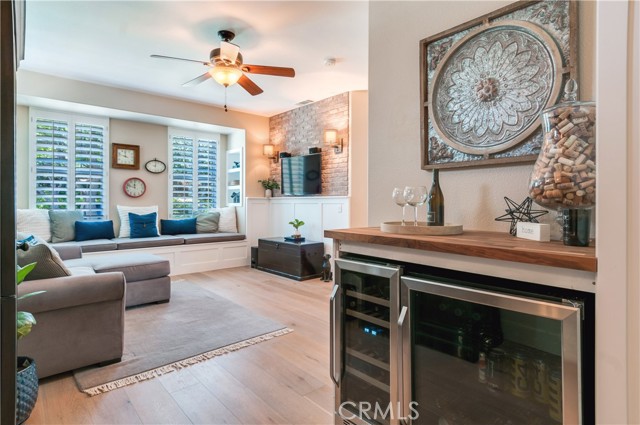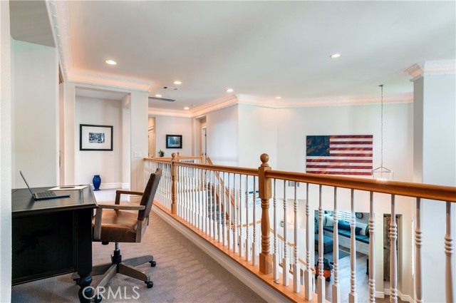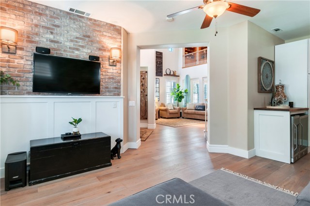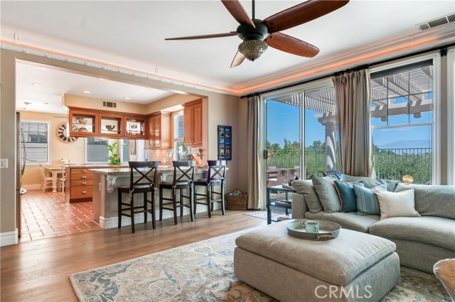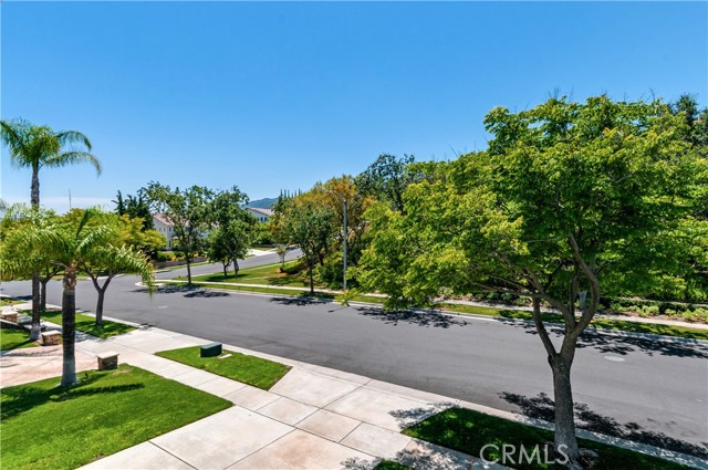 Welcome to your private sanctuary nestled in the single loaded streets of the Hidden Crest neighborhood. Indulge in breathtaking views across the back of the home, which offer night views of the city and the mountains by day. The backyard is an oasis that was thoughtfully designed to help you enjoy all of the different areas. You can immerse yourself in the relaxation of your private hot tub, complete with a lounger, LED lighting and a water feature. Or, as the sun sets, enjoy the enchanting glow of the fire pit that invites you to share the warmth as a cozy gathering spot. For those who relish the art of grilling, the lattice covered BBQ is showcased by 3-sides of concrete workspace and feature a 36-inch grill, side burner, storage areas, a built-in fridge and seating for 6 at the high-top bar. This BBQ area is well-equipped and will surely be a hub for all your outdoor gatherings. The side yard features low maintenance artificial turf where you can relax and enjoy a game of corn hole. As you enter the home you are welcomed by 19-foot vaulted ceilings and a grand two-sided staircase. The front of the home offers a downstairs bedroom currently being shown as a den with a custom built-in bench seat, wainscoting, wine bar, and brick decor. The dining room is filtered by shutters that open to the formal living room or can be closed to create a more private dining experience. The back of the home delights with a large family room with brick fireplace that opens into the spacious kitchen and breakfast nook. This kitchen offers raised panel solid maple cabinets, pullout shelving, farm sink with touch faucet, stainless appliances, which include a brand-new microwave and double convection oven. The back entry features an oversized two door closet off the three car tandem garage. Upstairs you will find a 400 sq foot master that has a commanding view out the back and features hardwood floors, a remodeled master en suite with a large custom walk-in closet and an oversized shower. In the front you will find a tranquil guest en suite with built-in closet organizer and a private balcony with views of the Cleveland National Forest. The central upstairs laundry is on the way to two additional bedrooms. The back bedroom is shown as an office, marble countertop, and custom shelving and has an amazing view. You will also find a library loft area, which can serve as a home office. This area is truly a hidden gem, with low taxes, & quick access for the commute to the O.C.
